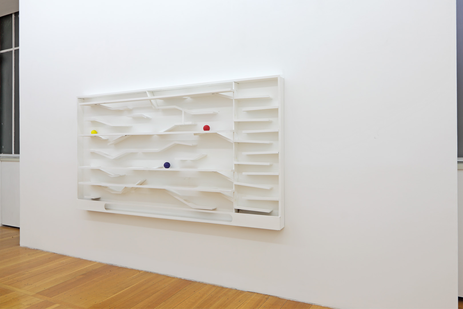 Similar to his colleagues at GRAV, and in step with the participatory utopia of the time, Stein quickly moved beyond the experimental field of the “art-eye relationship” to invent forms that the spectators could interact with directly. Called to touch and manipulate, the spectator was now in contact with fun forms which he had to operate: kaleidoscopes and landscapes covered in mirrors that multiply reflections of hanging globes, transformable objects and mirrors, machines for deformation and anamorphosis, etc. Similar to the Boulier (1965), the majority of objects were part of the famous Labyrinthes that GRAV members reproduced on several occasions over their years of activity. In this highly fun and participatory environment, the group aimed to achieve the noblest of political and societal goals: the advent of a new democratic public in the communicative euphoria of game and play. Joël Stein is the principal theoretician of this new homo ludens: “In play, we completely engage the adult or child spectator – whether ignorant of educated, it matters not – a situation is created and draws attention that doesn’t rely on knowledge but on surprise, movement, and provocation.”
