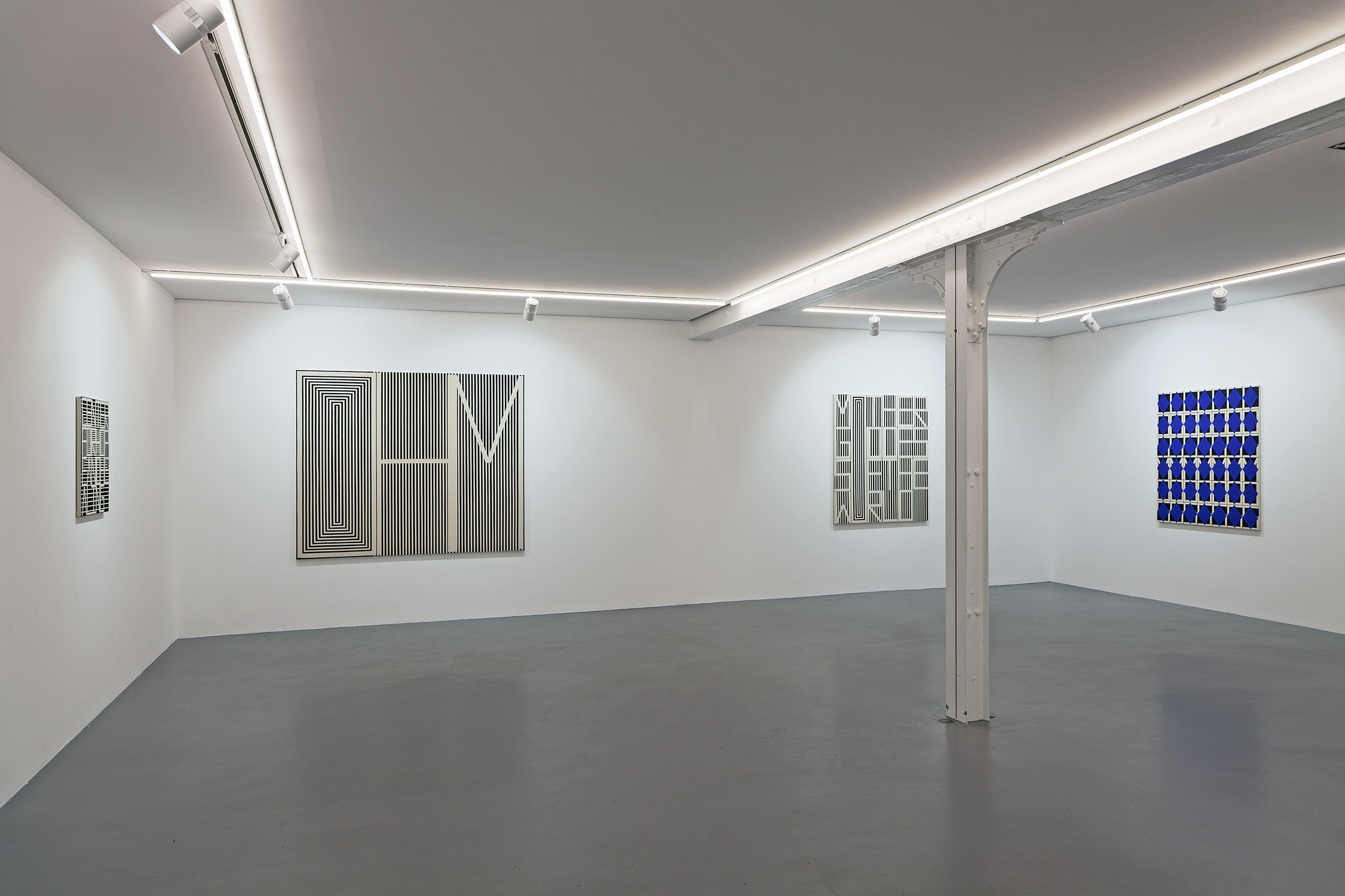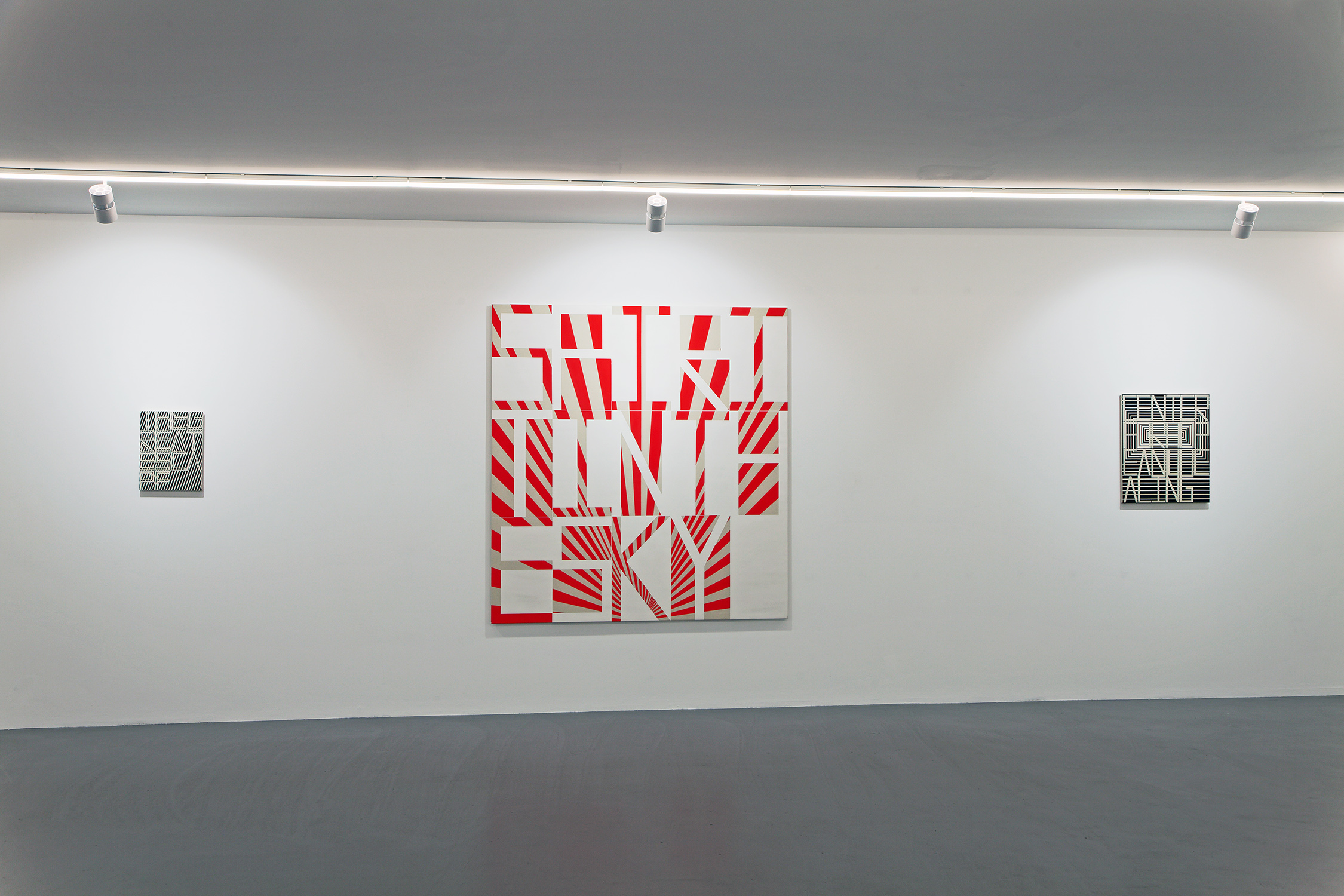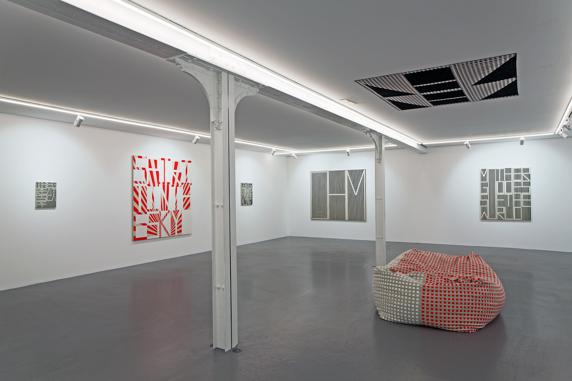 These cosmic pilgrims of the postwar American West, and the vast landscapes they relentlessly crisscrossed, may seem far removed from John Phillip Abbott’s canvases, which present a highly conceptualized painting practice that engages the legacy of radical abstraction (Simon Hantaï, Martin Barré, Sam Gilliam) and the distinct but equally conceptual mode of text-based painting (Christopher Wool, Ed Ruscha, Kay Rosen). Abbott further complicates his work by combining two disparate techniques: on one and the same painting he applies spray paint onto raw canvas and uses tape to create hard-edge geometric shapes, thus moving from the disembodied to the concrete. The resulting compositions, imbedded with letters and words, pulsating with a mad circuitry (this show includes a painting titled Large Ohm) of pyramids, nested rectangles and lattice-like grids, inhabit a space somewhere between the conceptual geometry of early LeWitt and Bochner, and the quasi-psychedelic optics of Richard Anuszkiewicz and Bridget Riley. In some of his paintings Abbott inserts wavering dots of sprayed color that suggest the viewer is about to suffer a temporary loss of consciousness. The result is, as Catherine Millet aptly put it in her text for Abbott’s 2020 Xippas exhibition, an “instability of the surface.”