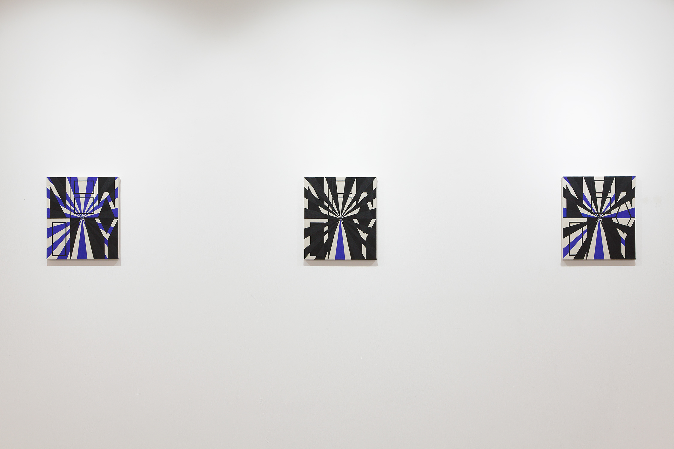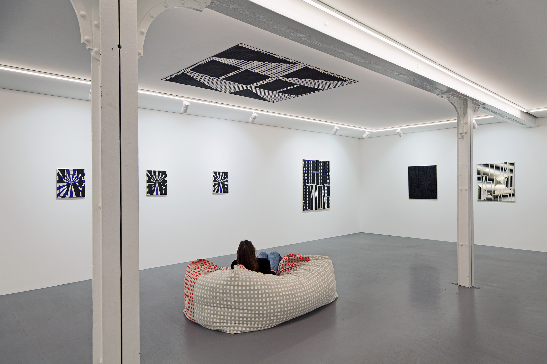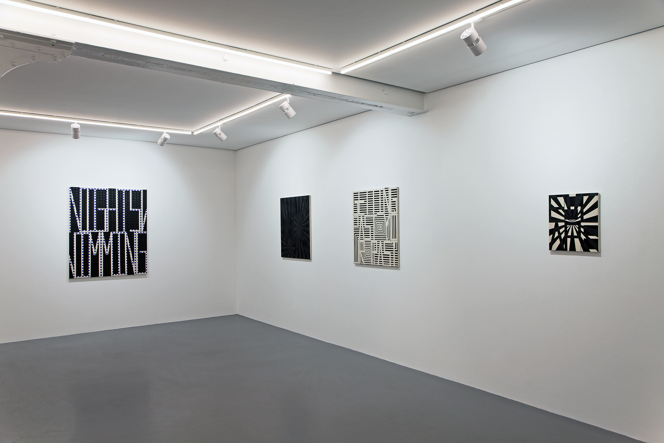 These cosmic pilgrims of the postwar American West, and the vast landscapes they relentlessly crisscrossed, may seem far removed from John Phillip Abbott’s canvases, which present a highly conceptualized painting practice that engages the legacy of radical abstraction (Simon Hantaï, Martin Barré, Sam Gilliam) and the distinct but equally conceptual mode of text-based painting (Christopher Wool, Ed Ruscha, Kay Rosen). Abbott further complicates his work by combining two disparate techniques: on one and the same painting he applies spray paint onto raw canvas and uses tape to create hard-edge geometric shapes, thus moving from the disembodied to the concrete. The resulting compositions, imbedded with letters and words, pulsating with a mad circuitry (this show includes a painting titled Large Ohm) of pyramids, nested rectangles and lattice-like grids, inhabit a space somewhere between the conceptual geometry of early LeWitt and Bochner, and the quasi-psychedelic optics of Richard Anuszkiewicz and Bridget Riley. In some of his paintings Abbott inserts wavering dots of sprayed color that suggest the viewer is about to suffer a temporary loss of consciousness. The result is, as Catherine Millet aptly put it in her text for Abbott’s 2020 Xippas exhibition, an “instability of the surface.”