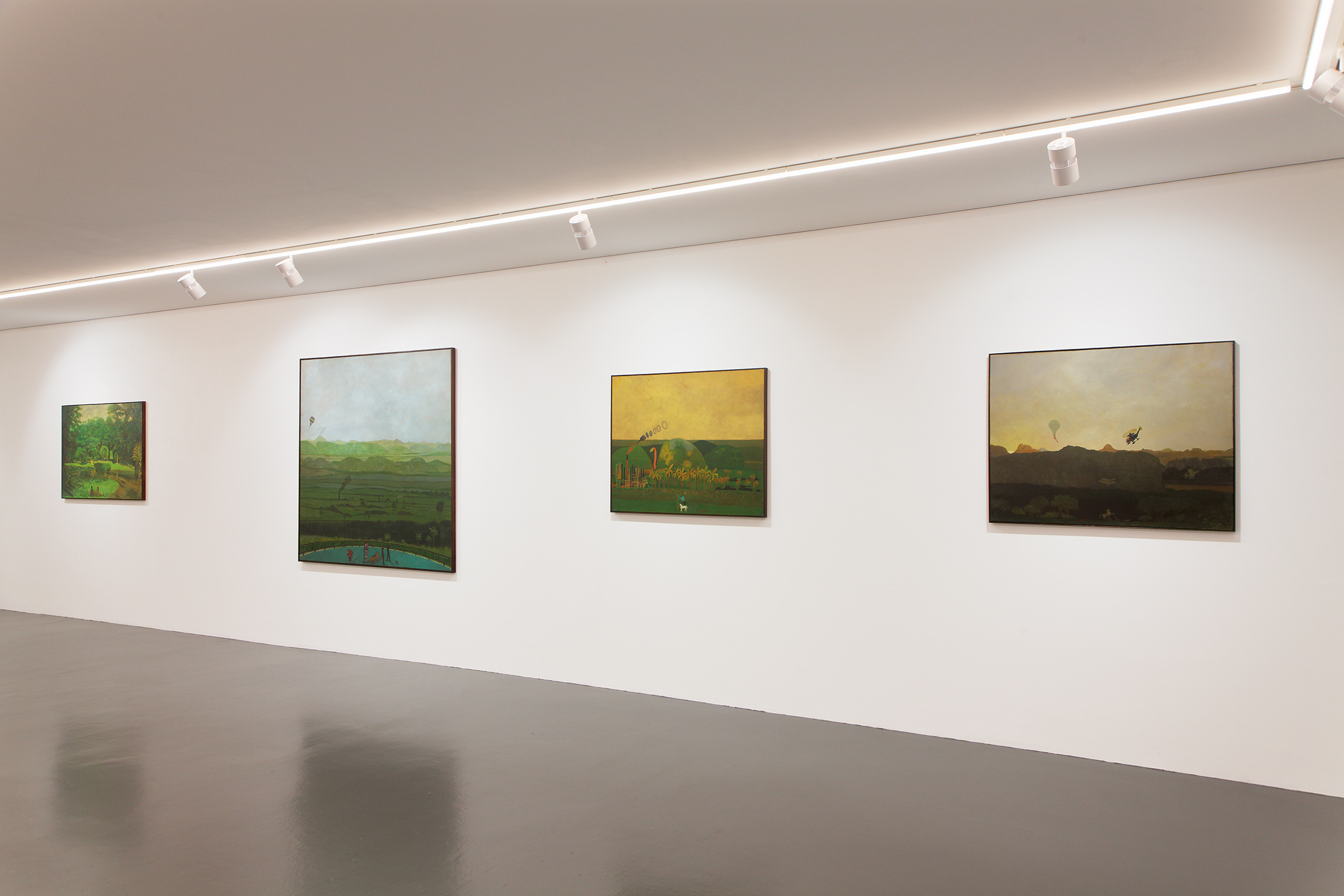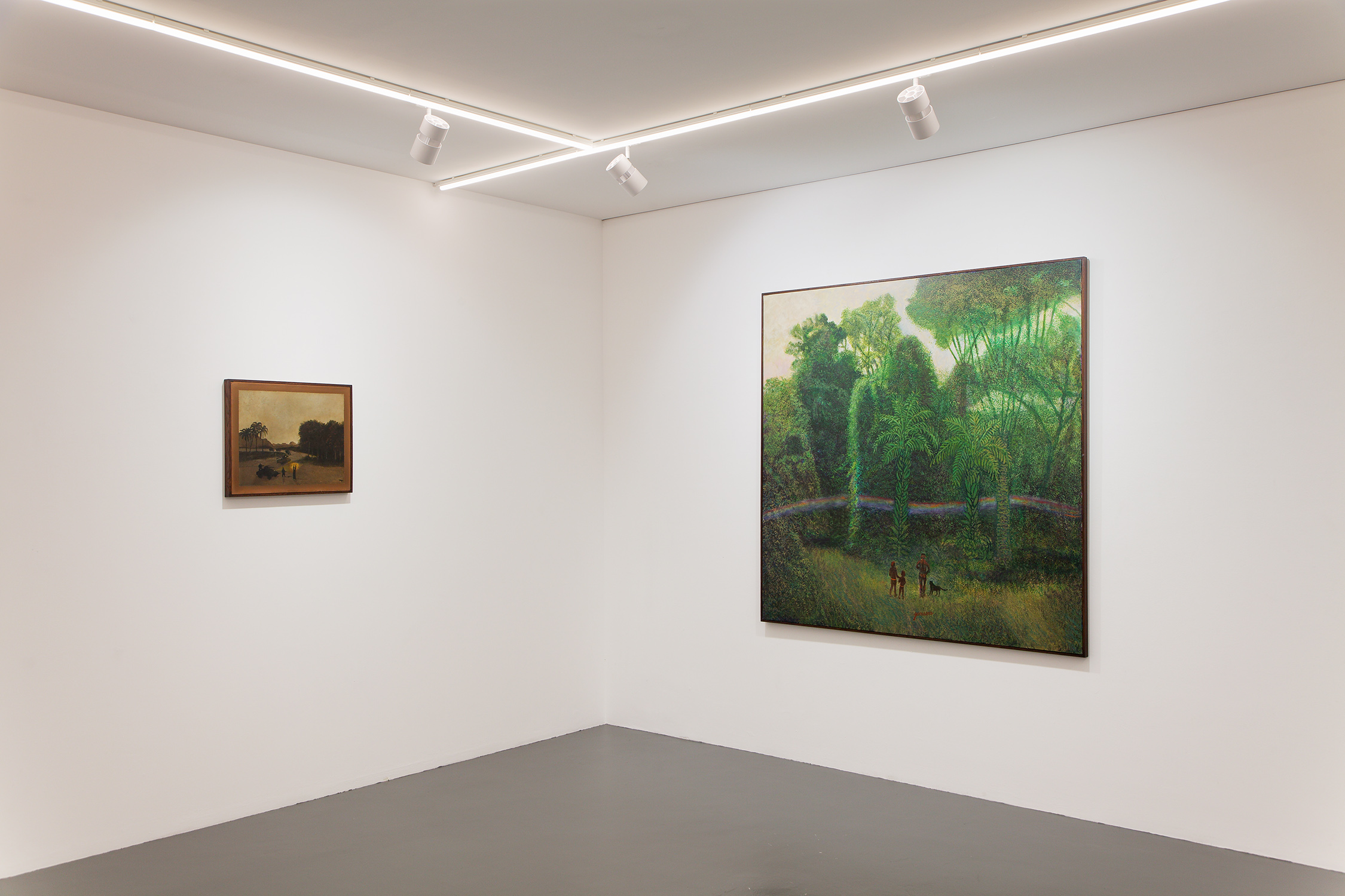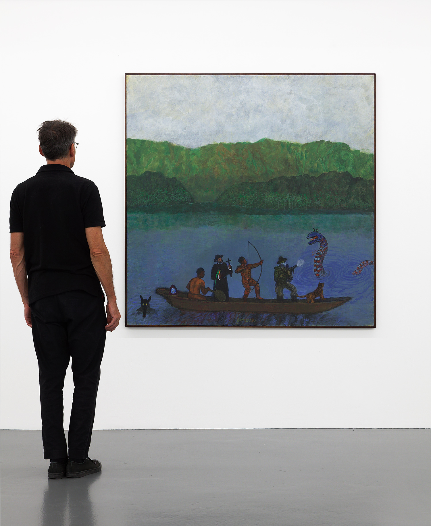 In José Gamarra’s painting El progreso de una ayuda (The Progress of an Aid) dating from 1969, we see a US Air Force bomber plane dropping a multitude of objects related to the war industry onto an exotic tropical landscape. The title of the painting, charged with cynicism and irony, defines its narrative tone: American foreign policy cannot dissociate progress from war. Likewise, in the work Amigos from 2021, a fairly recent work included in the exhibition, we observe, within a sumptuous representation of the jungle, three main figures: an animal, a human and a mythological being, and two creatures observing them. In both works the jungle is the scenery and the space where a story unfolds. In the first painting, we observe the witness and the victim of an imperialist policy, in the second, the only possible space where these beings, real and imaginary, can coexist: “The law of the jungle” and “The Jungle Book”.