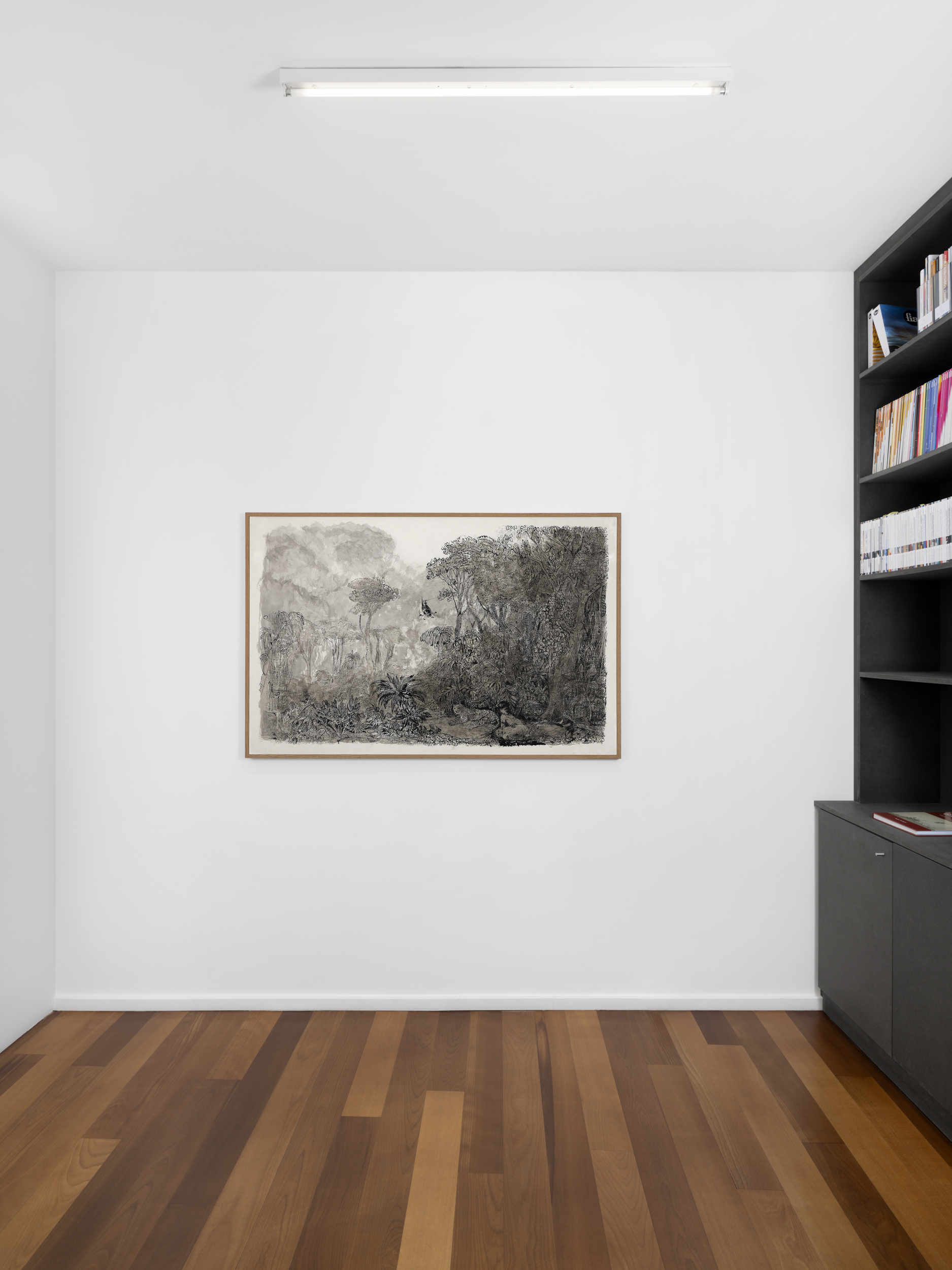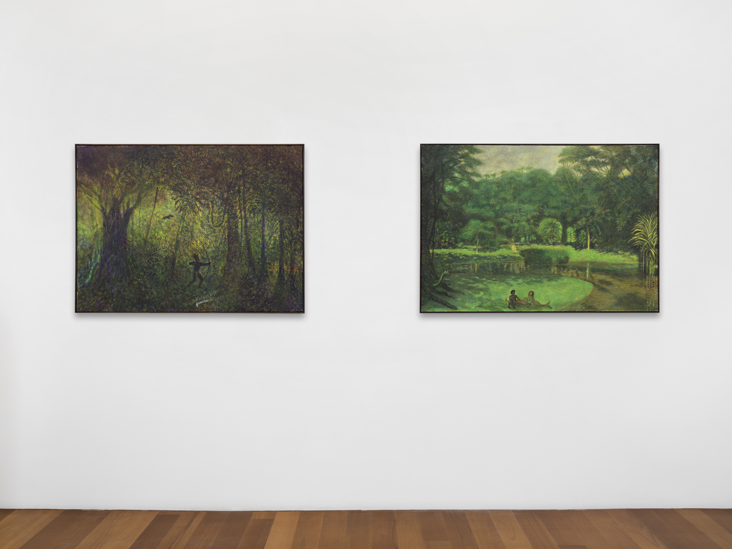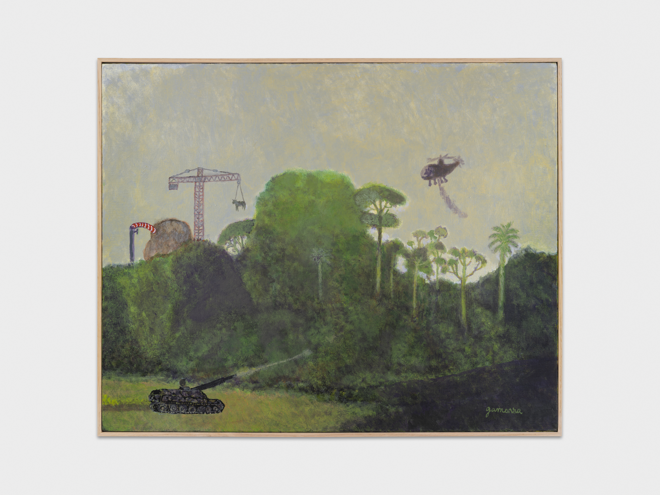 In this infinite and mysterious setting, the artist presents unusual stories where diverse characters from different cultures and historical moments coexist and interact: The Pope and Superman, the Spanish conquistadors of America and mythological animals, or the Yanomami and American sailors. The jungle landscape witnesses and suffers all these conflicts and stands as an ontological space of resistance and resilience perhaps the last possible one.