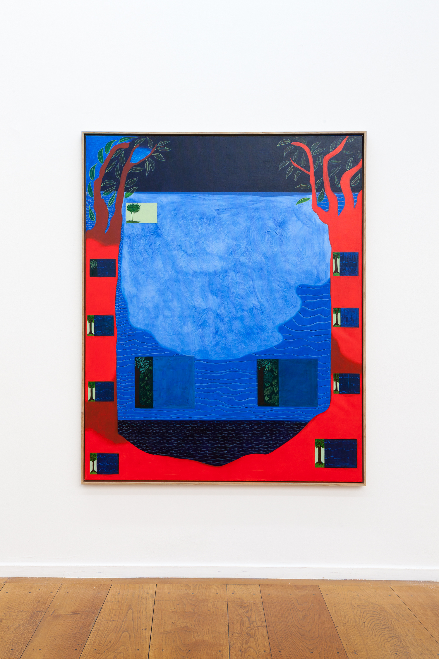 Although the images tell different stories, some narratives reappear and seem interconnected. To the narrative of a forest and the ideas of growth and rebirth, eloquent in her previous exhibition with Xippas Paris (“Ancestors”), the artist adds the narrative of the ‘ocean’: a source of life and vitality, enabling introspection – an inner travelling towards the most profound layer of the self. The ‘Ocean’ also implies the idea of a distant land and that of a journey, physical or spiritual, through space and time. It carries us away, while allowing us to stay connected as we maintain the capacity of looking back. In this sense, the ocean conveys a feeling of being “in between” and functions as a portal. Other narratives mobilized are that of ‘frames’ (“This Forest: Anthills”, “Hearing: Listening well one found solace”), ‘stages’ (“Ocean Words”, “Depth to recognize”) and ultimately – ‘theater’, and the desire to be involved, to call for action. Images therefore become places of action and engage in movement. Action unfolds inside the frame and the pictorial space fills with spirits (“Hungry Ghosts: Movement Through a Forest”), liquids (“Landscape witness”) and phantoms of thoughts (“Portals-3”).