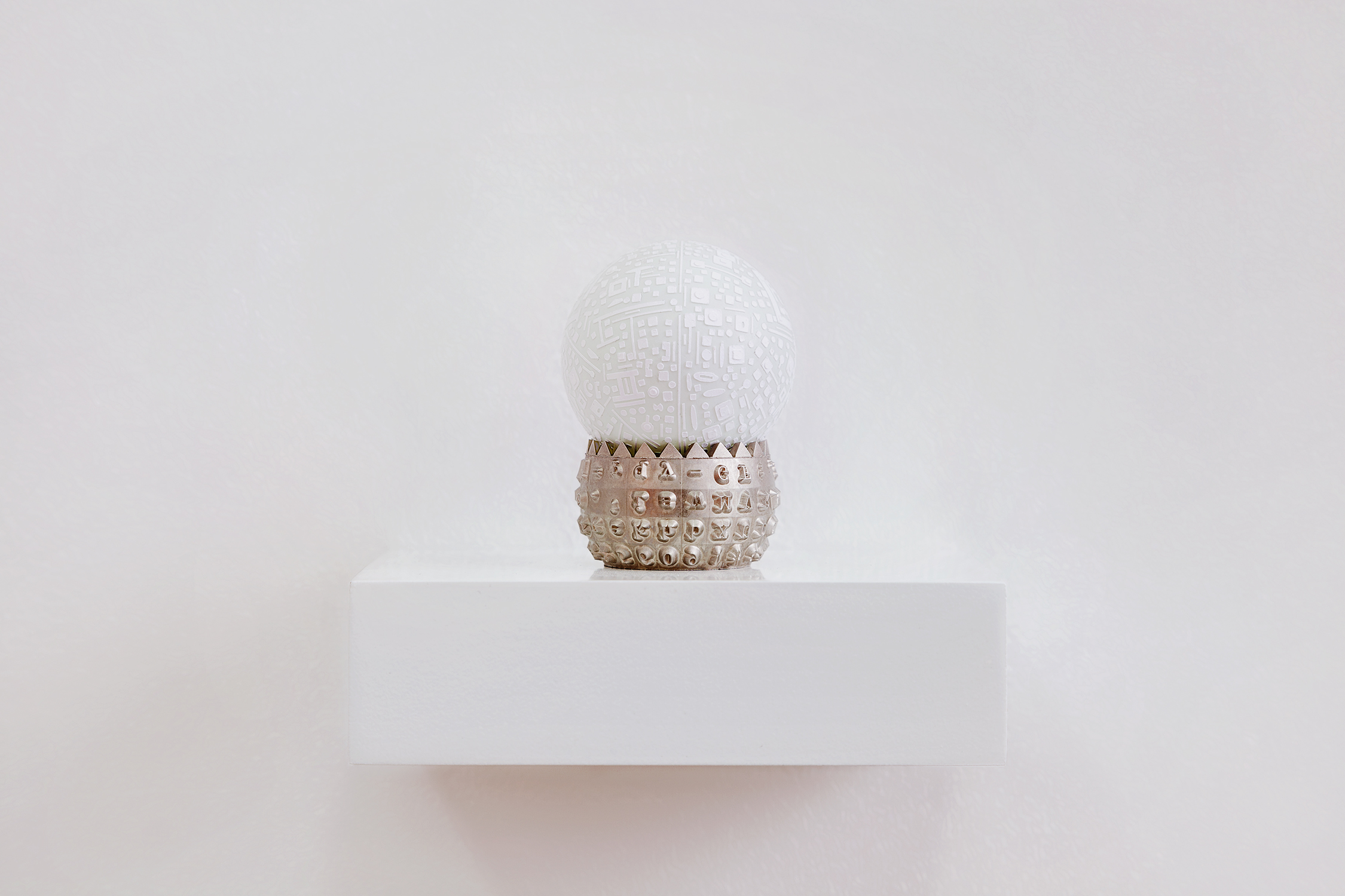 Detailing Selectric, 2020. IBM selectric ball on shelf, self adhesive alphabet on ping pong ball, 10 x 10,5 x 8 cm -