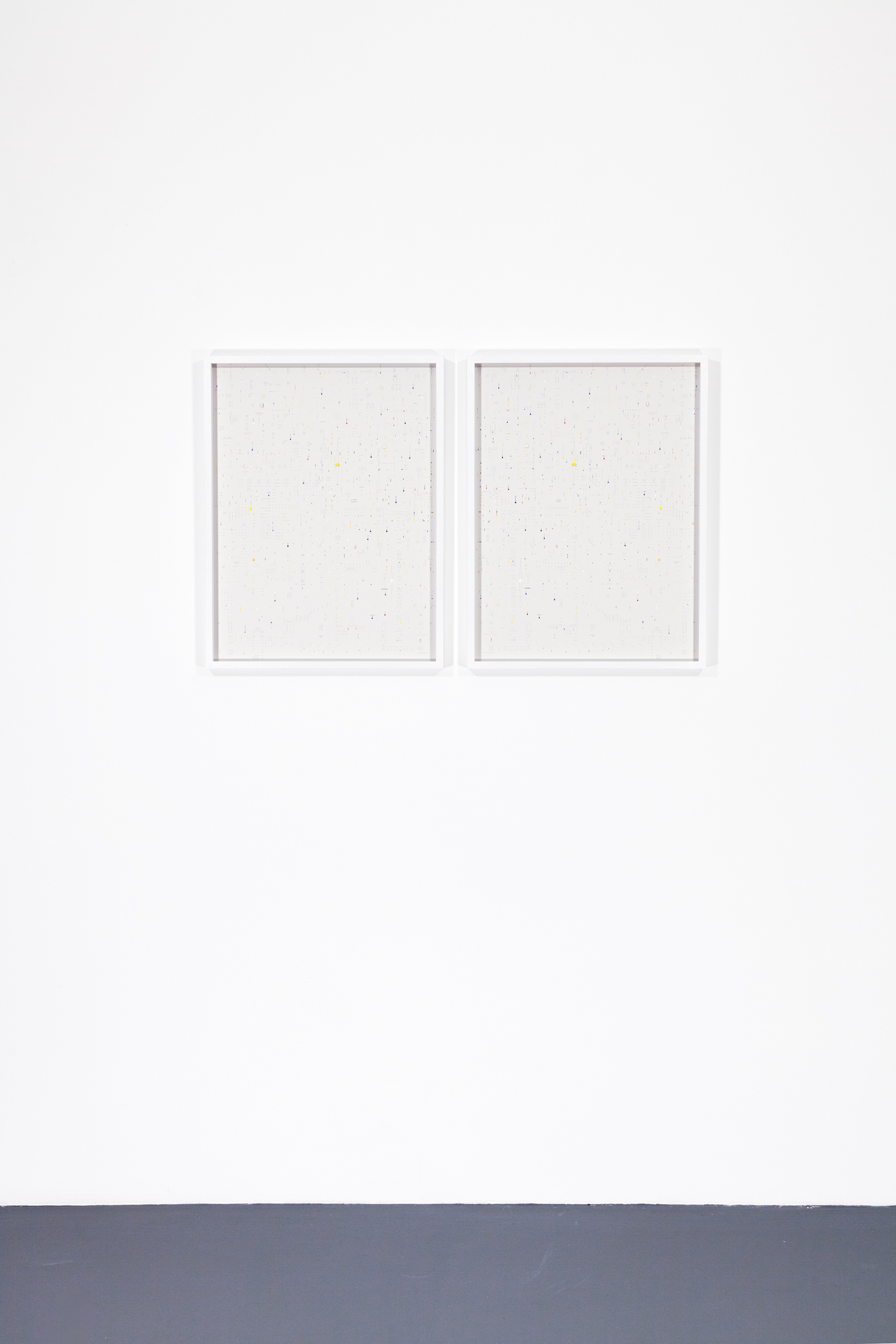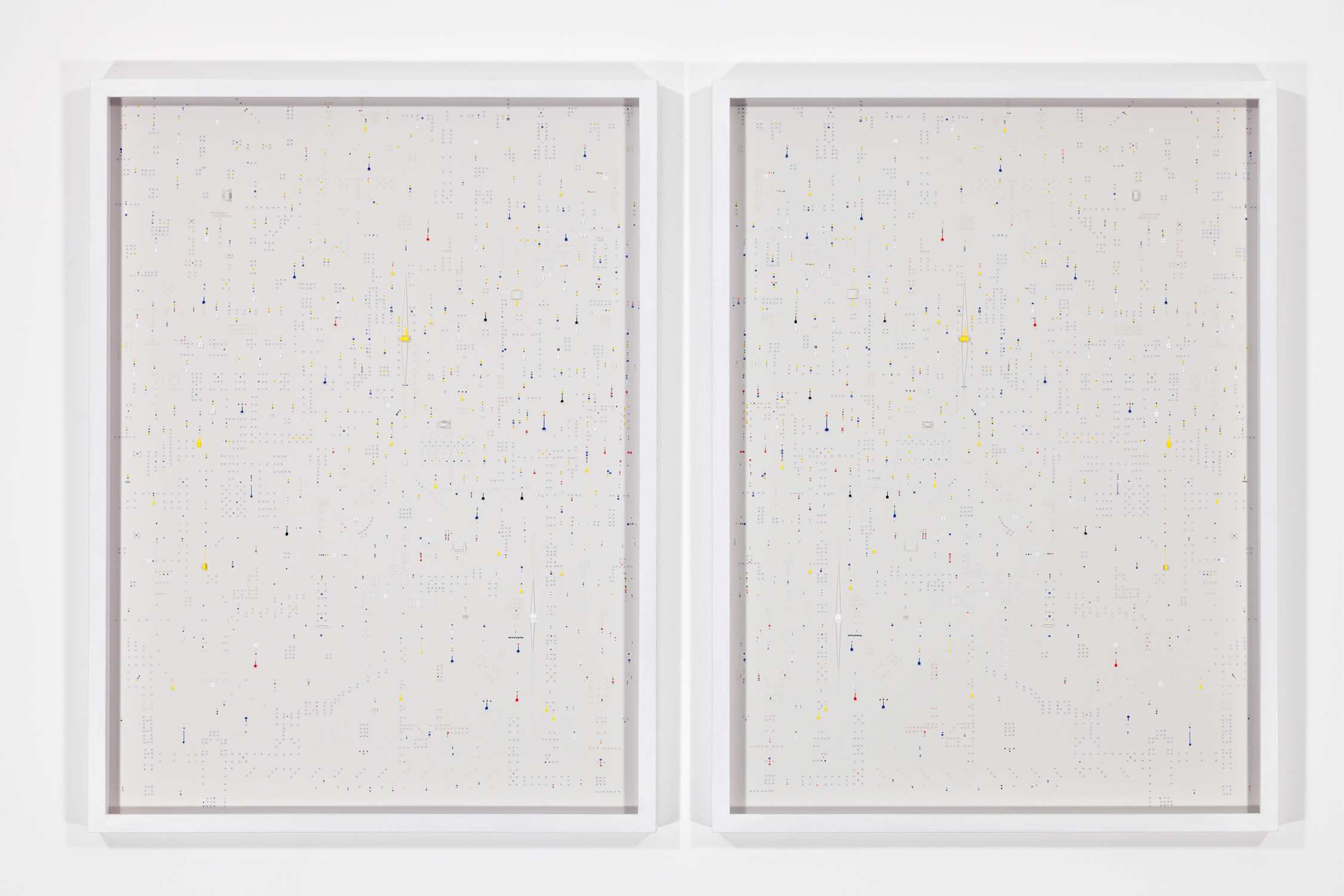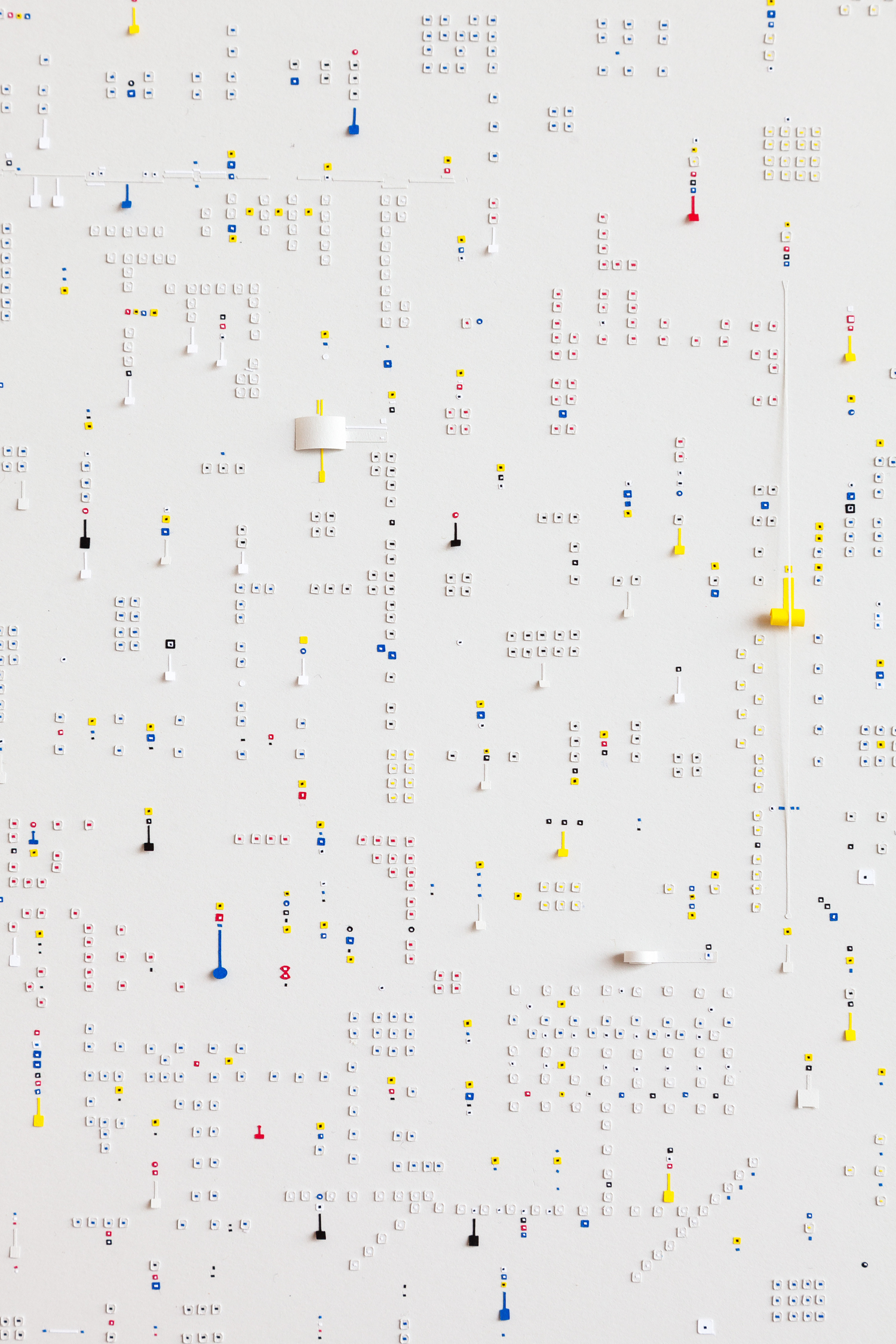 The result of his analogue and meticulous craft is both cryptic and mesmerising. On a formal level, by engraving shapes or cutting them out, the artist adds a third dimension to his drawings and composes as a sculptor would, using light, shade as well as negative and positive space. On a semantic level, with a detailed grammar, Marco Maggi depicts a world driven by minute elements. However, although the greater picture of his works seems to reveal systemic patterns or comprehensive plans (reminiscent of models for electrical circuits, IT architecture or urban maps) Maggi’s bottom-up vision of our world is one that resists notions of order and predictability. His details are seen as