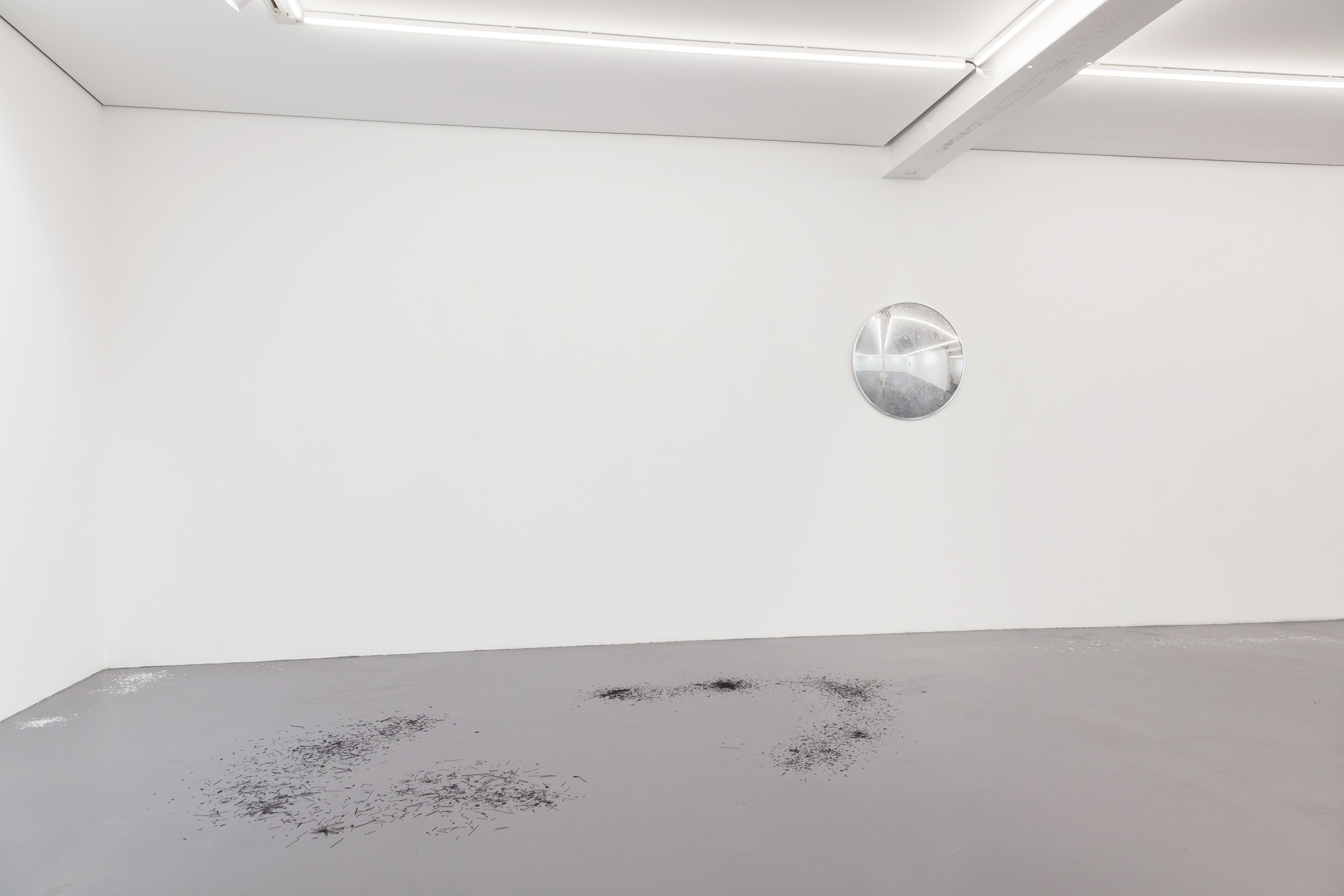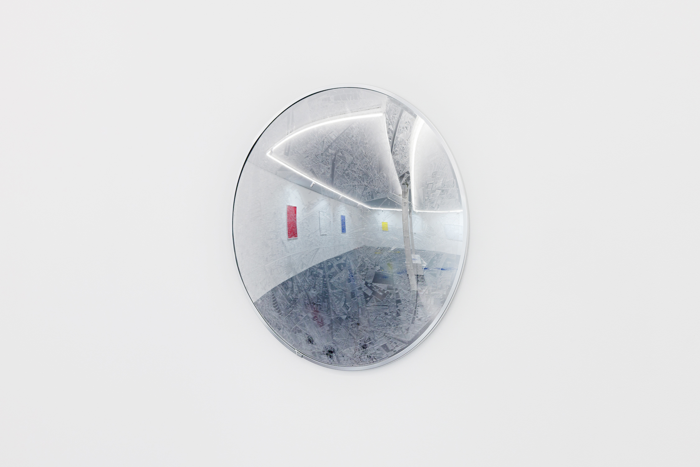 There lies the singularity of Marco Maggi’s work who playfully revisits the history of abstraction while taking a critical look at our societies, obsessed with the mastery of details. In this sense, Detailing your Portrait, which reflects the exhibition room on its convex surface like a safety mirror, could serve as a warning: omnipresent, details are the fundamental protagonists of our environment, but their actions always escape our attempts to control.