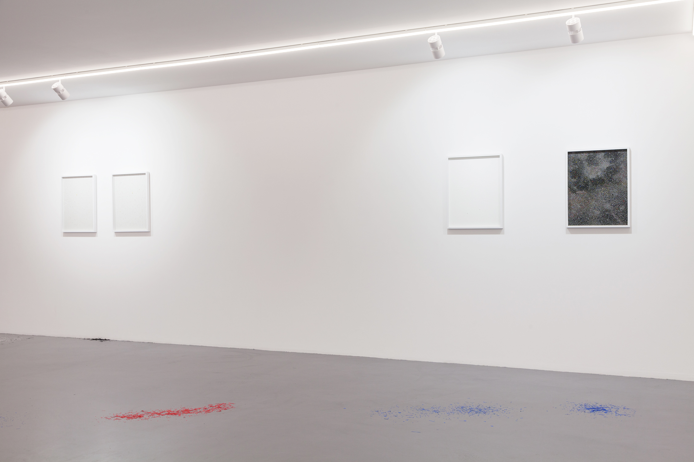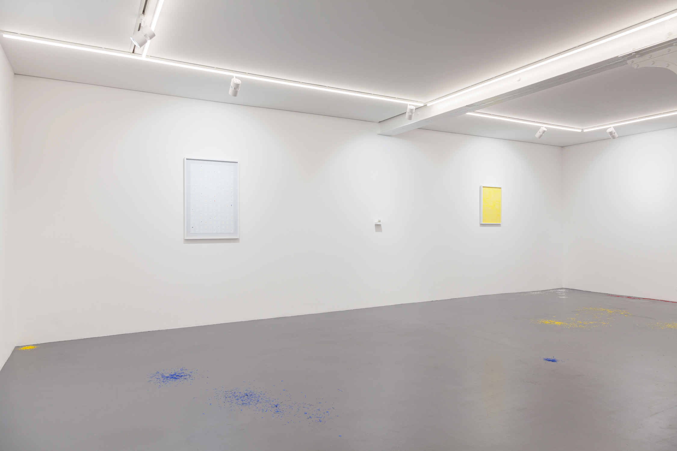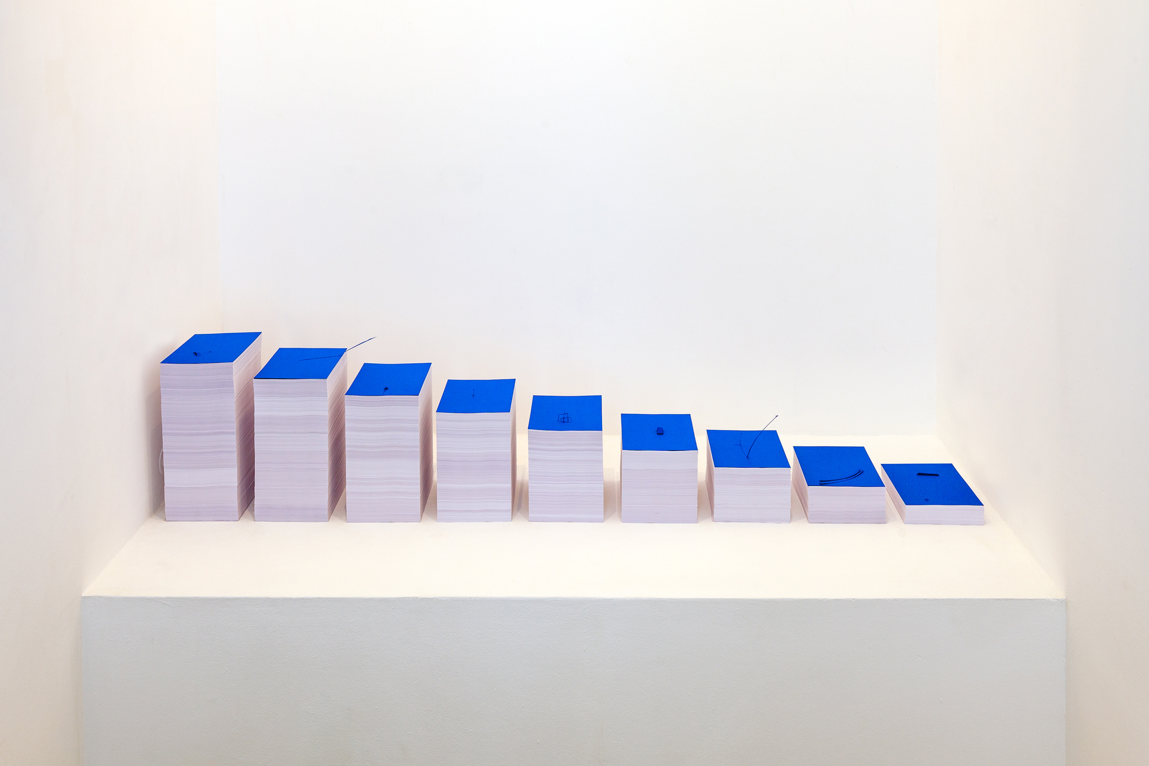 The two floor installations illustrate this idea. The first one (Detailing Stairs) starts the exhibition in a dialogue with the entrance to the gallery. Made with reams of paper arranged in a staircase manner and cut-out on the surface, the installation presents details as structural elements contributing to the durability of an architecture. This notion of immobility and sustainability is then challenged by the second installation (Mobile Quotes) located in the lower exhibition space. Composed of tiny pieces of coloured paper scattered on the floor, the installation is subject to the passage of visitors and favours the idea of movement and of ephemeral qualities. Its discovery is made by descending a staircase and looking to the ground, as if the visitor had to «zoom in» from a macro vision to a micro one in order to discover the contradiction between these two installations.