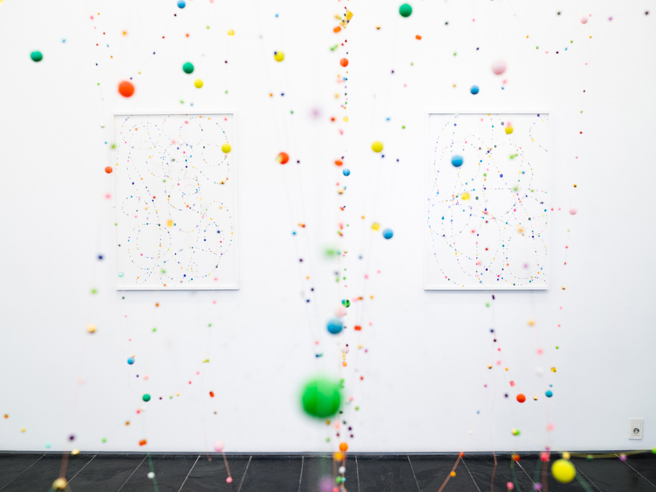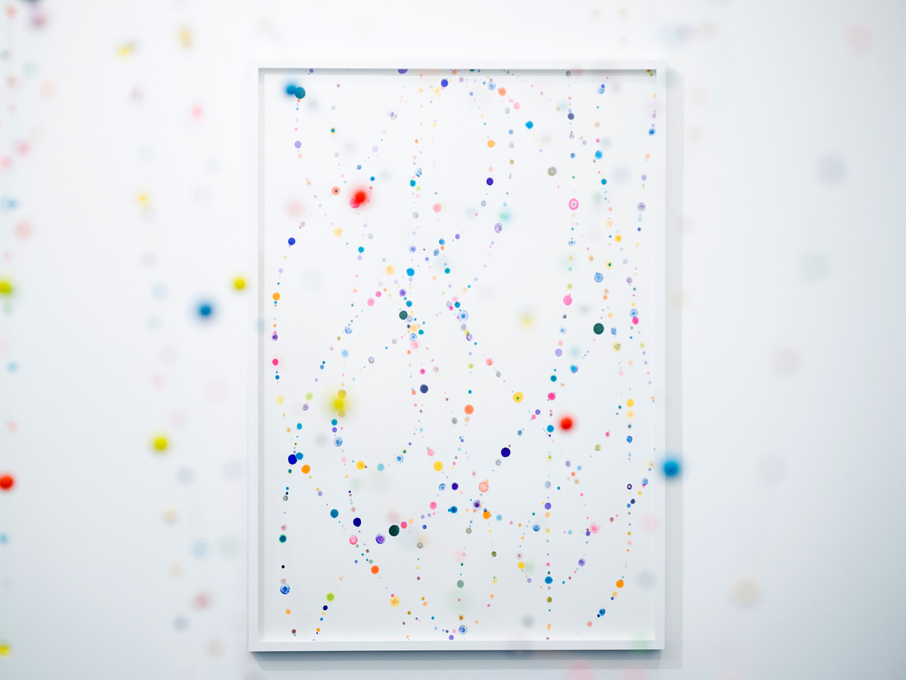 This exhibition –which evidences a match among the pieces– entails a series of drawings made by laying dots of ink on paper. The small circular and multi-colored points, just like pearls in their appearance, define a path for the viewer to follow. This seemingly labyrinthine track is, much to the contrary, a small and giddy circuit that the human eye is capable of going through, in an endless manner.
