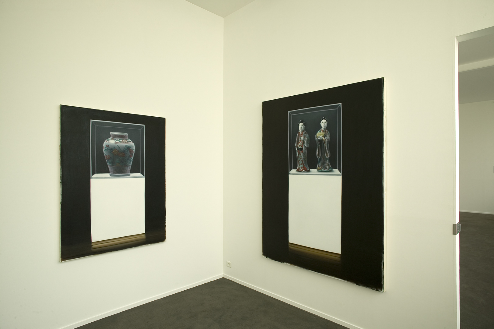 Lisa Milroy has a long-held fascination for Japan which she has visited many times and as such, her later paintings captured subjects born of this culture: copies of “Ukiyoe” (Japanese prints), food, objects, architecture and towns. She also painted brides and grooms in their traditional costume and masks, which allowed her to explore the transition between still life and the living. Although the formal aspect of these first portraits have disappeared, they prepared the ground for the most recent work.