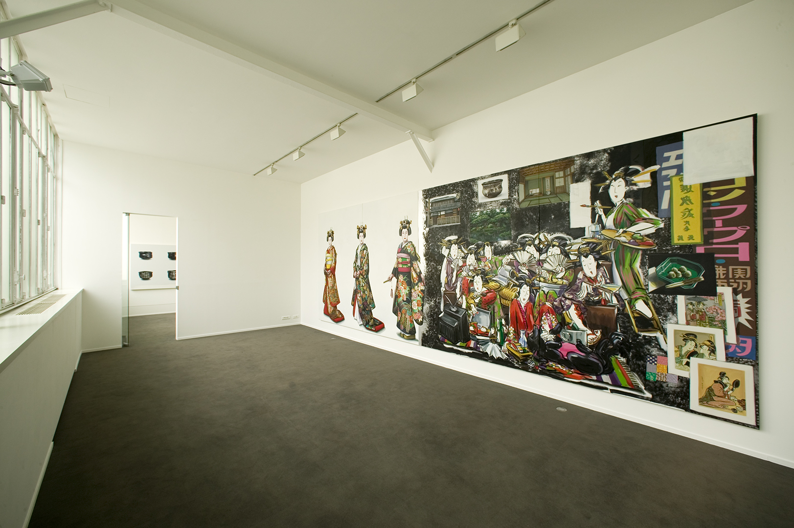 The first two parts are made up of three portraits of Geishas isolated on a neutral grey background, painted with detachment and reservation in order to render only appearances. These seem to advance little by little towards the right entering a new pictorial space showing a group of geishas engaged in their daily activities. Here the way of painting becomes very gestural, ironic, and opposes the objective representation of the left side. In exposing their feelings more than their appearance, these women exhibit their privacy. Milroy represents them as fundamentally independent. She paints them not as exotic subjects but renders them familiar. Milroy’s Geishas watch TV and eat pizza.