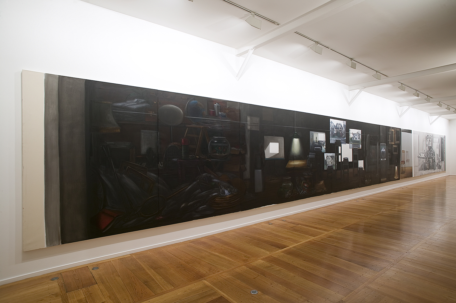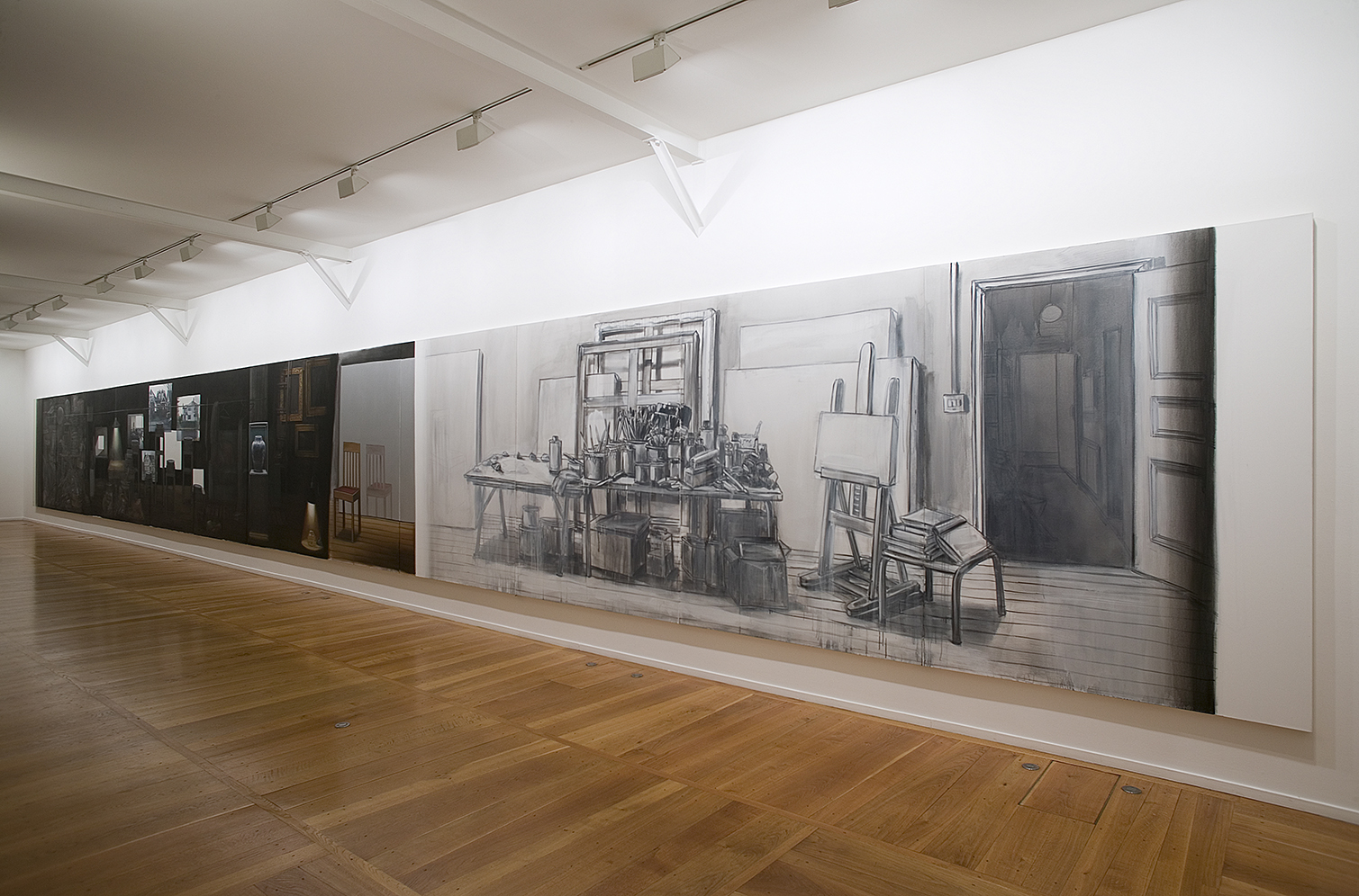For her second solo exhibition at the Galerie Xippas, Lisa Milroy presents a 12 polyptych panels, measuring almost 20 meters long. With this monumental piece of art, entitled « Black and White » particularly emblematic of her painting pleasure, Lisa Milroy invites the spectator to penetrate her workshop intimacy. The painting’s right side is a black and white representation of a classical workshop scene, with its paint brushes, its canvas, and so on…Then we go forwards – literally speaking, since the format is imposing movement – and the composition reveals in a metaphorical way, through the objects that are scattered in the space, the artist’s approach and the creation process of the work of art.