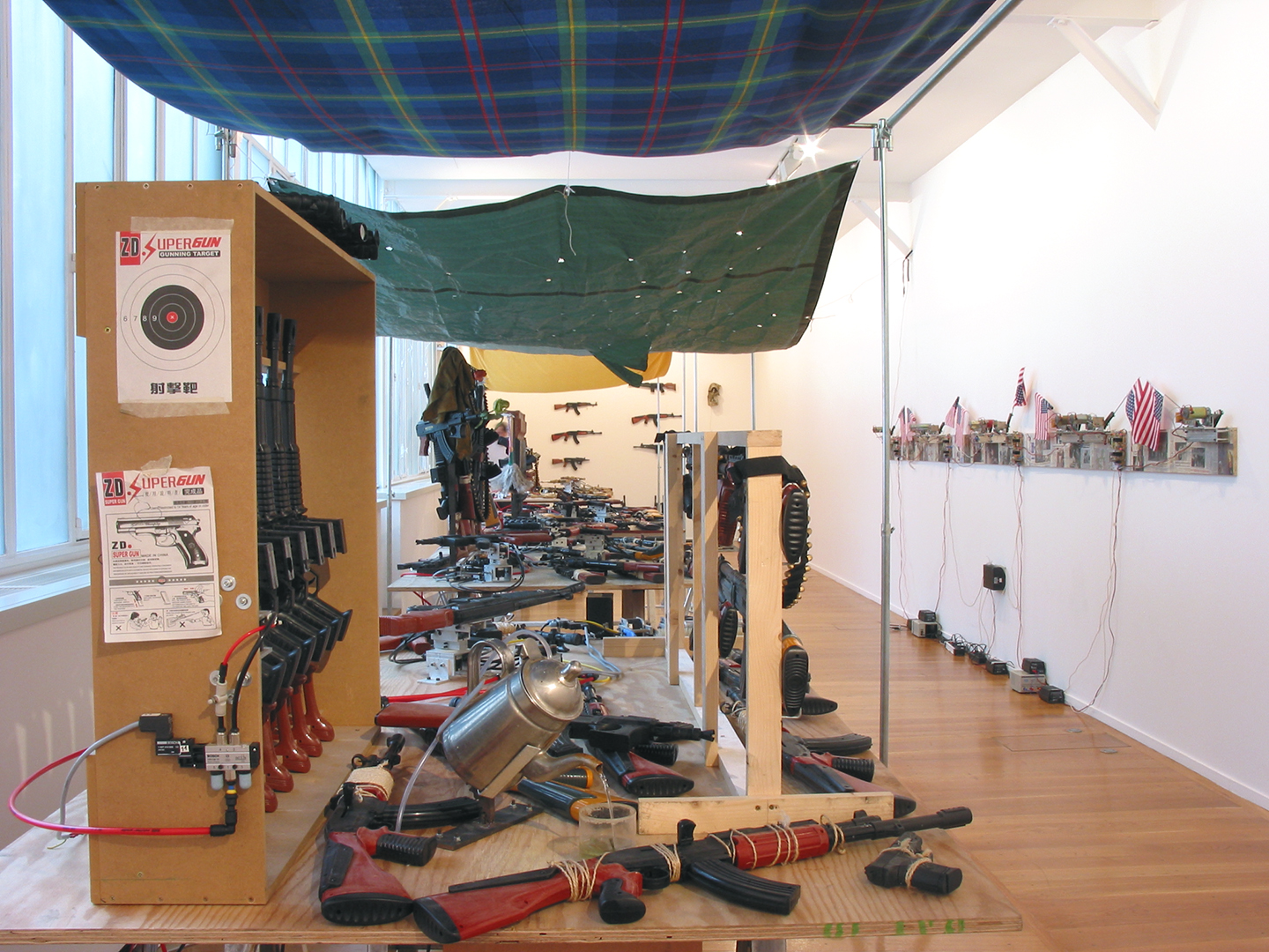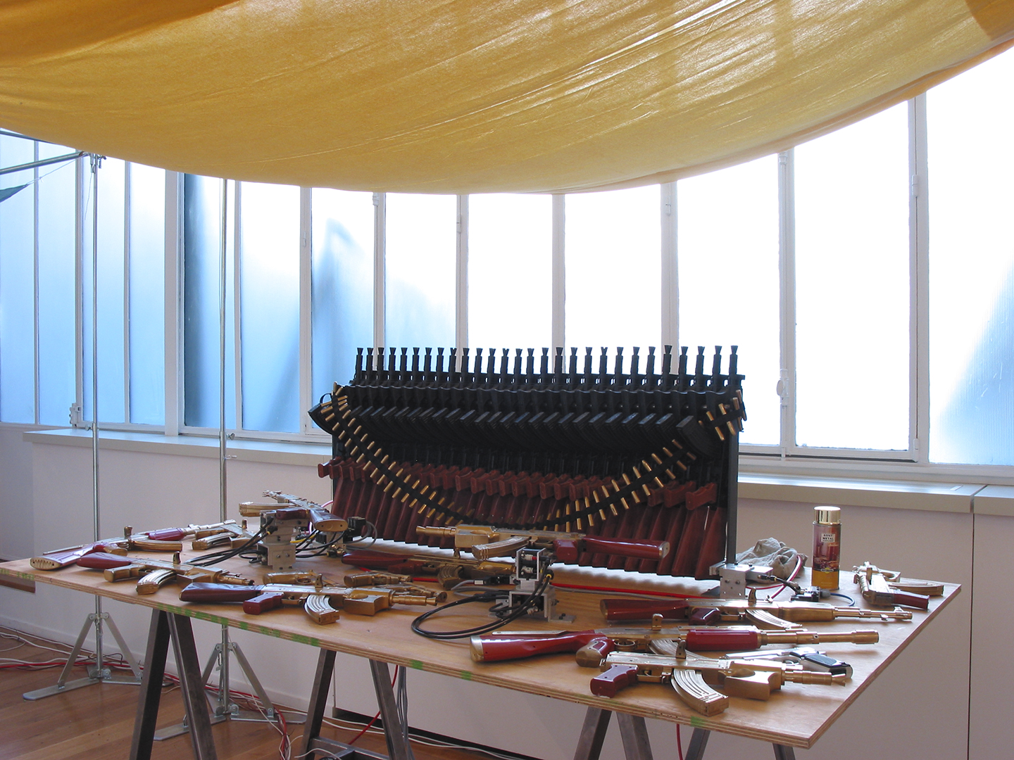 Nothing Domestic is a work about the issues of armament-attraction to violence, the trade commerce, innocent deaths and the cultural differences towards the use of arms. The work is composed of cables, motors, hydrolics, water, infra-red, wood, steel, plastic, gold paint, fabrics, press clippings, computer chips, everyday objects, mp3 players and sound equipment.