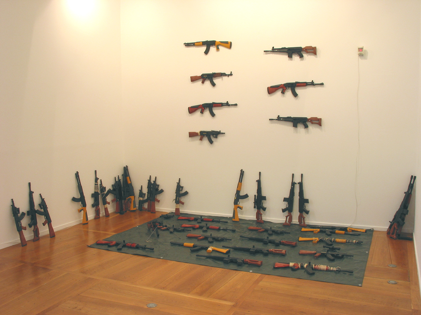Nothing Domestic is an installation of an arms market, made during the months before the US launched it’s war on Irak. Four large stands resembling a colourful market with toy copies of gun assemblages covering the tables, a presentation of the trafficking of the international arms trade. The stalls represent cultures of armament: Africa, the Middle East, USA, and Europe. Walking through the market, the public is asked to question it’s role as buyer and consummer.