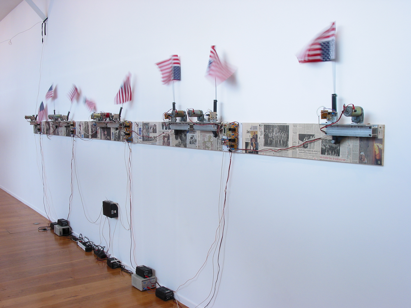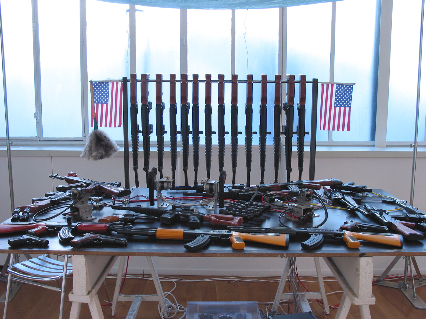 America needs war: From a backdrop of voices of dealers inviting visitors to buy arms to sounds of people saying «America needs war» and «America needs peace», US flags, representing crowds, wave and dance in rythym on an adjacent wall of the gallery. Some flags are presented up-side down to suggest public opinion against the war. Machine gun waltz: A ballet scene of machines moving to a Strauss waltz, an extract from the soundtrack of Stanley Kunbrick’s 2001: A Space Odyssey creates a contradictory atmosphere, where the machines are in control and man ‘s evolution is questioned. The Star Spangled Banner: Sounds of a voice chanting the national anthem, a tradition in American schoolrooms, changes to the «The Star Spangled Banner» by Jimi Hendrix illustrating the irony in blind patriotism. Free-style machine gun: A choreography of air sounds create an acoustical composition, transforming the shooting market into a musical experience.