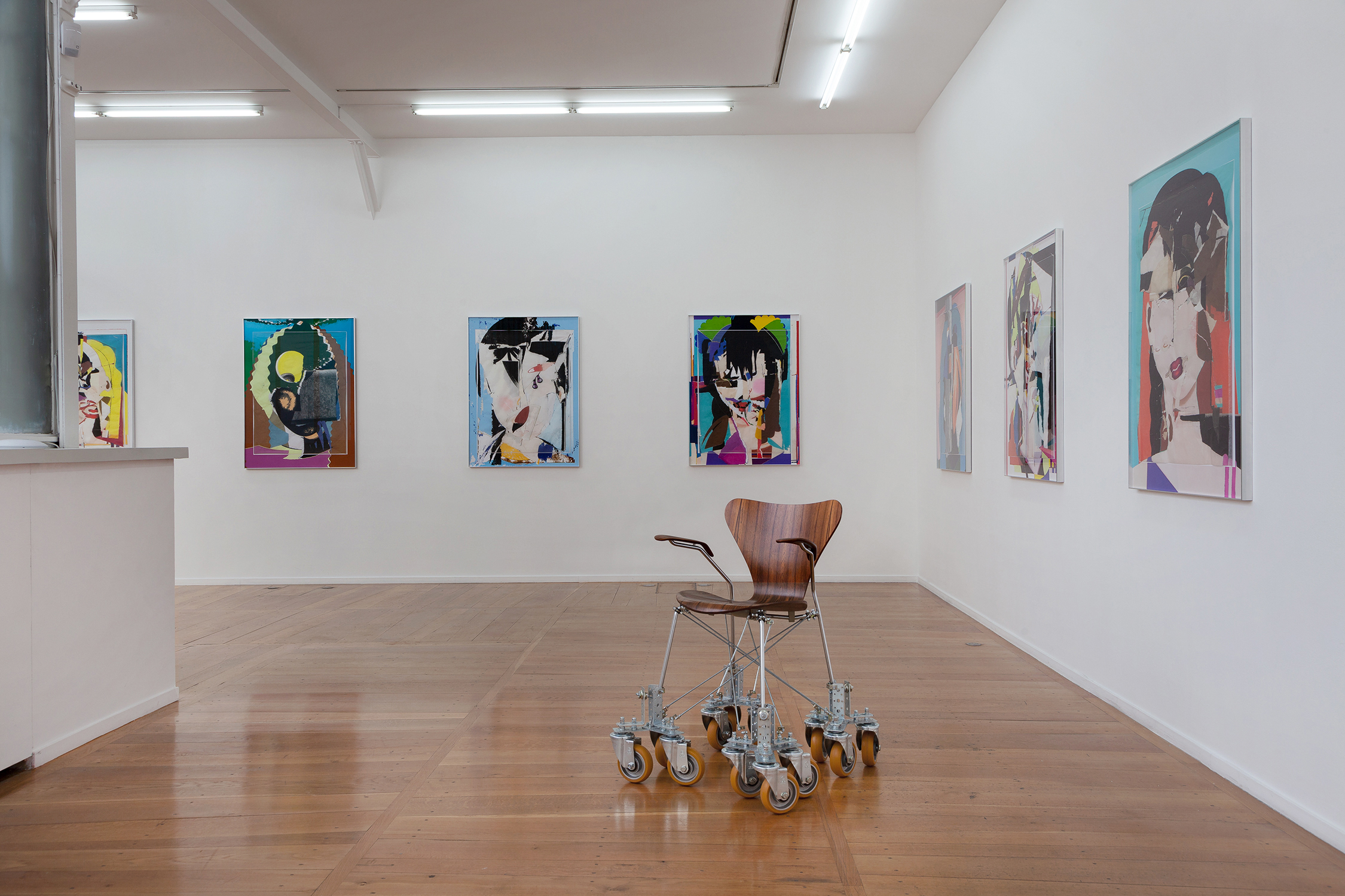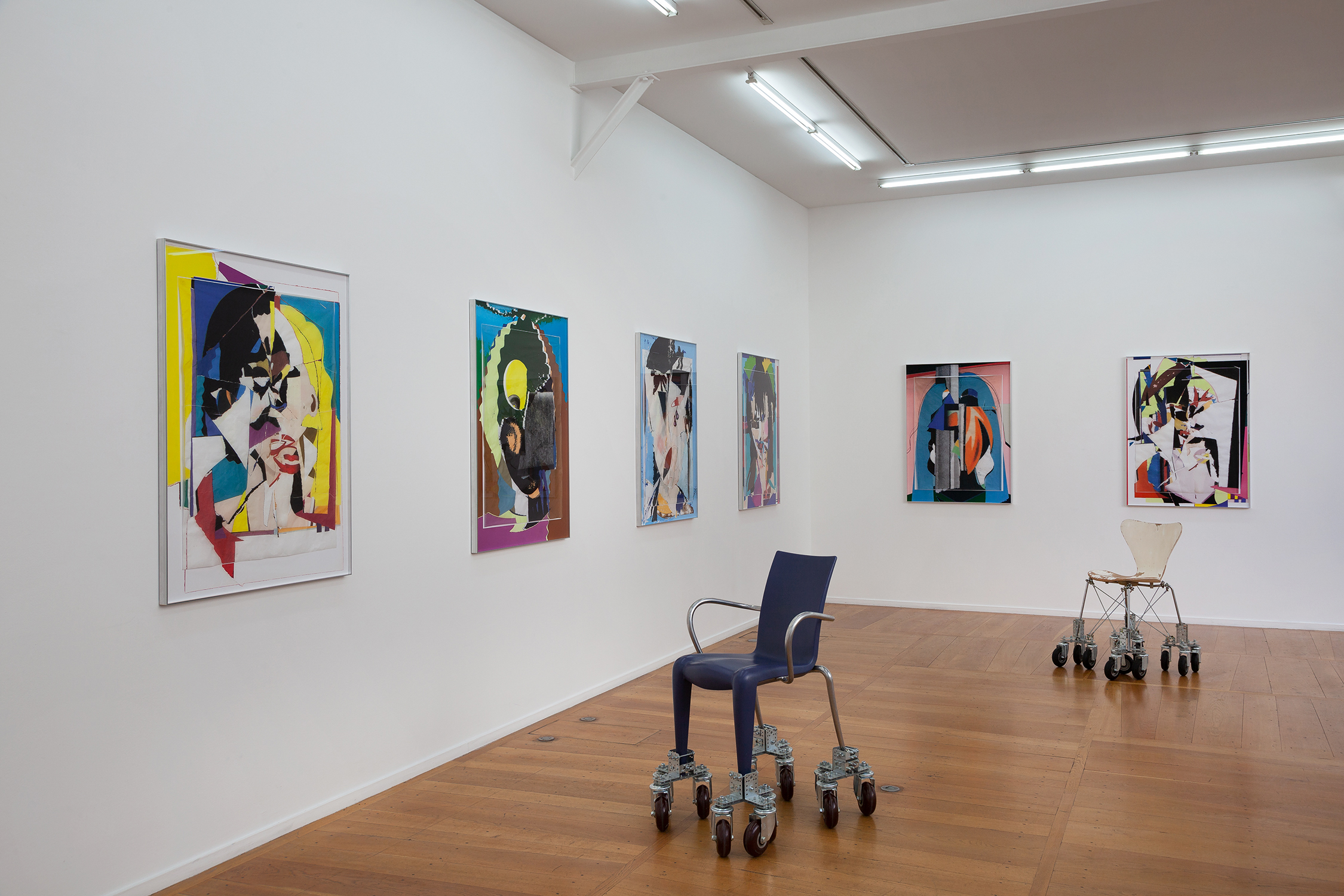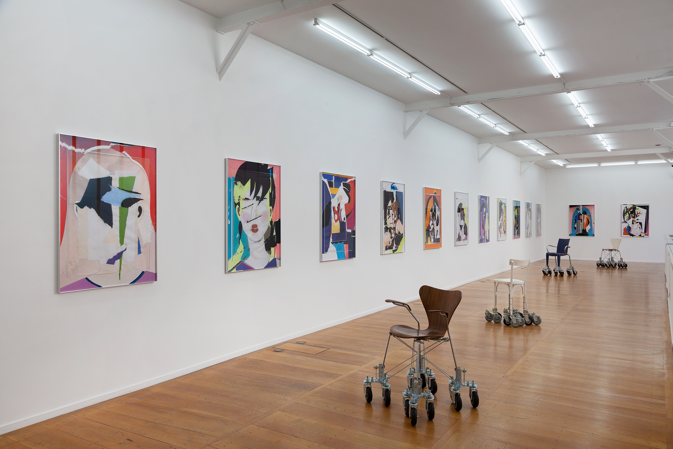 In 2003, Marina Faust created her first Traveling Chairs for her film Gallerande. Vintage chairs were transformed and equipped with stabilizing structures of multiple wheels for the traveling shots. New groups of Traveling Chairs today are used to scroll through exhibition spaces. People can push each other which creates a special bond between the two individuals and offers a different perception of time and view on the surrounding world. For the exhibition, Marina Faust creates a long line of portraits from her Faces series to be contemplated from the seated perspective on a Traveling Chair: « The Traveling Chairs come full circle, returning to their original purpose ».