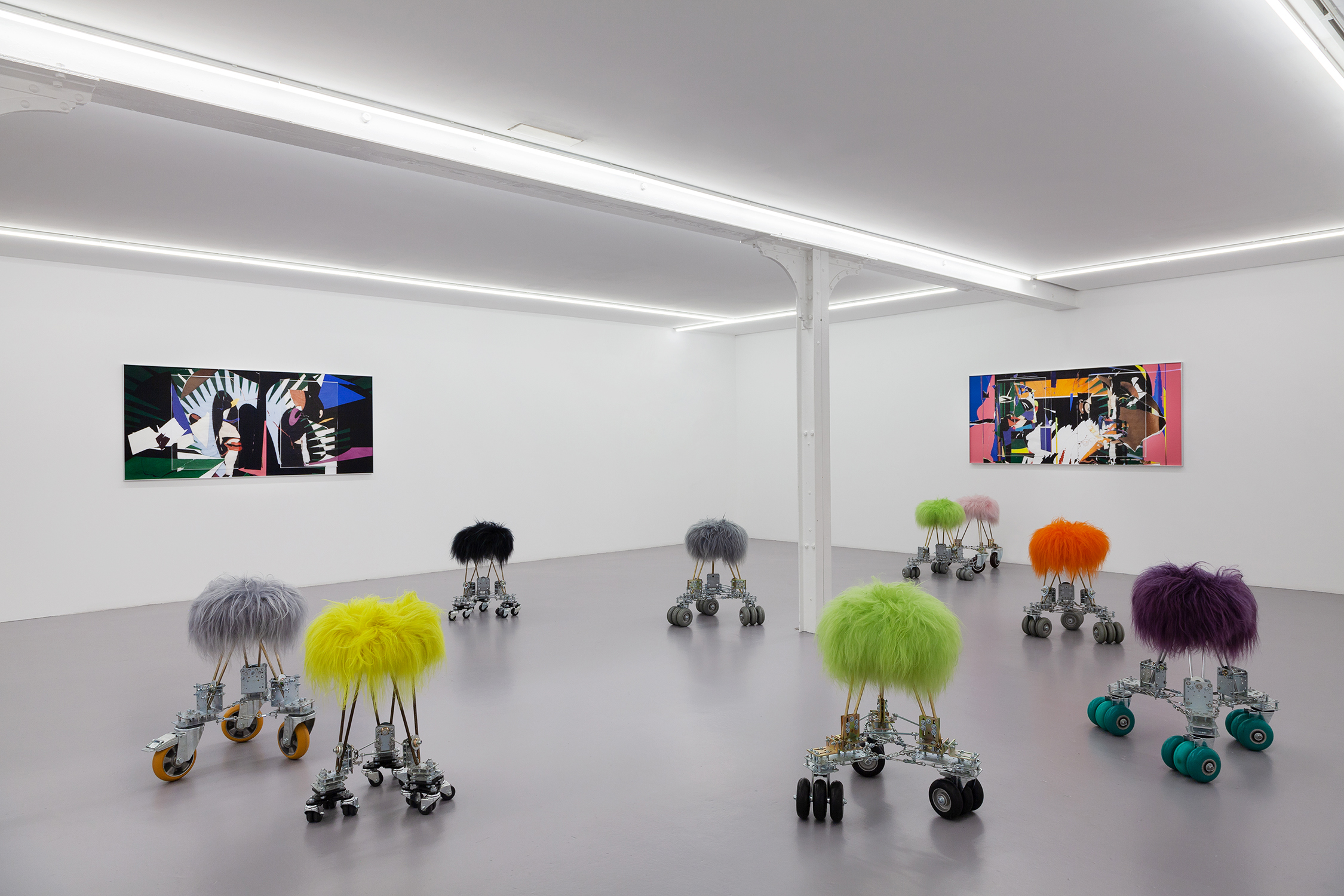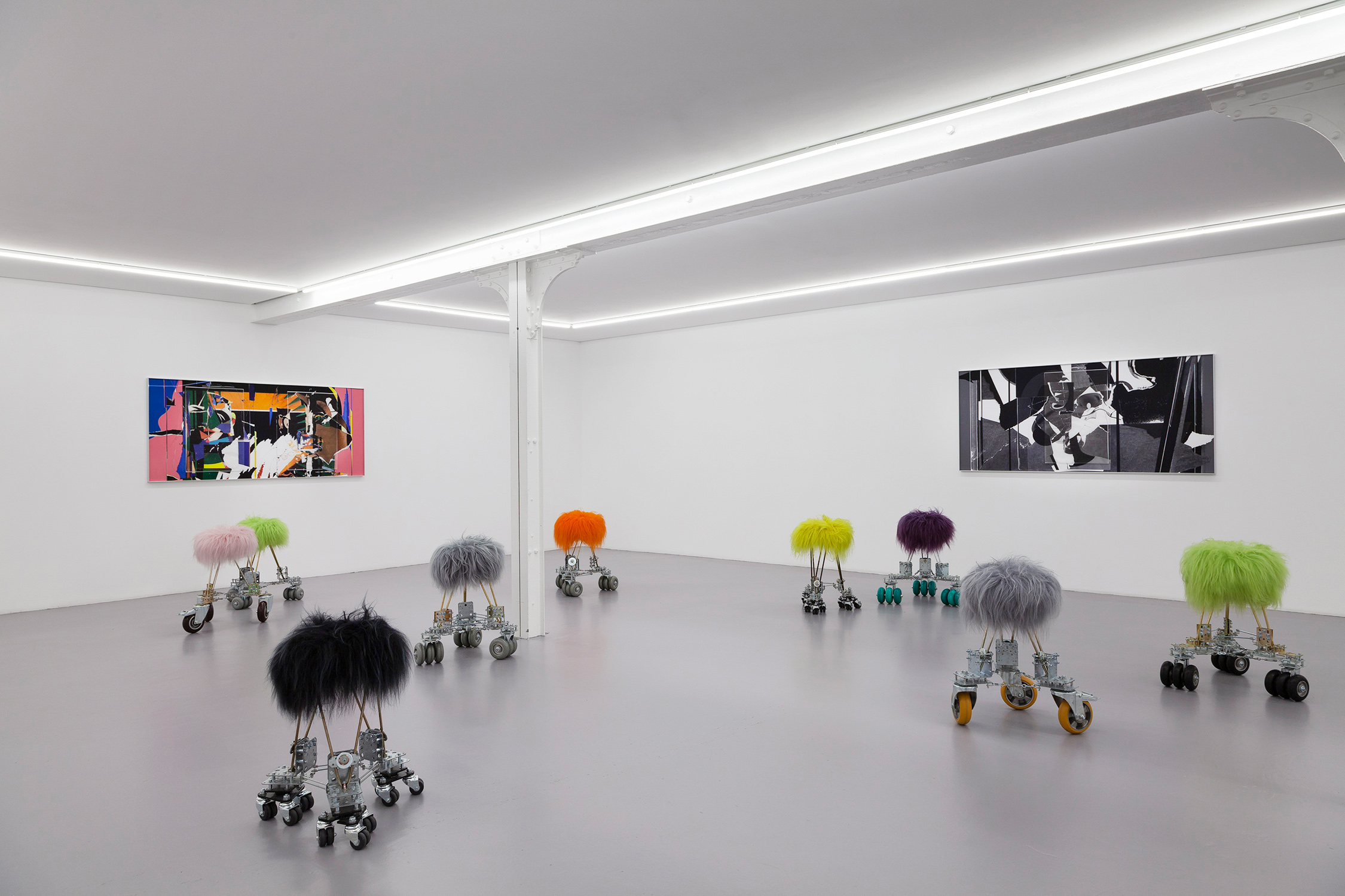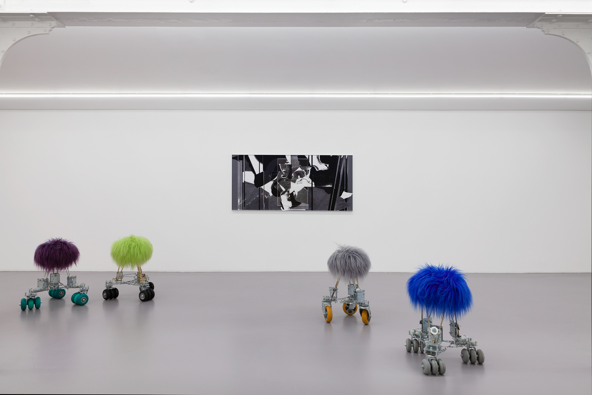 The Rolling Stools come from boudoir vintage stools and are also stabilized and elevated with multiple industrial wheel structures. Besides the fact to sit on them they can be seen as utopian creatures or dystopian pets.