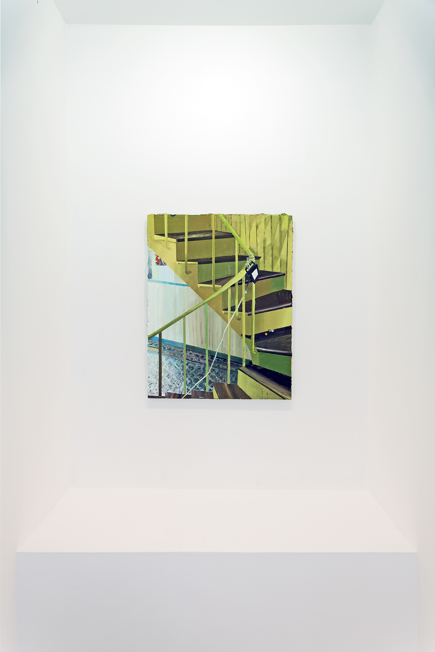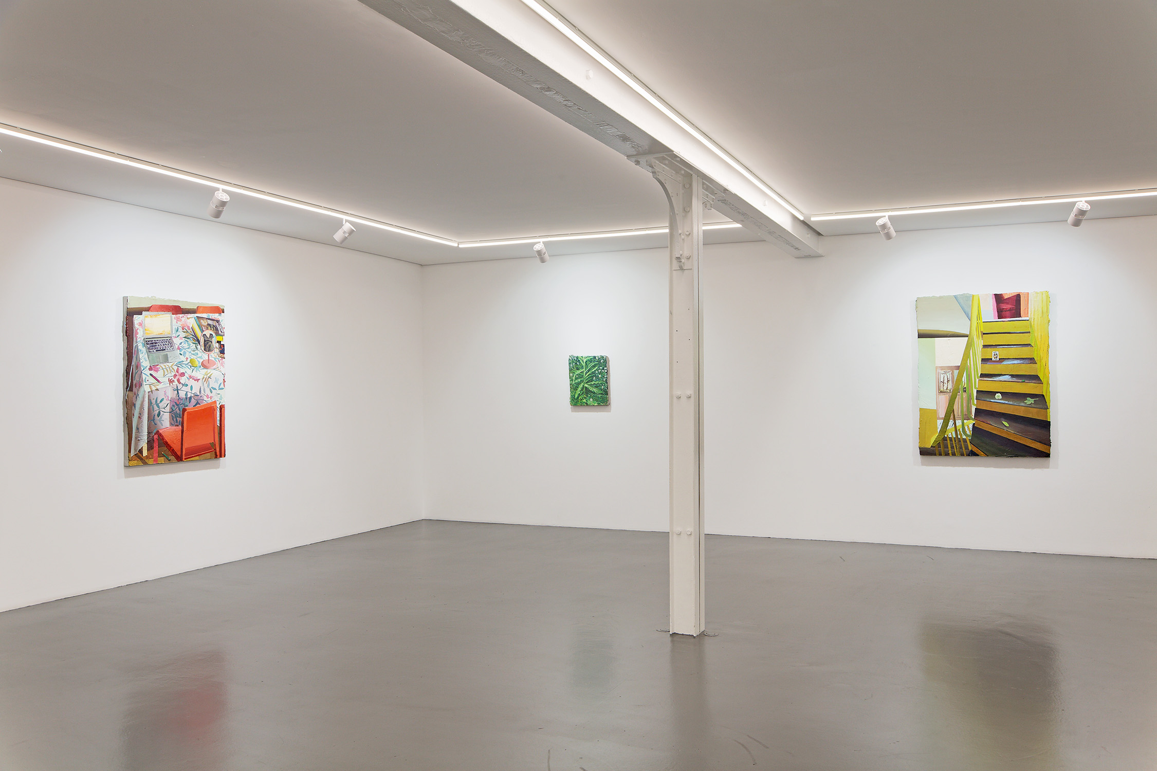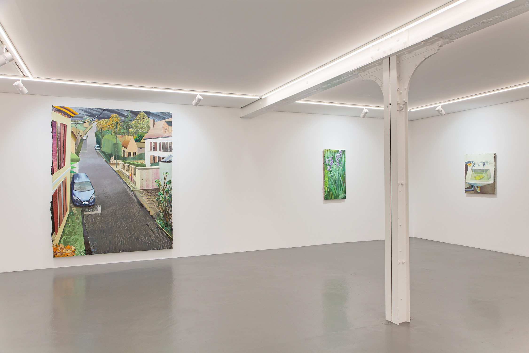 Always on My Mind, Mathieu Cherkit’s fourth solo show with Xippas and his second exhibition in the gallery’s Paris location, draws inspiration from the artist’s own domestic sphere and daily routines. While some of the eleven new paintings on view revisit locations he has depicted in previous works (like Glissement, 2025, which features a distinctive twisting yellow staircase), others explore new terrains, including his galley kitchen (Yelo Voodoo, 2025), home office (TT, 2025), garden (Iris and Cerasus serrulate, both 2025), and the paved road winding past his front door (Grande rue, 2023-2024). Recalling the fervor with which van Gogh painted the interior and environs of his beloved “yellow house” in Arles, Cherkit’s depictions of his immediate surroundings are rooted in reality and capture fleeting emotional experiences of place.