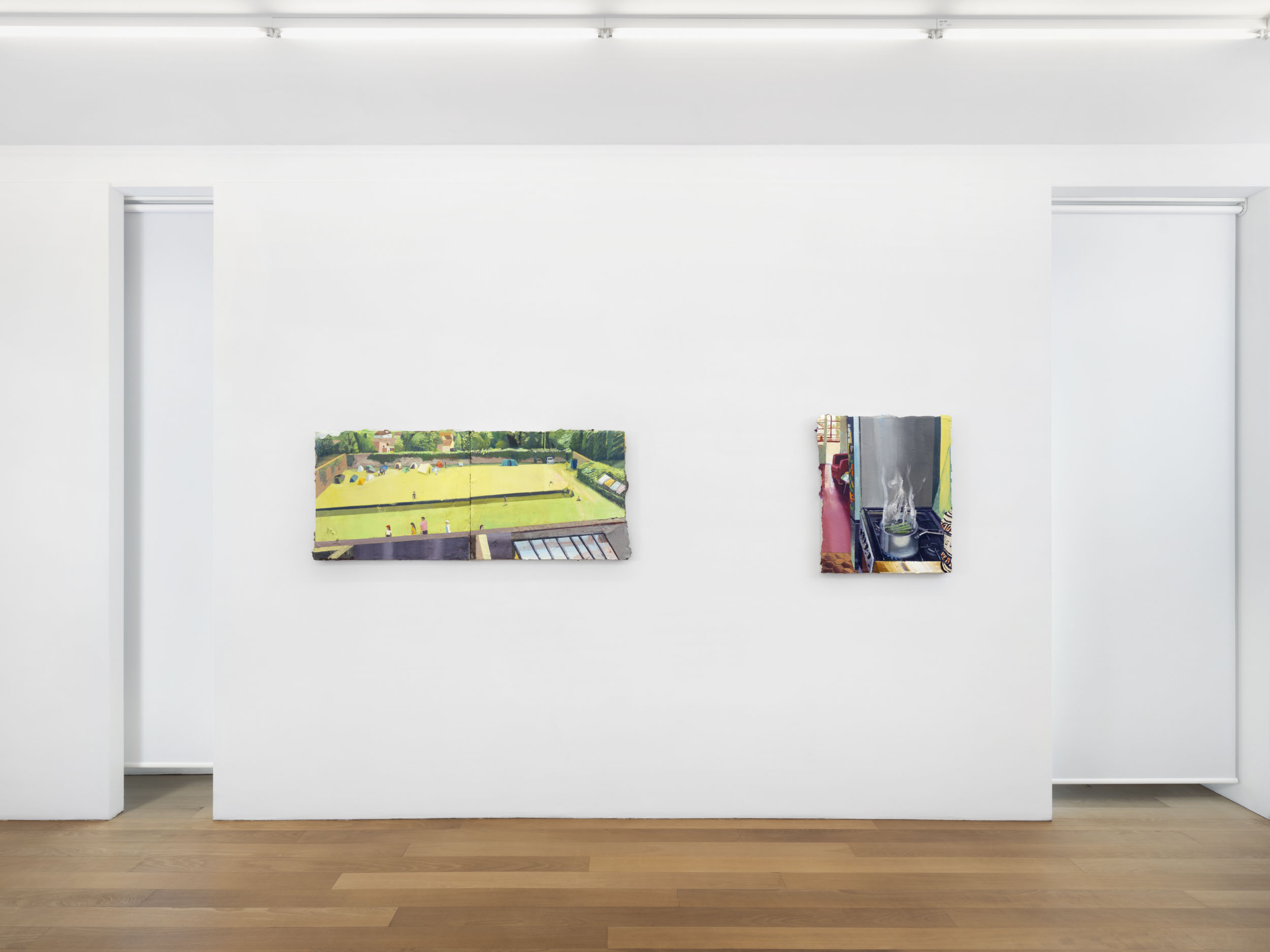 Mathieu Cherkit paints his environment with meticulousness and particular sensitivity. His paintings capture intimate and domestic scenes such as a stove with a steaming pot, a radiator, a stack of books, terracotta tiles, a dandelion, plants waiting to be planted, apple remains in a crate, a staircase, or wisteria on the wall. His works are windows open to the fleeting moments of his daily life, capturing the poetry of objects and scenes that compose his intimate universe. His house, with a floor and a garden he cultivates for rejuvenation, serves as a pretext for painting. Mainly populated with objects, Mathieu Cherkit’s paintings resemble still lifes, with focused details where time seems suspended. Sometimes a character, often the artist himself, appears in his works, but his angular, almost disembodied contours create a distance with the viewer.