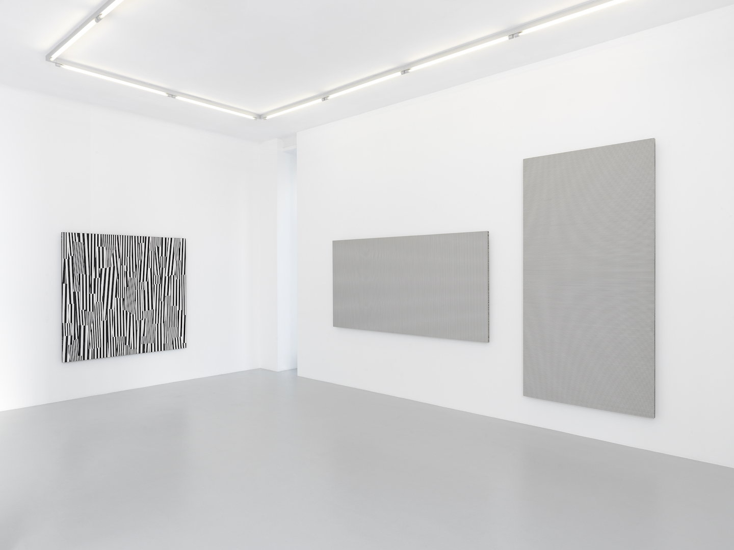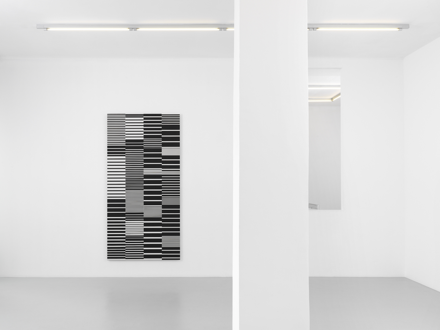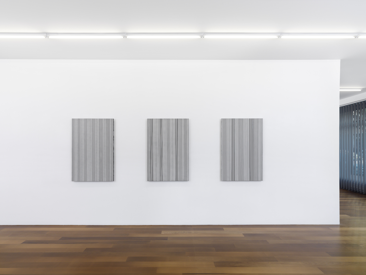 The exhibition presents works from different periods. It includes a serie of canvas with systematic constructions from the early 1990s, composed of black and white lines which have specifically participated into the recognition of his style. These vertical and narrow lines are paints on aluminum plates of variable dimensions. To generate them, the artist explored different trough which he restrained himself during the process of creation, as a binding notice to be respected to the millimeter. About one of this methods, he says, “When I started line paintings, I had the idea of taking the width of a line as a starting point, and from there I only had to look at what was the width of a line in the previous painting to determine the width of one line in the next – width that would be 1% thicker. “[1] Michael Scott puts subjectivity aside through systematism and search for a mechanical aspect of his works.