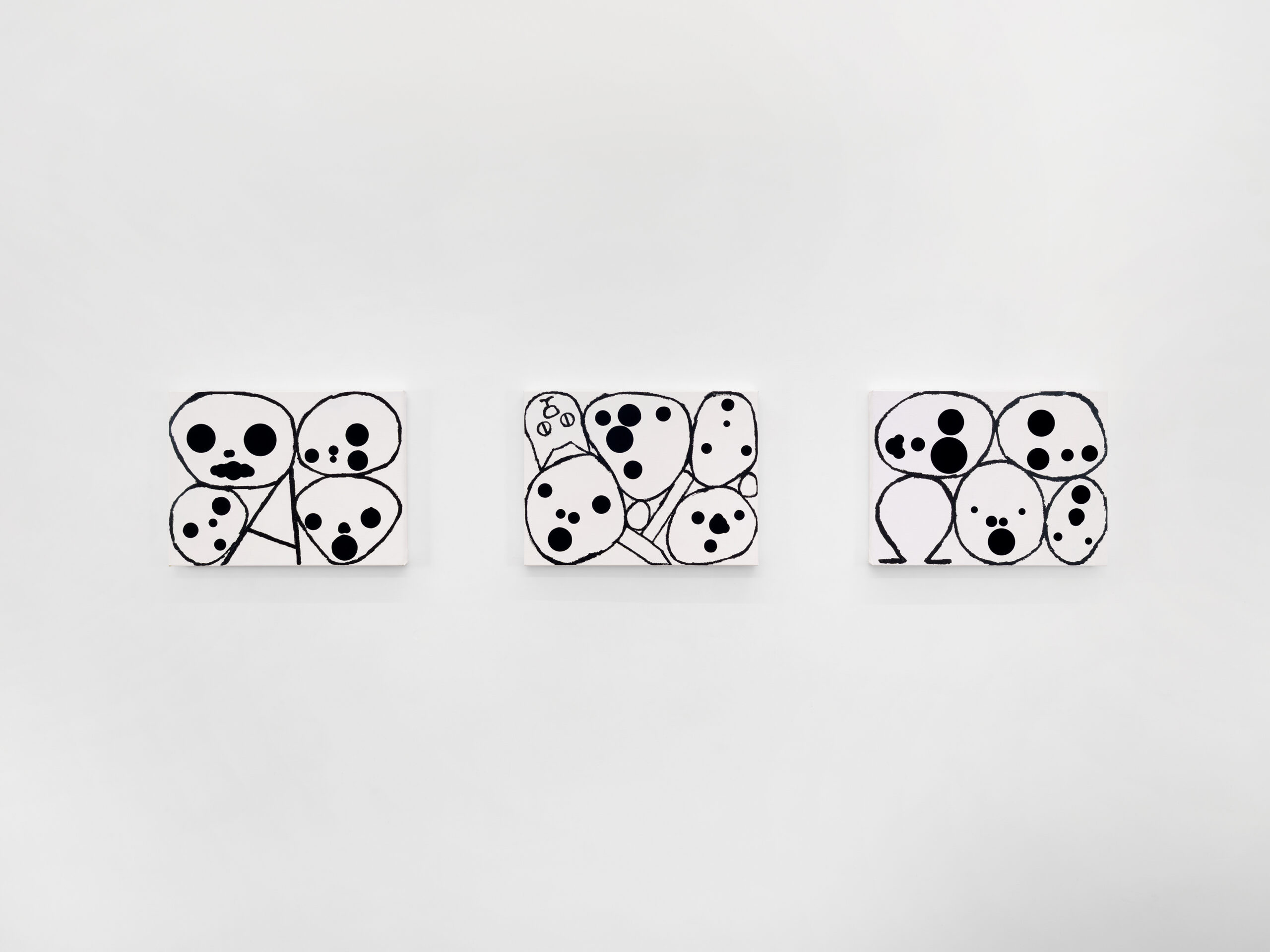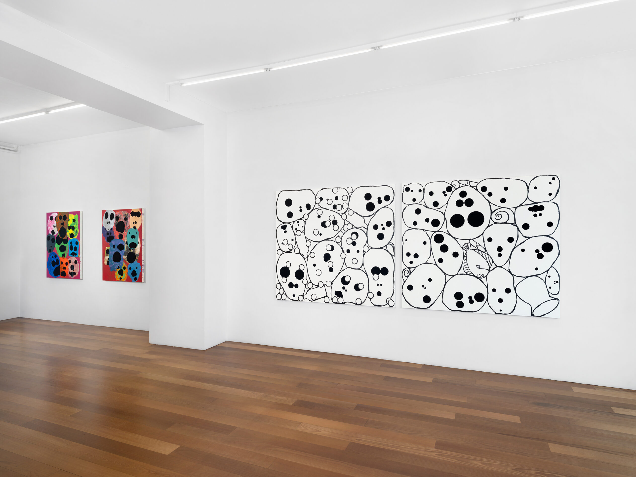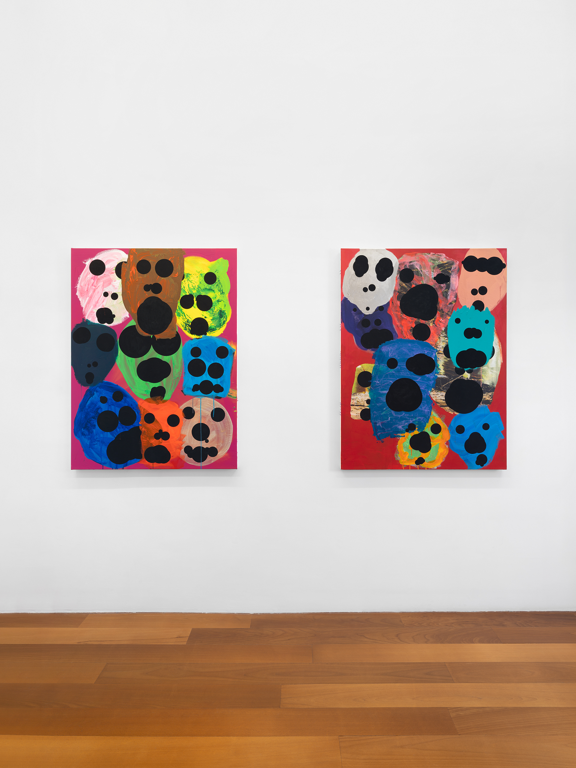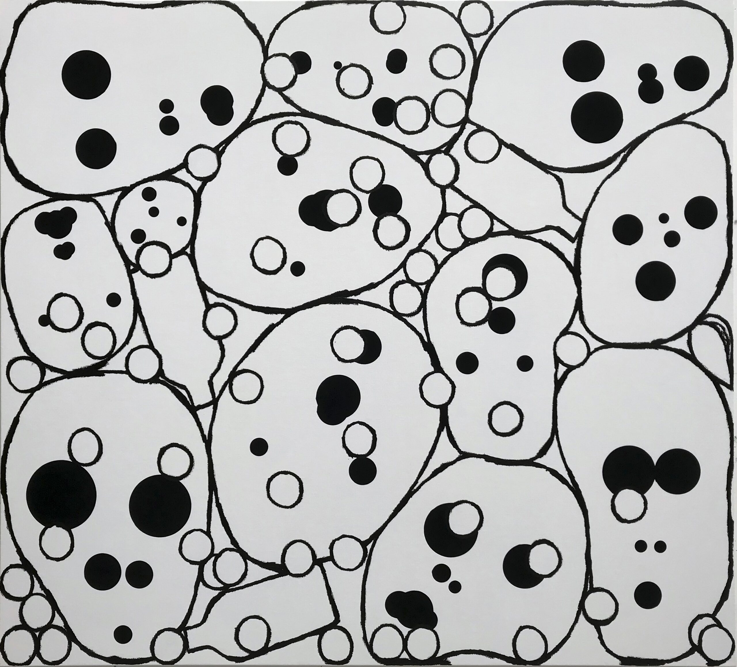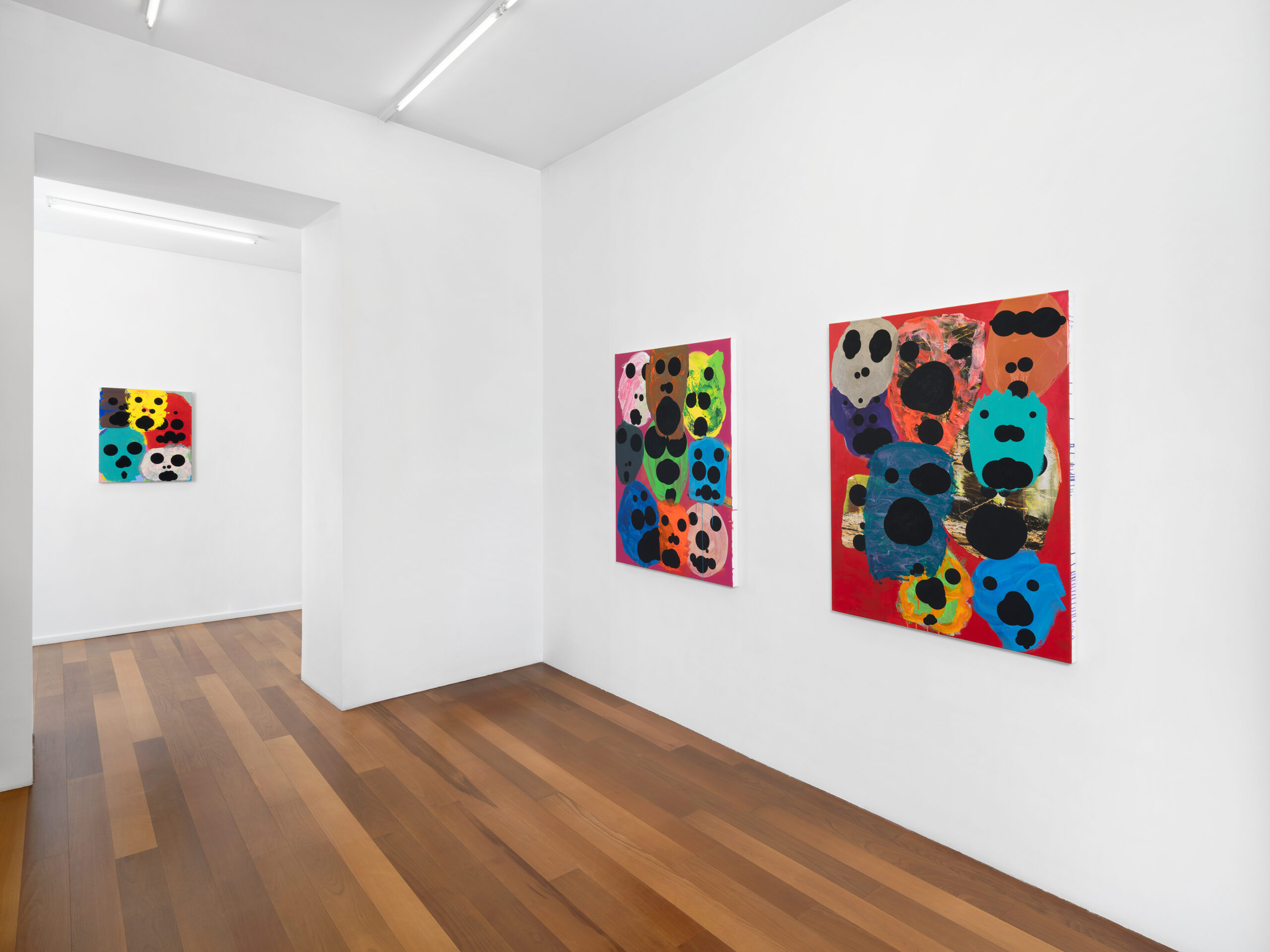 The first group presents clusters of faces emerging from a dense pictorial field. Each canvas reveals a small society of figures that overlap, conceal and merge with one another. The portraits arise from a surface of smeared, poured or knife-spread paint, where the figure appears only to waver again, caught within a material that seems both to reveal and to engulf it. Each face is constructed from nine black circles of varying size, often overlapping, which form the elements of the face. This structure echoes Dante’s Divine Comedy, where both Paradise and Hell are organised into nine spheres. In Dante, these orbs are inhabited by saints and sinners; in Tušek’s paintings, each face appears to contain its own mixture of vices and virtues. While each figure possesses its own complexion, all share the same space, that of the canvas, and the same structural logic, that of the circle. This coexistence can be related to the concept of biocenosis formulated by the biologist Karl Möbius. In his studies of oyster beds in the nineteenth century, Möbius showed that one must consider not an isolated species but the entire community of organisms sharing and interacting within a given environment. The faces painted by Tušek thus form a kind of pictorial ecosystem, a network of individual presences coexisting within the same visual field and structured by their relationships.