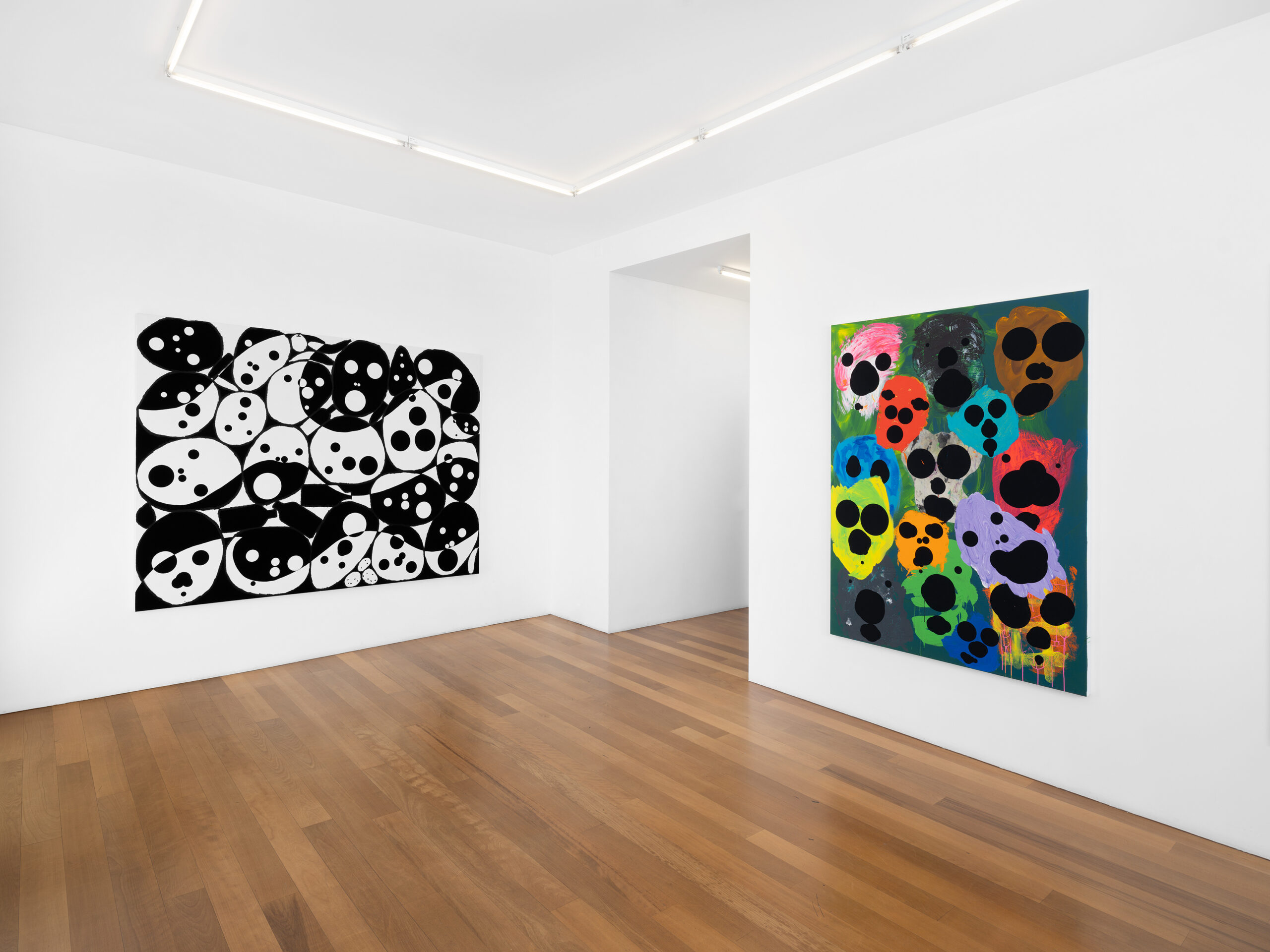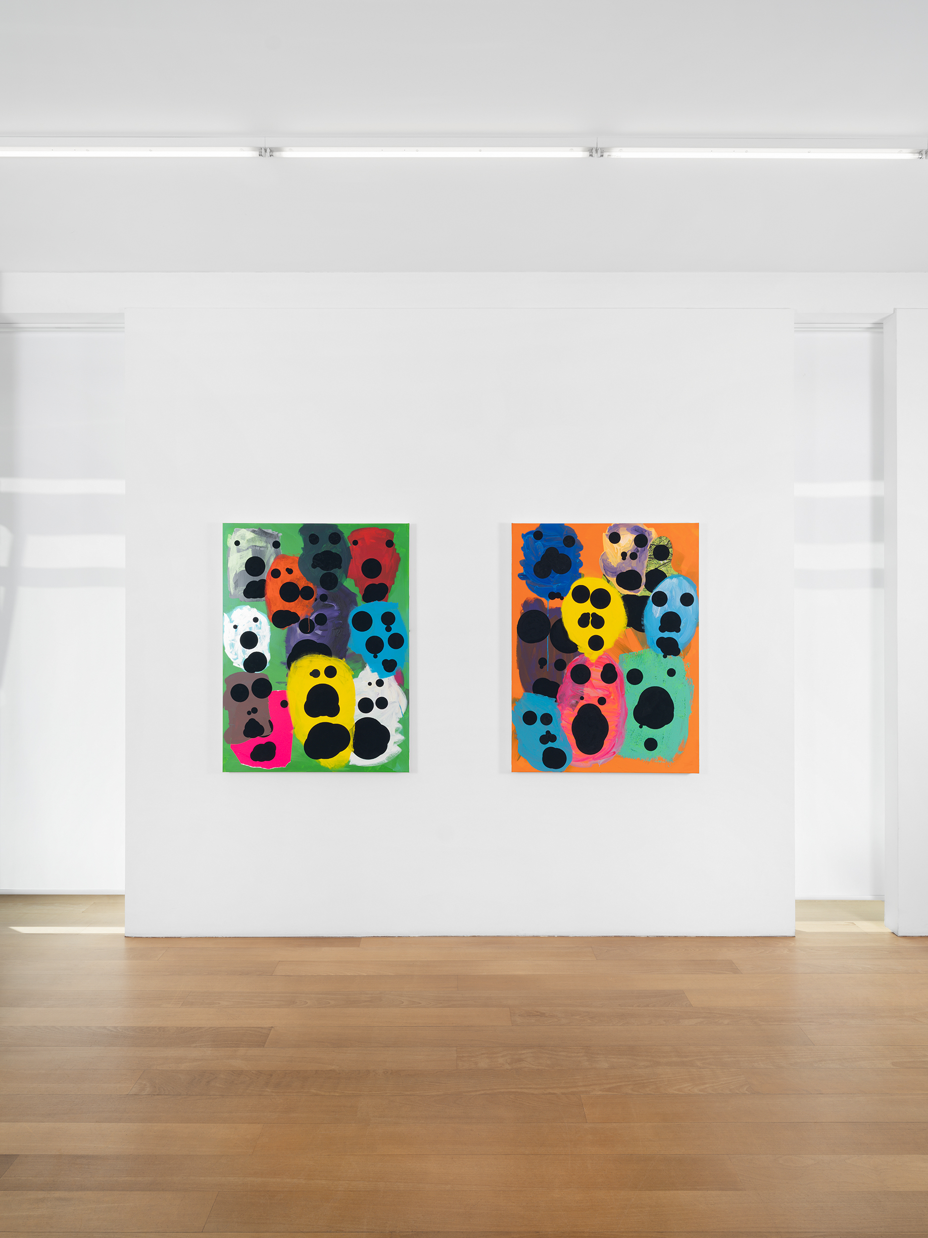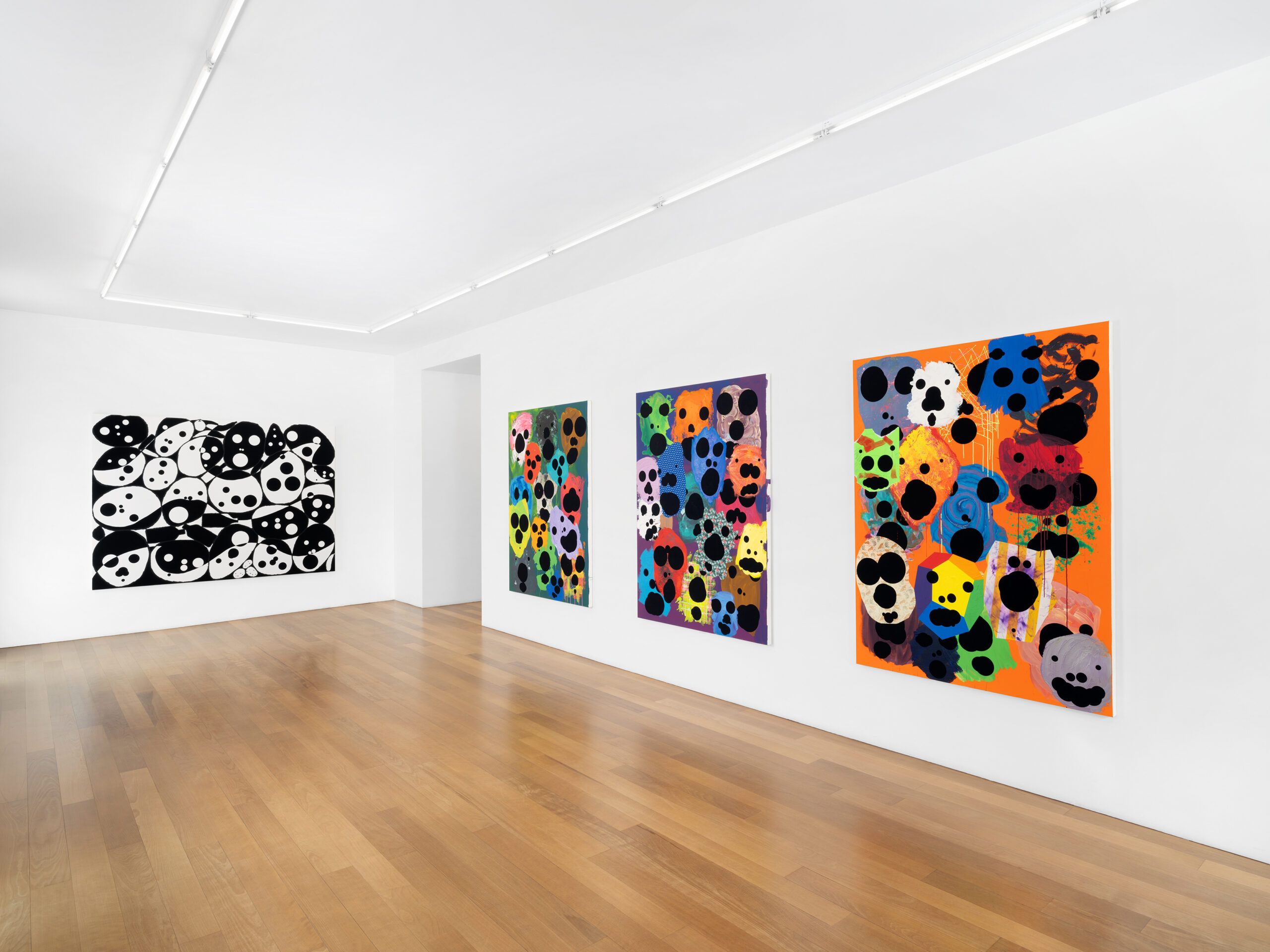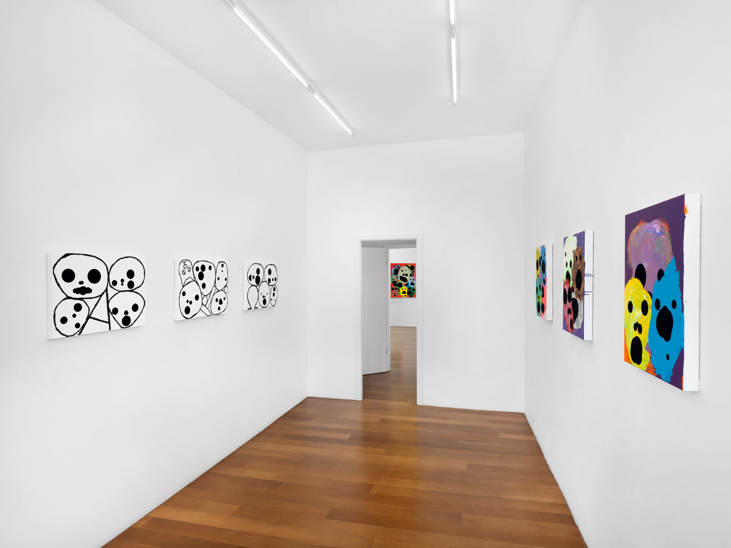 The first group presents clusters of faces emerging from a dense pictorial field. Each canvas reveals a small society of figures that overlap, conceal and merge with one another. The portraits arise from a surface of smeared, poured or knife-spread paint, where the figure appears only to waver again, caught within a material that seems both to reveal and to engulf it. Each face is constructed from nine black circles of varying size, often overlapping, which form the elements of the face. This structure echoes Dante’s Divine Comedy, where both Paradise and Hell are organised into nine spheres. In Dante, these orbs are inhabited by saints and sinners; in Tušek’s paintings, each face appears to contain its own mixture of vices and virtues. While each figure possesses its own complexion, all share the same space, that of the canvas, and the same structural logic, that of the circle. This coexistence can be related to the concept of biocenosis formulated by the biologist Karl Möbius. In his studies of oyster beds in the nineteenth century, Möbius showed that one must consider not an isolated species but the entire community of organisms sharing and interacting within a given environment. The faces painted by Tušek thus form a kind of pictorial ecosystem, a network of individual presences coexisting within the same visual field and structured by their relationships.