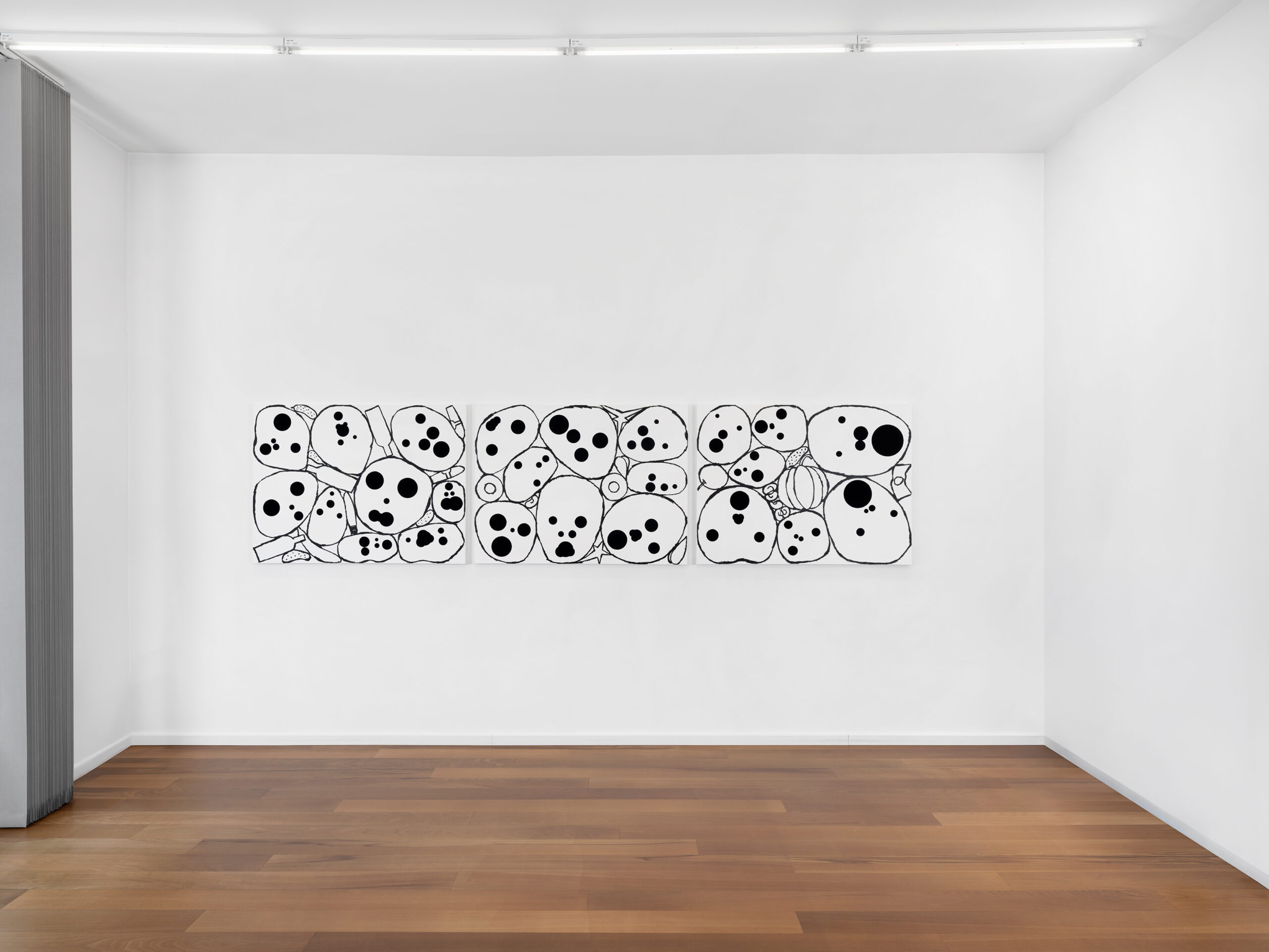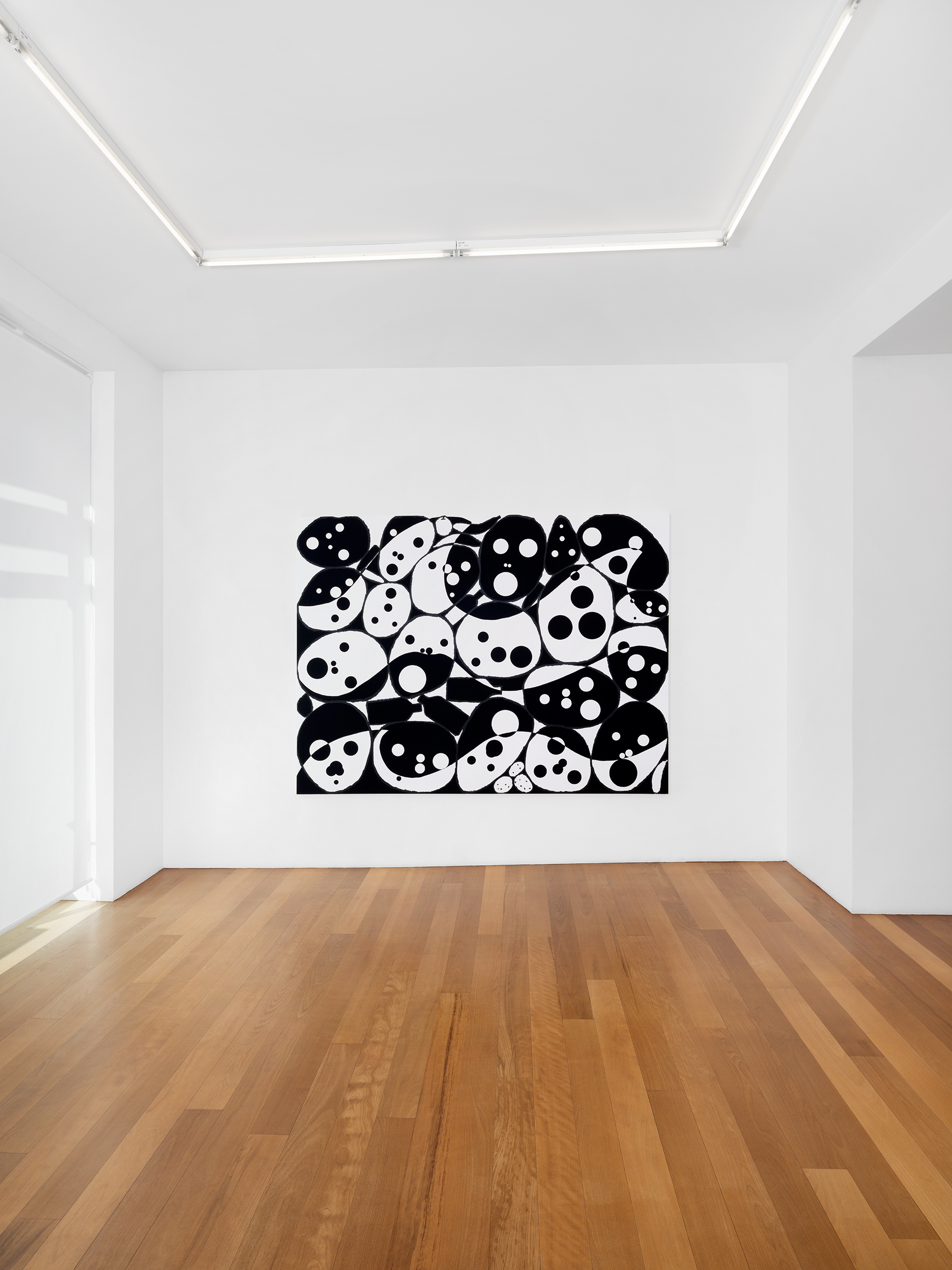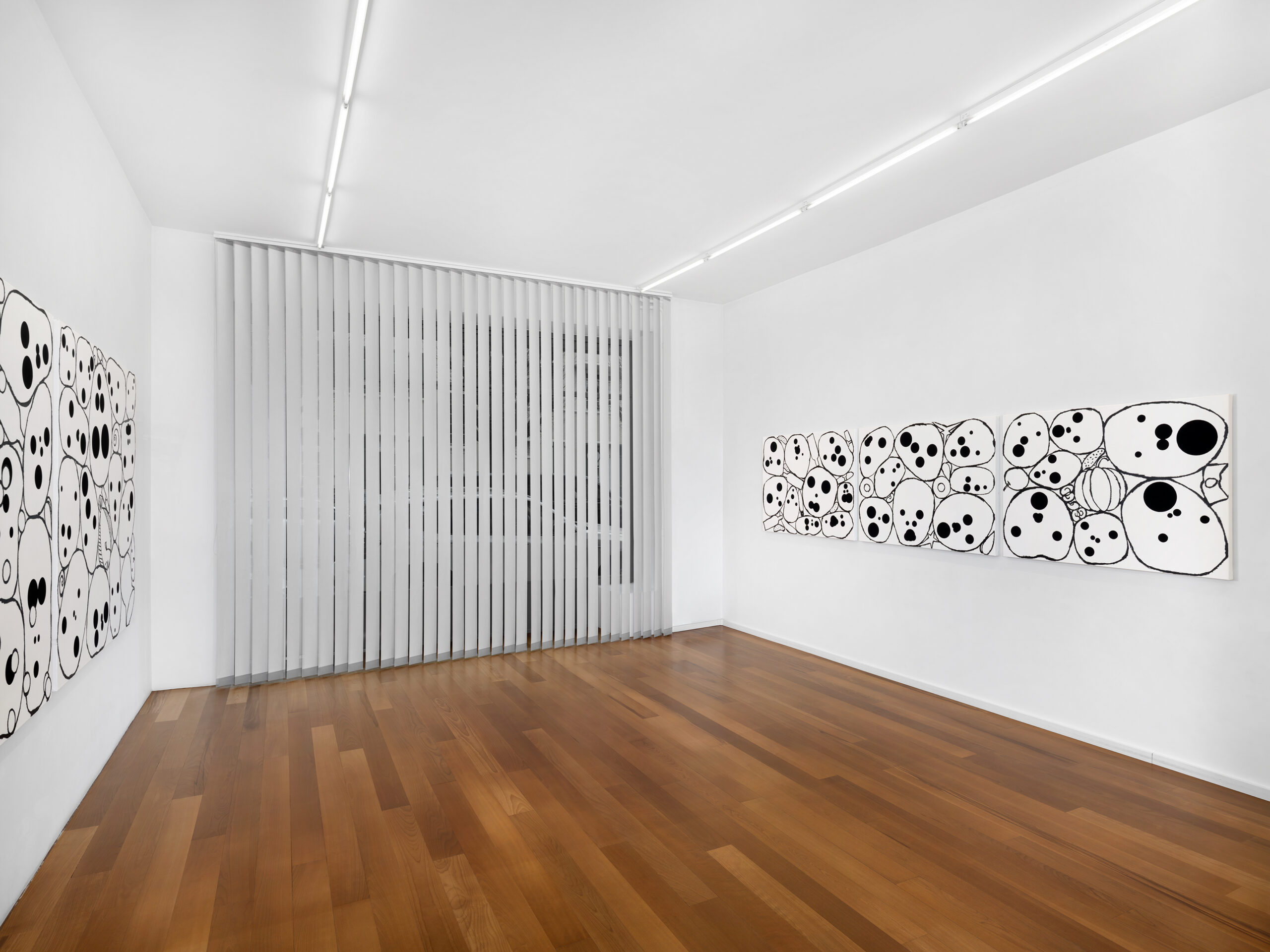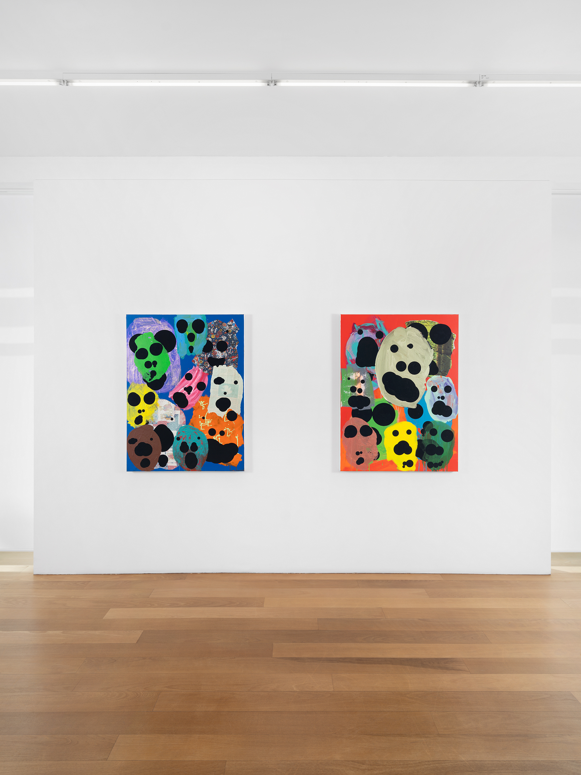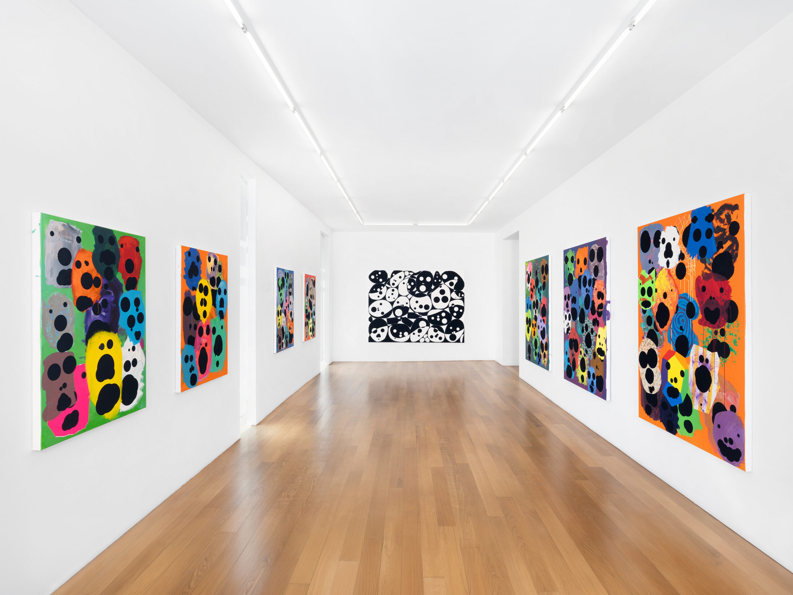 The first group presents clusters of faces emerging from a dense pictorial field. Each canvas reveals a small society of figures that overlap, conceal and merge with one another. The portraits arise from a surface of smeared, poured or knife-spread paint, where the figure appears only to waver again, caught within a material that seems both to reveal and to engulf it. Each face is constructed from nine black circles of varying size, often overlapping, which form the elements of the face. This structure echoes Dante’s Divine Comedy, where both Paradise and Hell are organised into nine spheres. In Dante, these orbs are inhabited by saints and sinners; in Tušek’s paintings, each face appears to contain its own mixture of vices and virtues. While each figure possesses its own complexion, all share the same space, that of the canvas, and the same structural logic, that of the circle. This coexistence can be related to the concept of biocenosis formulated by the biologist Karl Möbius. In his studies of oyster beds in the nineteenth century, Möbius showed that one must consider not an isolated species but the entire community of organisms sharing and interacting within a given environment. The faces painted by Tušek thus form a kind of pictorial ecosystem, a network of individual presences coexisting within the same visual field and structured by their relationships.