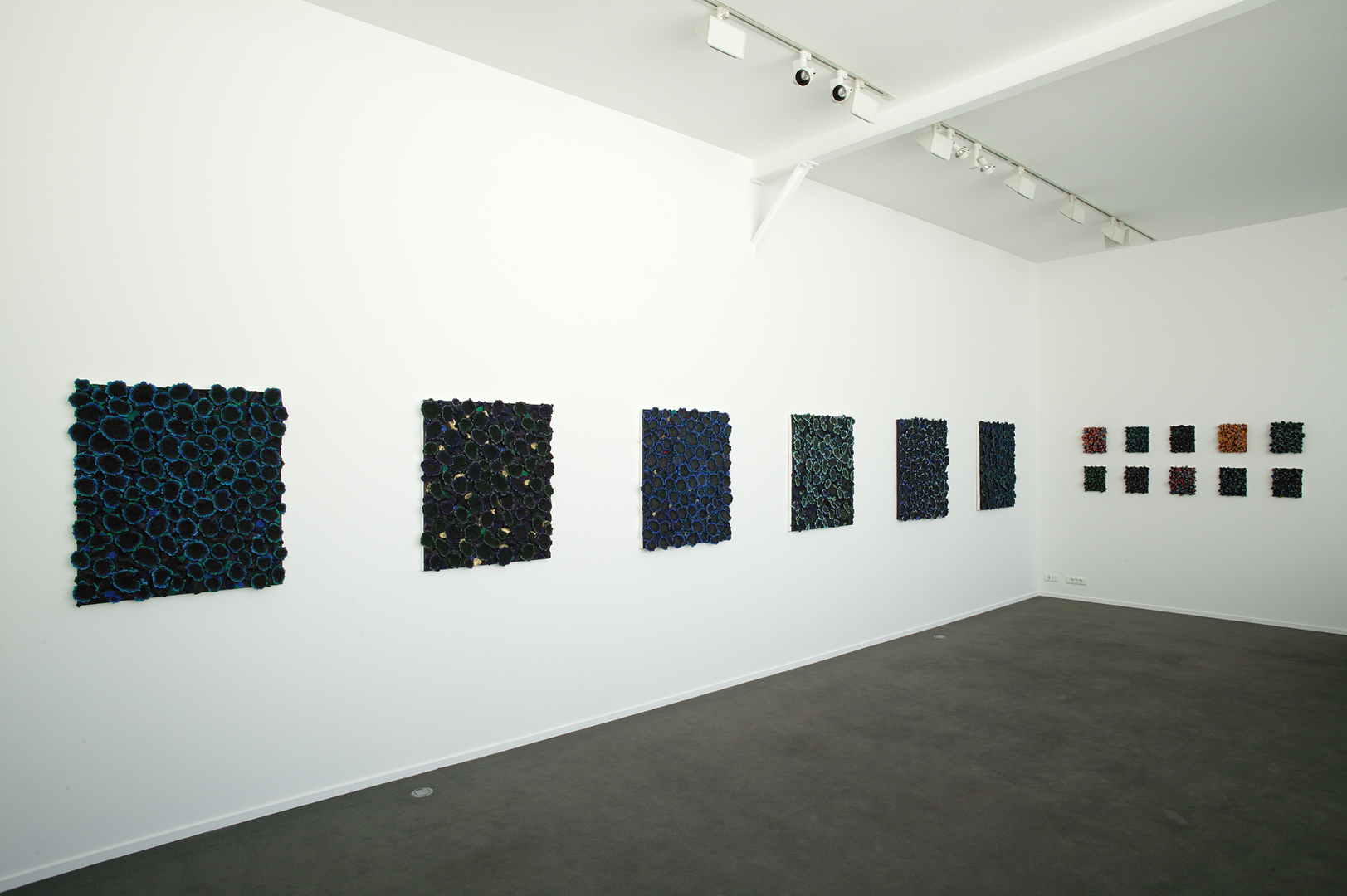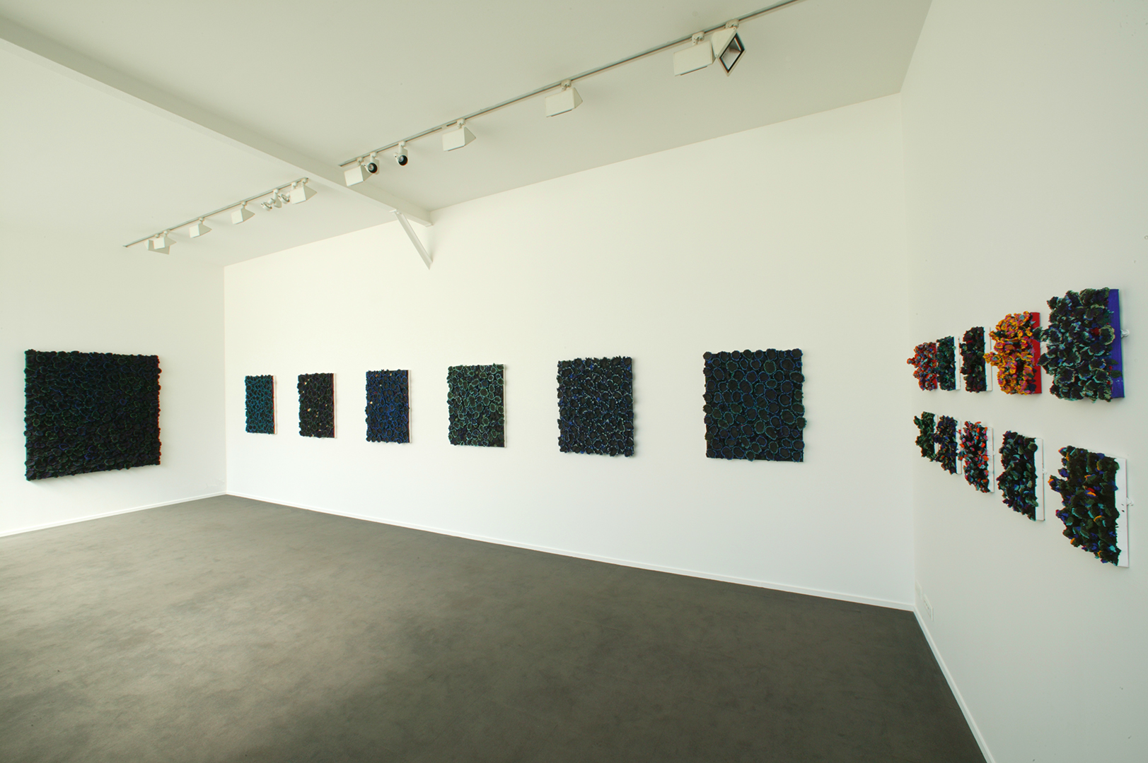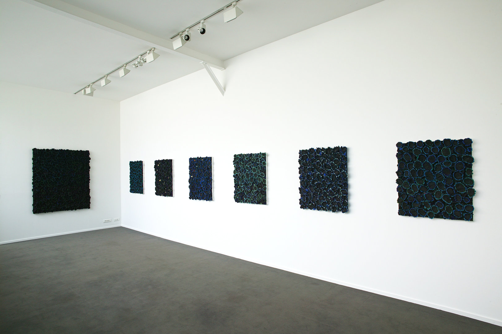 Dans la série de tableaux présentée pour sa première exposition personnelle à la galerie Xippas, Nabil Nahas utilise de la pierre ponce combinée à des pigments de couleurs vives. Le procédé provoque un phénomène de double vision. Ainsi, vues de loin les œuvres de Nahas ressemblent à des œuvres en deux dimensions saturées de peintures, mais de près le spectateur découvre un champ minéral tridimensionnel. Ces compositions s’inspirent de la géométrie dite fractale, inventée par Benoît Mandelbrot pour décrire la géométrie de la nature, dont les formes complexes et irrégulières échappent à la géométrie classique. Les surfaces des tableaux se composent de roches volcaniques impossibles à nombrer et pourtant ordonnées. Comme le suggèrent certains titres, ces œuvres renvoient à l’infinité du monde et à sa complexité.