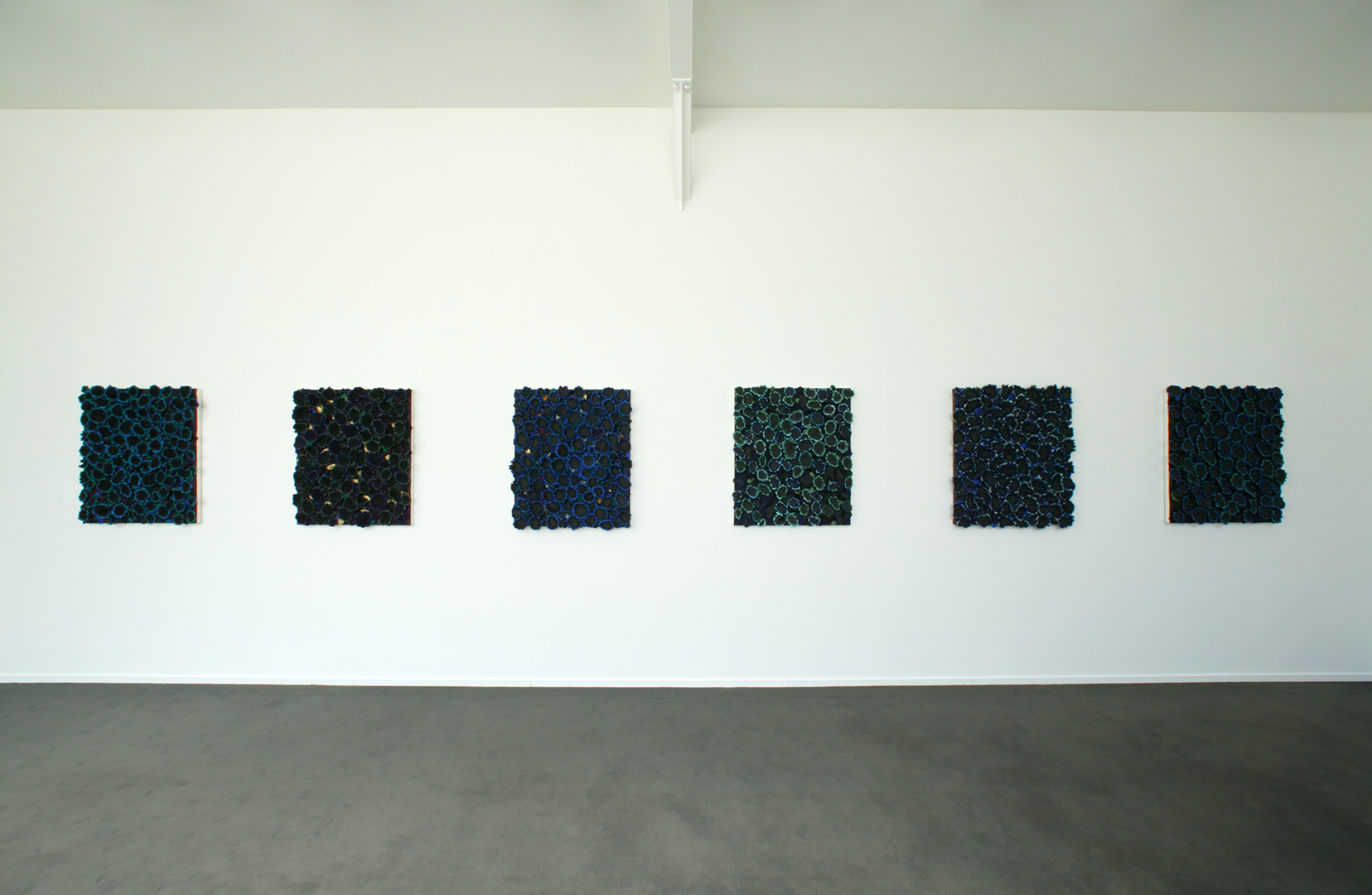 Ces peintures ne semblent pas avoir été réalisées avec la main de l’homme, mais issues d’un processus naturel. Le procédé et le matériau deviennent le sujet du tableau. Les œuvres de Nahas nous offrent une surabondance et une luxuriance; elles questionnent la complexité de ce qui nous entoure.