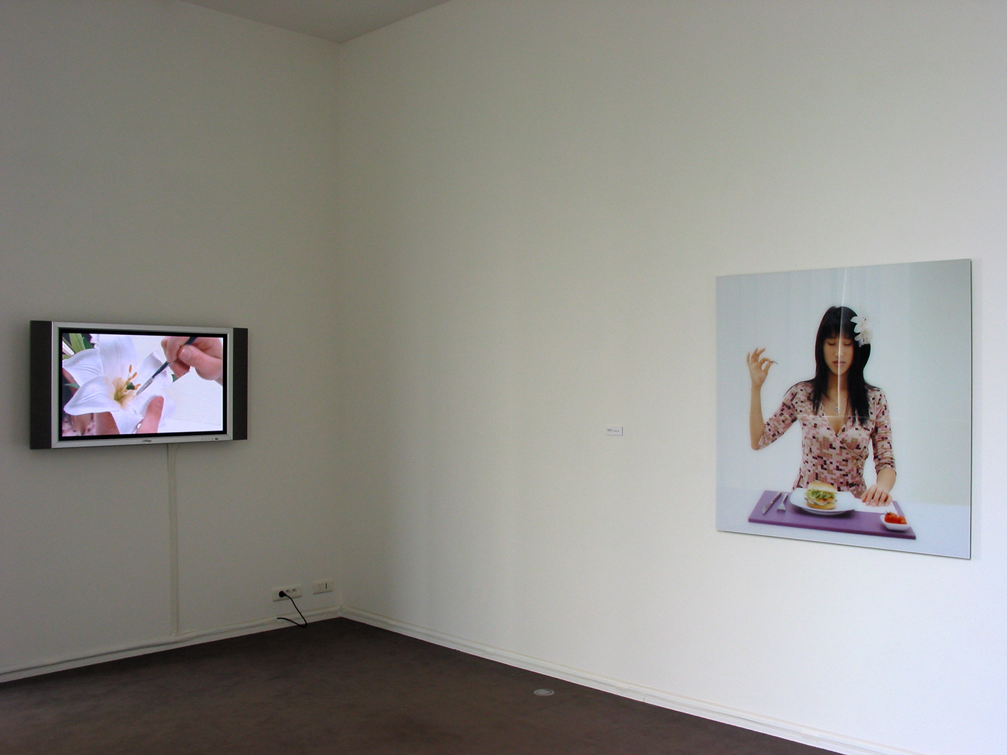 En parallèle, deux photographies: la première, la photographie, publicitaire, a été réalisée le temps du tournage et au moment de la prise de vue. C’est une photographie couleur où l’on voit le mannequin face au hamburger, les yeux fermés, dans un quasi délice ou «absence». Cette photographie, prétexte et motif de la scène, est montrée en vis-à-vis de la projection du film. La seconde représente Phi Phong, la manucure, sur son lieu de travail reprenant la pose de la première image.