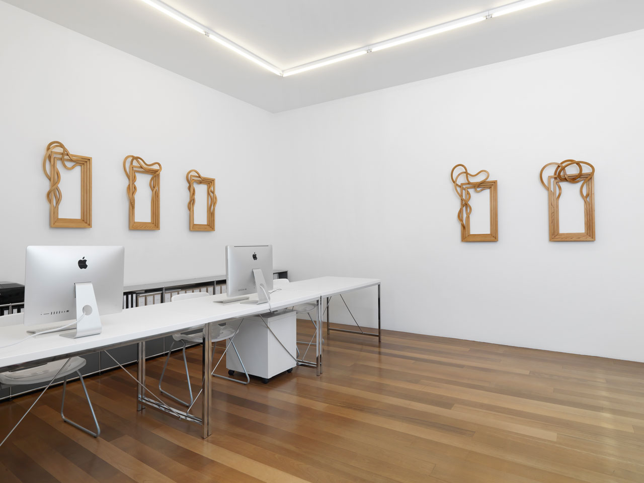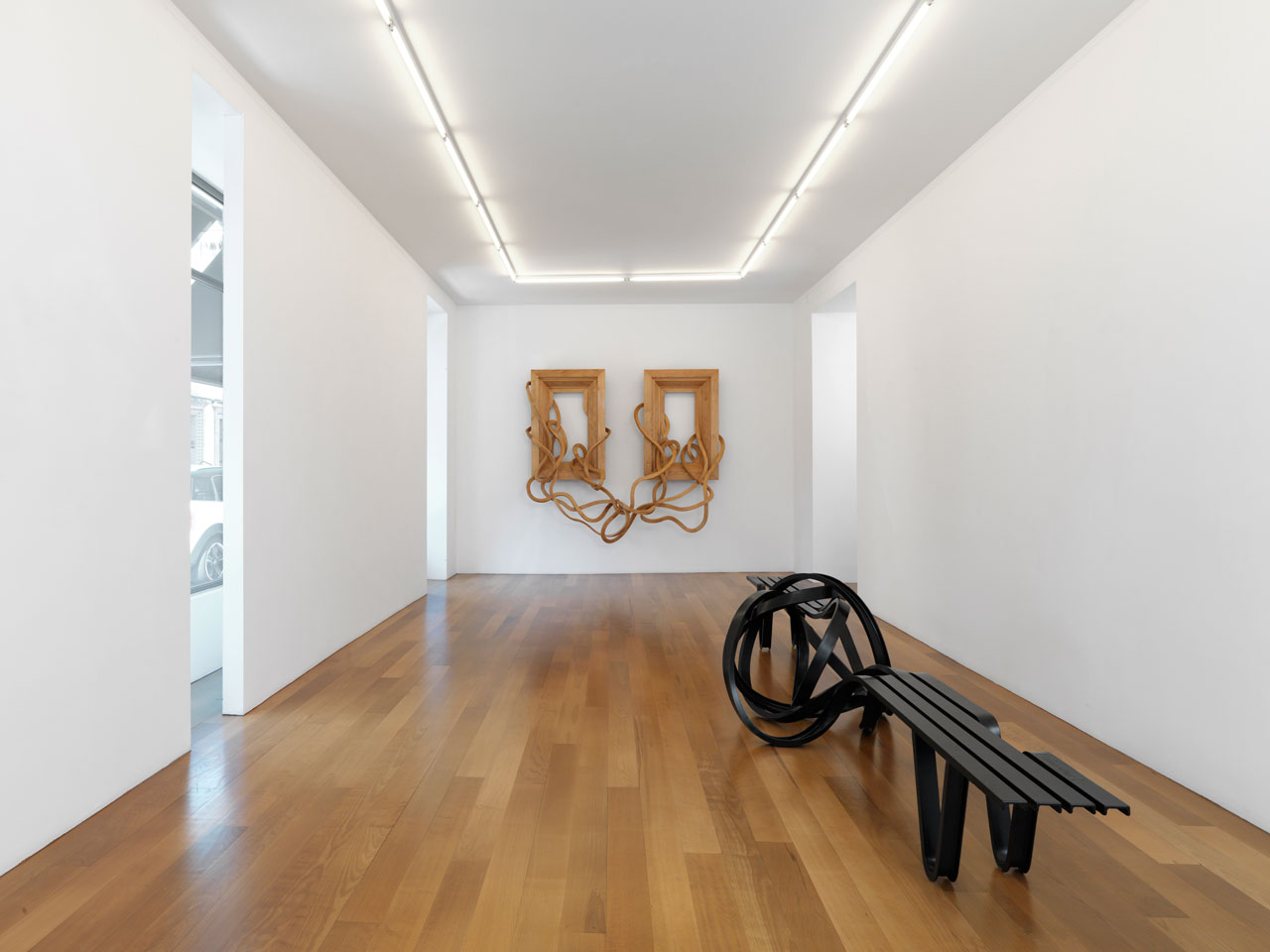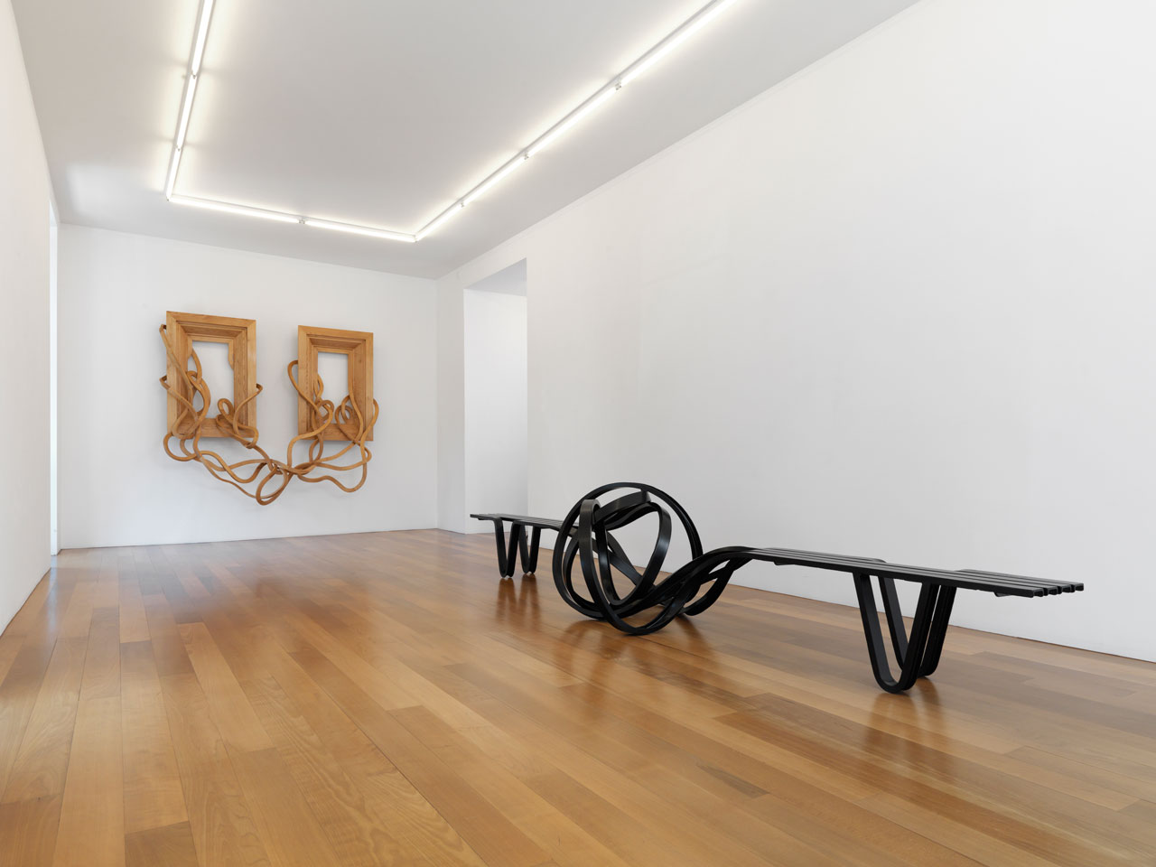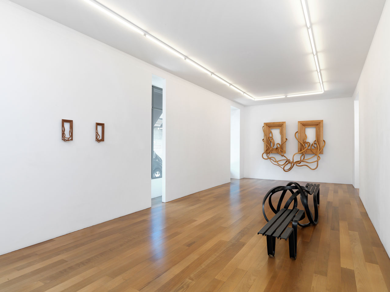Intitulée Tableaux d’une Exposition, l’exposition regroupe un ensemble d’œuvres récentes, du banc en acier peint en noir aux cadres en bois d’une variété de tailles et de formes remarquables.