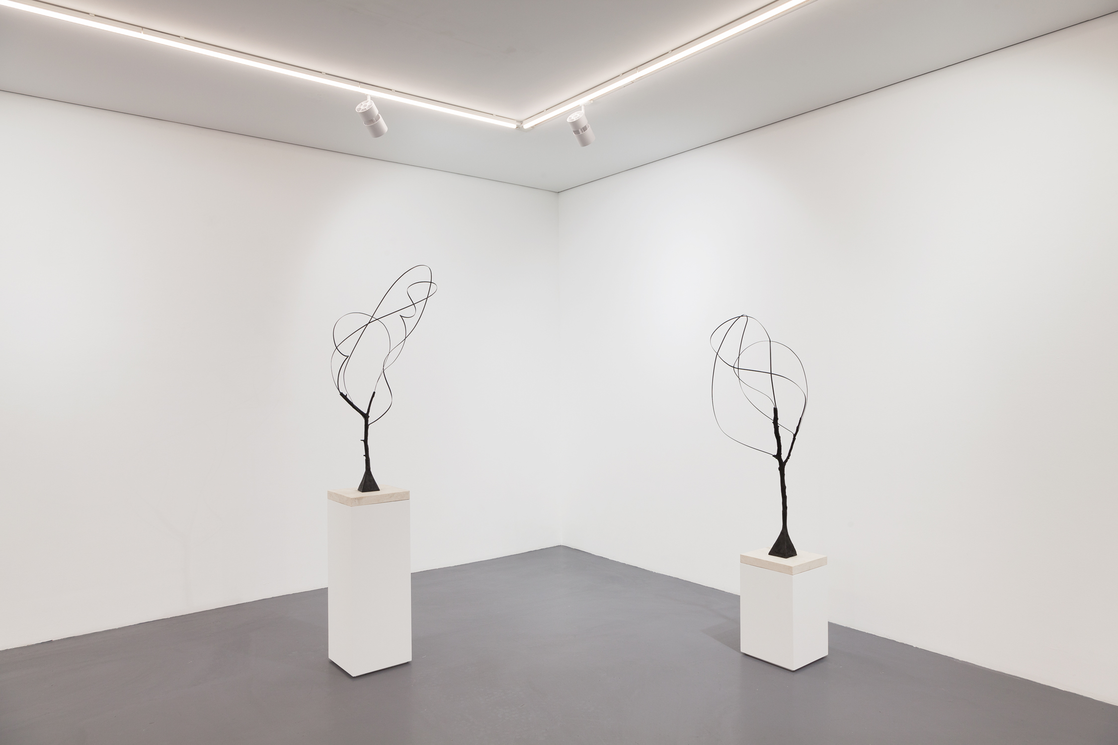 In Pablo Reinoso’s most recent works, two new directions appear. The first includes the trees from the ‘Up Rooted’ cycle, in which elements of natural appearance transform into their opposite, reinforcing their virtuoso artificiality. Thus, the branches of trees, moulded and cast in bronze, “transgress” their frozen form to embody a dancing abstraction. Supported by metal rods like prostheses, his sculptures appear simultaneously immobilised, almost crucified, but also liberated, thanks to the serpentine movement of the steel component. There is something robotic about his android-trees, where technology complements nature to remake and support it.
