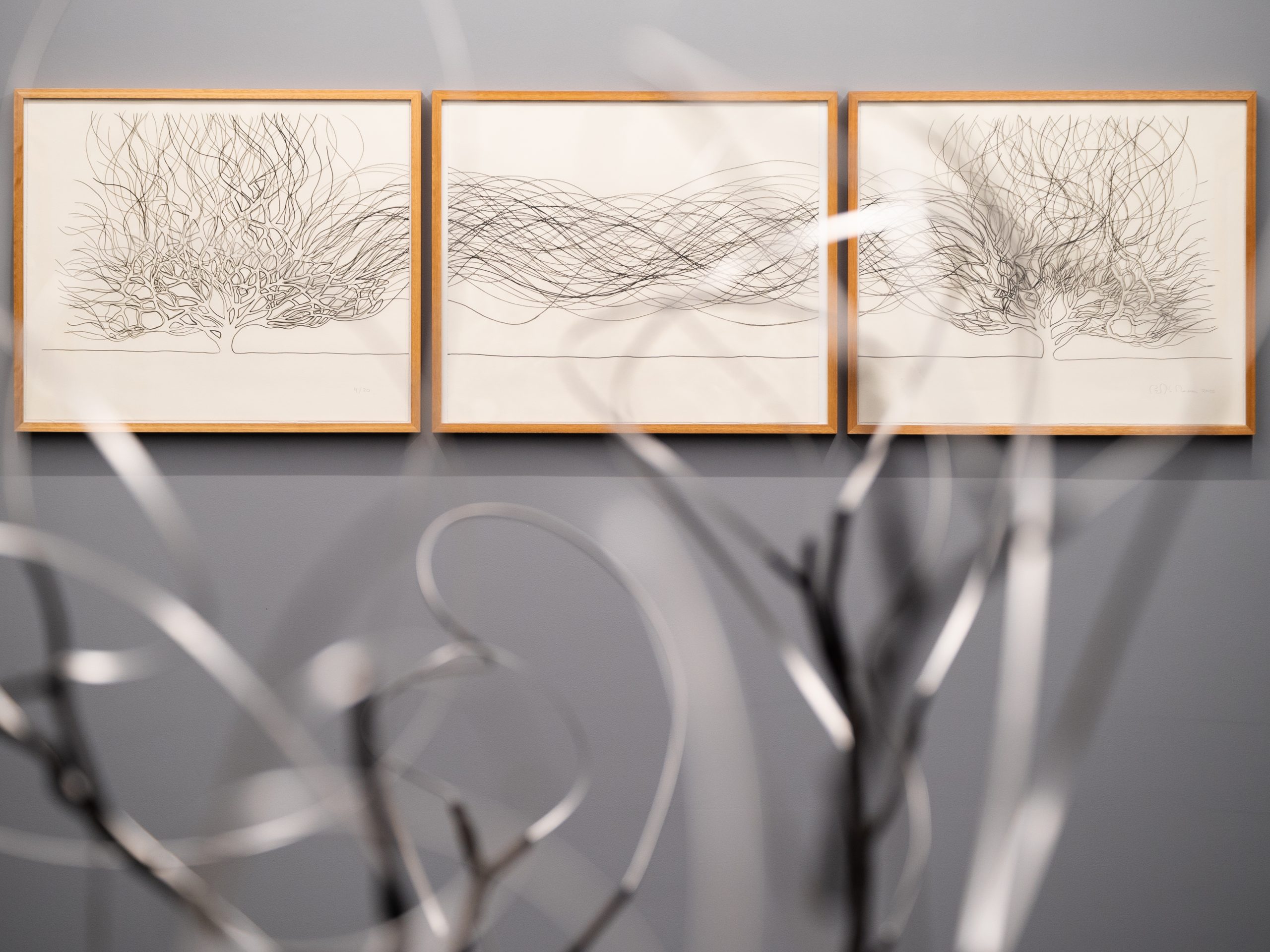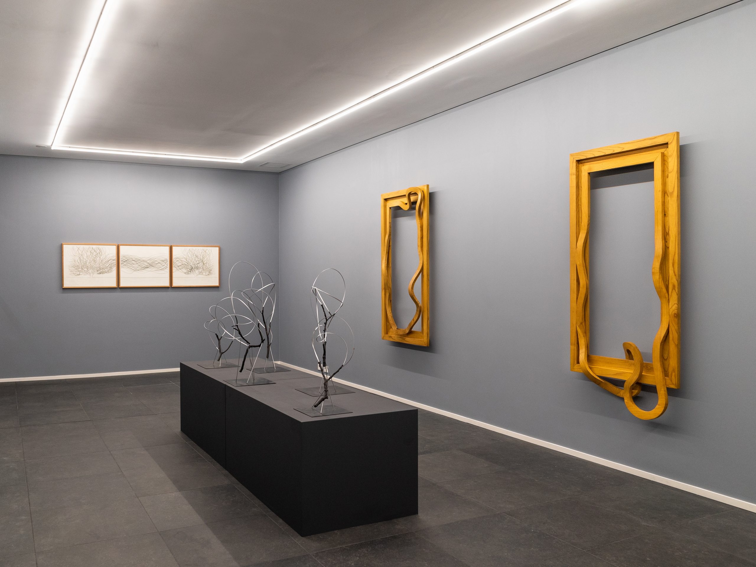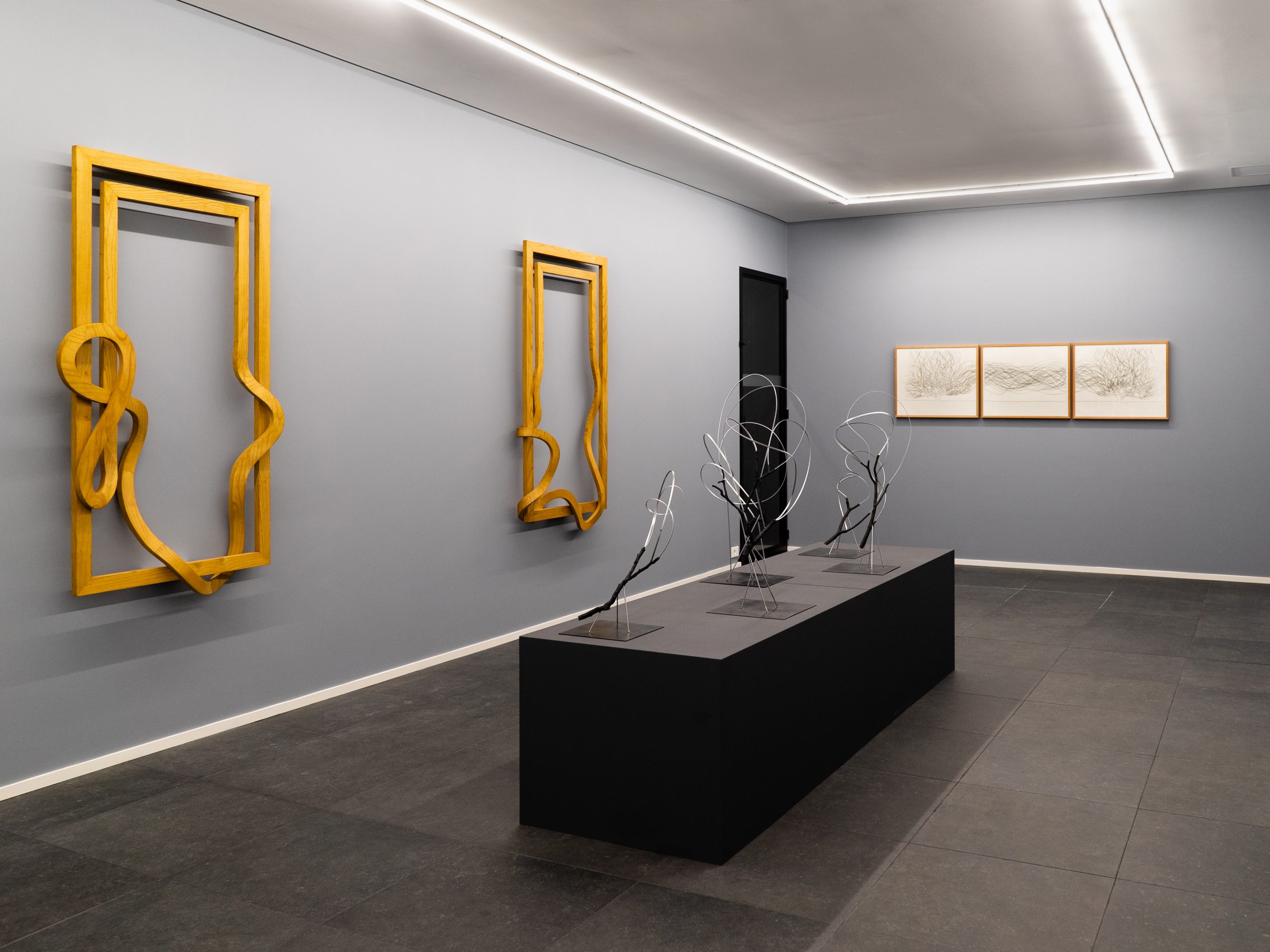 Blending both figurative and abstract elements, these paintings evoke life on a microscopic scale, a life that emerges directly from the pictorial surface, spilling over onto the next sheet, following a movement of growth which also underpins the artist’s sculptural work. Very much like the wood and steel of his sculptures, the Chinese ink of these paintings seems to escape the spatial constraints of the surface, spreading in multiple directions.