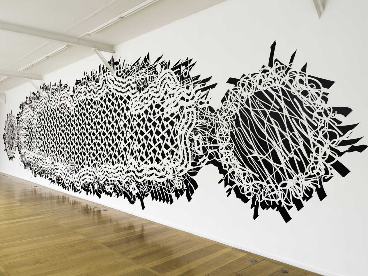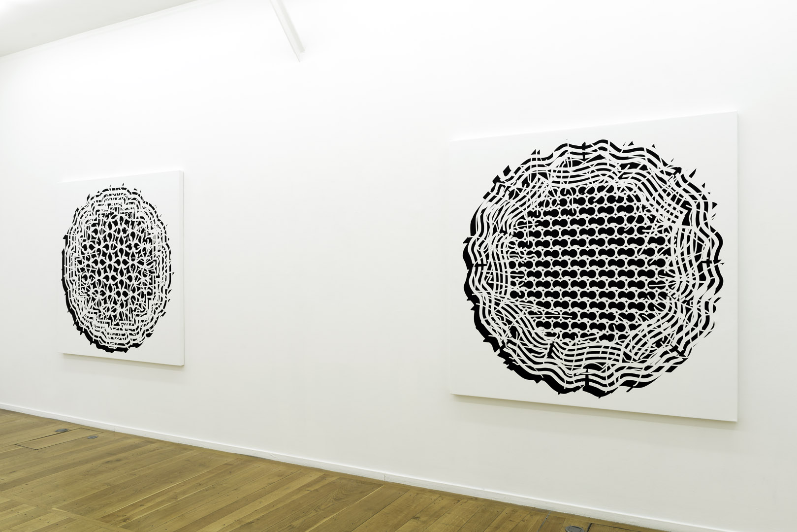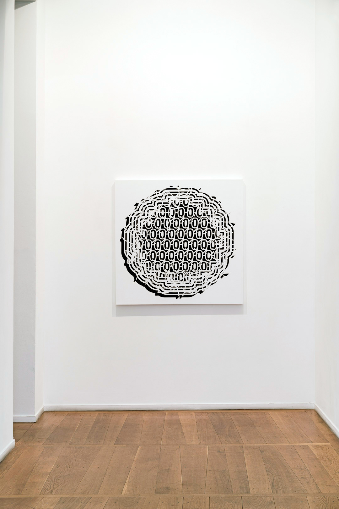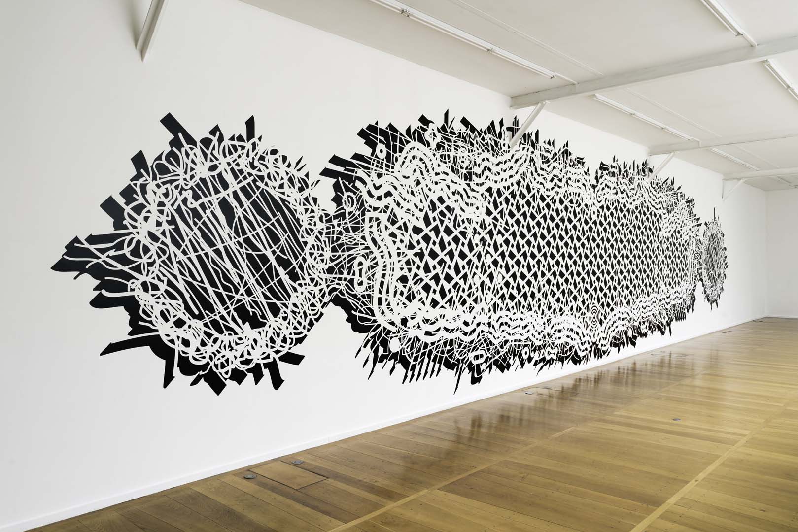 The notion of construction is inherent in the Pablo Siquier’s practice. Using 3D software to create infinite variations on lines and curves, the artist then transposes them onto a canvas or wall. The black line on a white background isn’t the result of an expressive gesture, but instead calculations and algorithms; meanwhile the duotones reference the binary system. The artwork titles themselves are encoded in numbers: the first two correspond to the years of creation and then they follow suit systematically, acting as a kind of inventory list.