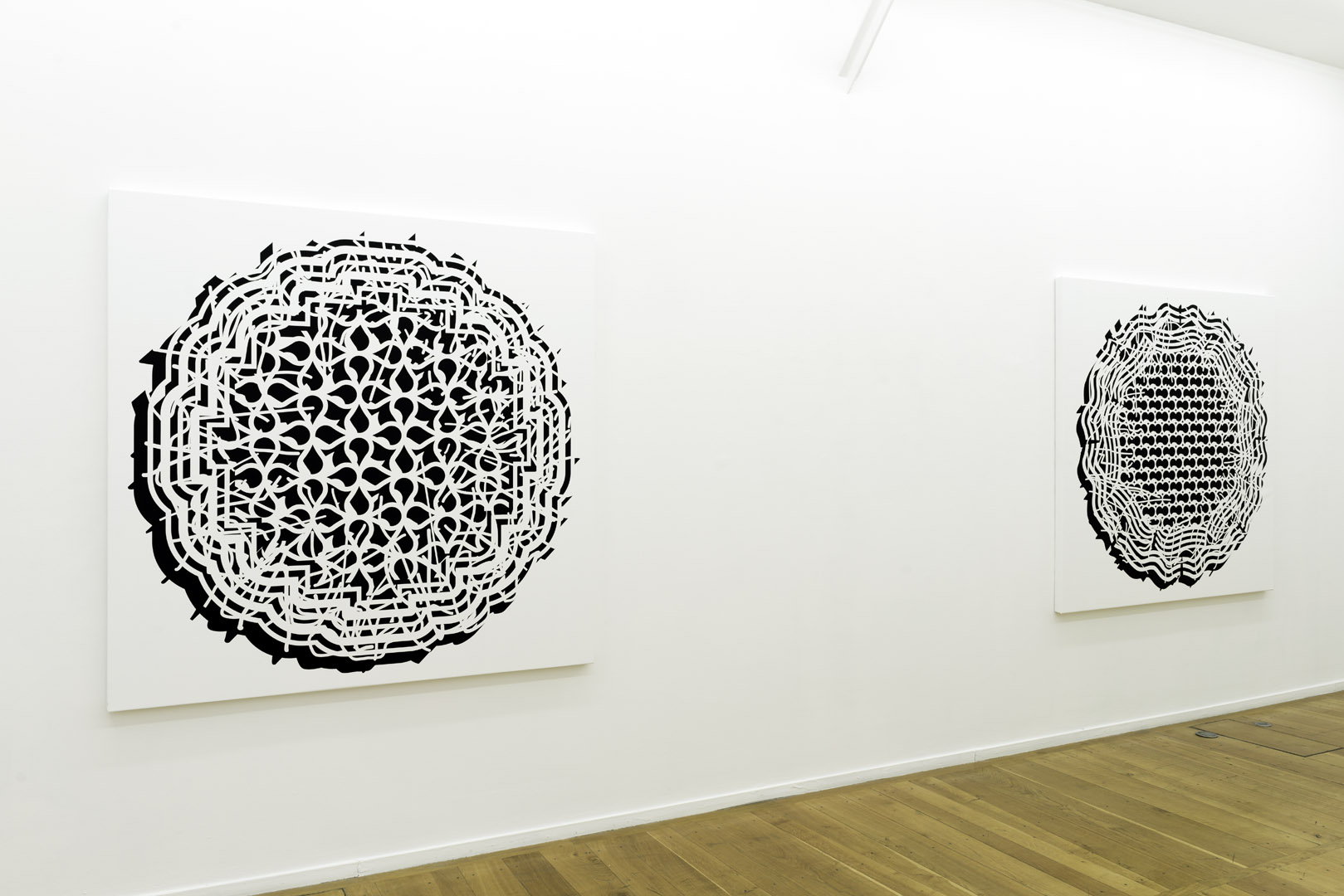 In his new canvases (2017), geometric forms slowly change as they repeat and multiply components (similar to a Mandala) to form ruptured structures somewhere between a systematic and an obsessive approach, between abstraction and pattern. Like Xenakis, who also often worked on the relationship between architecture and space, Pablo Siquier’s work is in situ: he inscribes on gallery and museum walls and creates mural paintings outdoors. His large-scale two-dimensional labyrinth on the gallery’s main wall plays with light and shadow, it creates a feeling of volume that instills a new relationship to the body: he juxtaposes the human figure with structures that dominate and repeat throughout a lifetime.