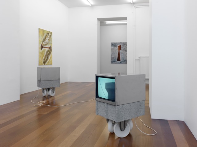 The two Untitled (Chandigarh) (2013) videos, produced in association with Adam Bainbridge and filmed in the manner of a slideshow, reveal an outlook that is similar to a photographer’s. A sequence of pictures alternates between close-up static shots, almost abstract and punctuated with bursts of colour, and slow sweeping images of static landscapes. They paint the portrait of a city where urban disorder is juxtaposed with formally balanced architectural elements that exude an atmosphere of tranquillity. The compact cubic monitors are fixed on supports that the artist has created to form two small minimal and movable totemic sculptures dedicated to Chandigarh.
