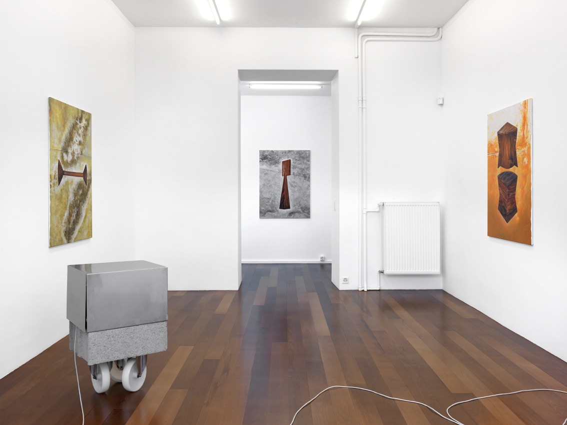 The first of these series, Merci Charles-Edouard (Hinesh Jethwani studio) (2013), establishes the pictorial protocol that she has pursued in 2015 with two new paintings, Main Motive and Bhawan. The three paintings of the original series are each composed of a powerfully geometric form, on the surface of which the wood grain is visible, floating on an atmospheric monochromatic background. The sculptural element, however, remains silent, referring to nothing that can be identified, because here, in a way, the act of appropriation is happening during the production process, as the borrowed element is gradually separated from its source and the original meaning is erased, layer after layer, to the point of abstraction.