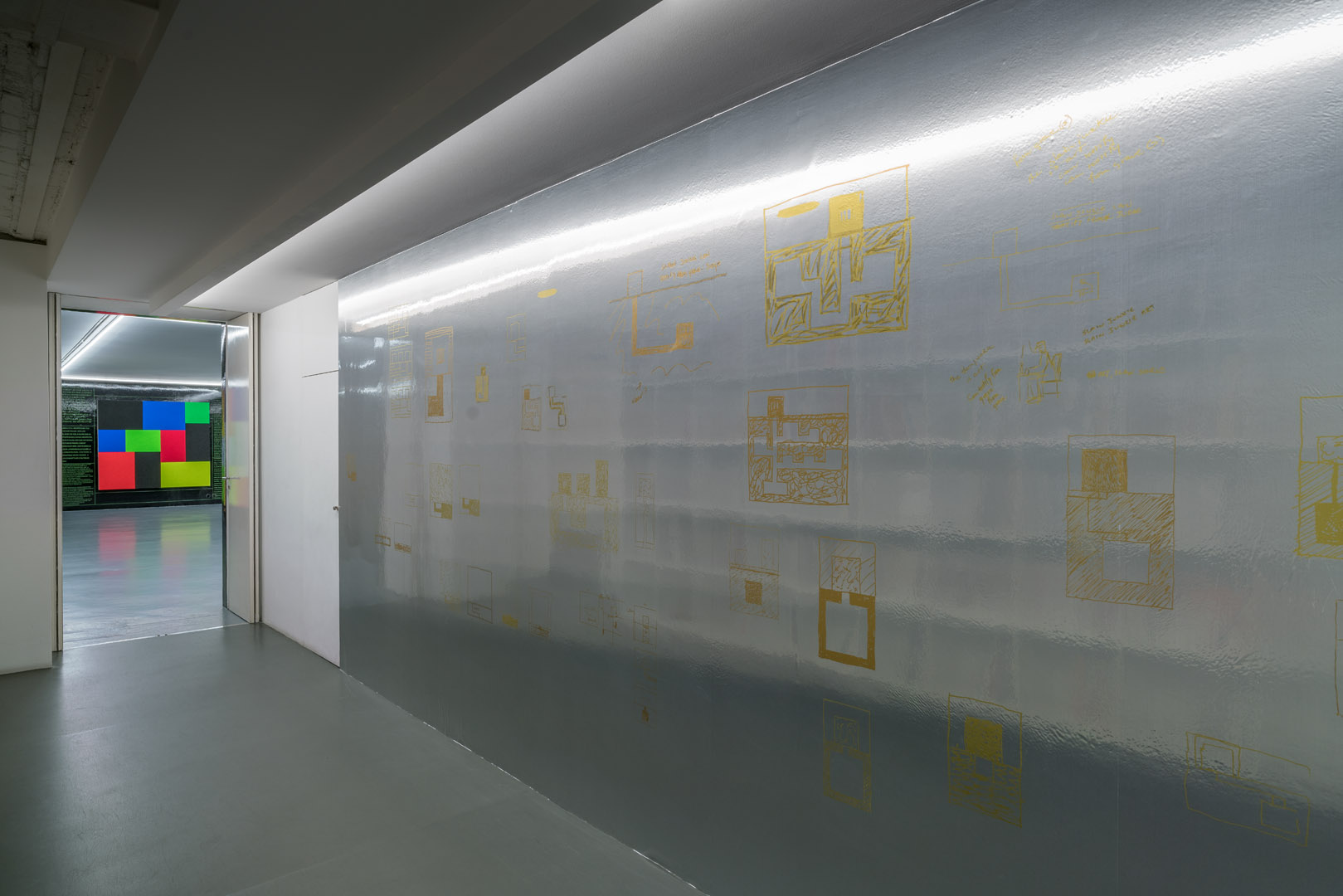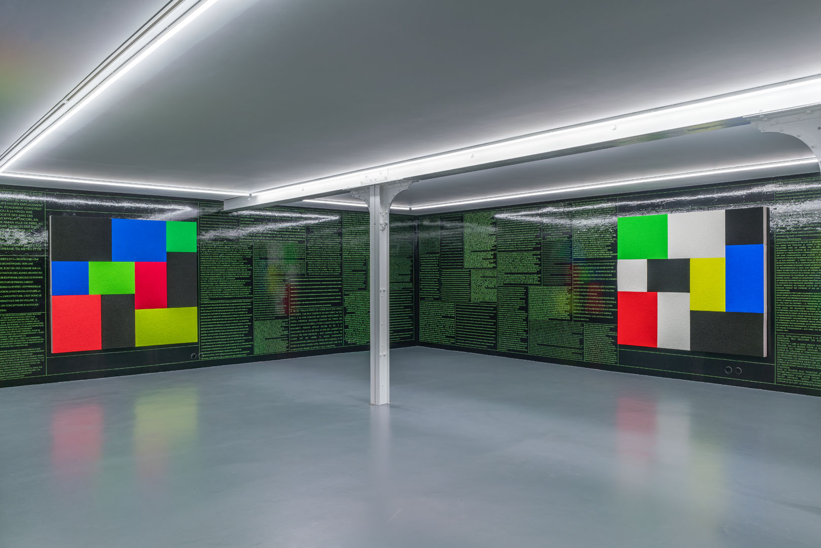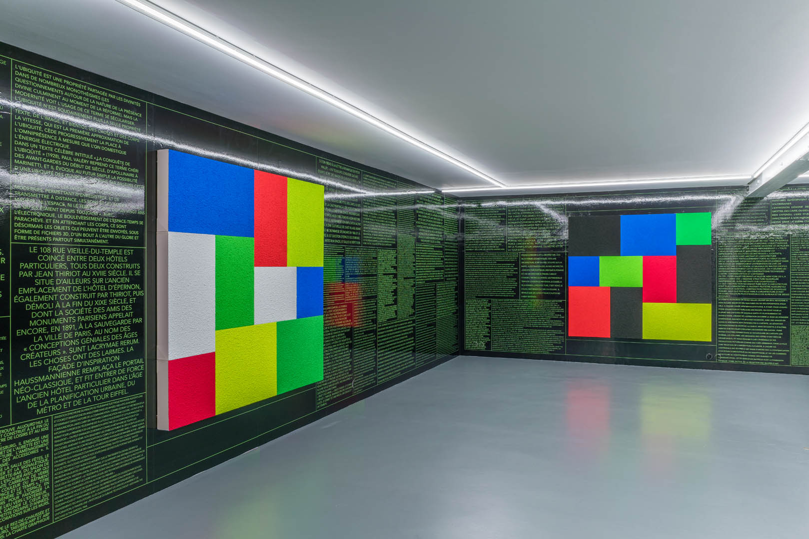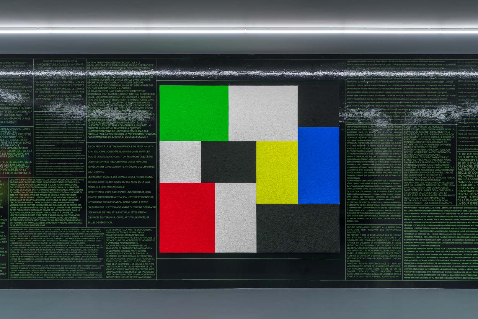 Finally, in the basement, three paintings inspired by neo-plasticism take up compositions already used by the artist, in a version stripped of its usual motifs. The text written by Jill Gasparina, and itself composed of self-contained blocks freely arranged on the wall, goes back over questions which the artist has been developing since the 1980s, in his paintings and his writings: urban planning, the growth of digital technology, the synthetic spaces of video-games and architectural renderings, the links between European and American traditions of abstraction, and between modernism and postmodernism. The space is thereby transformed into an immersive installation.