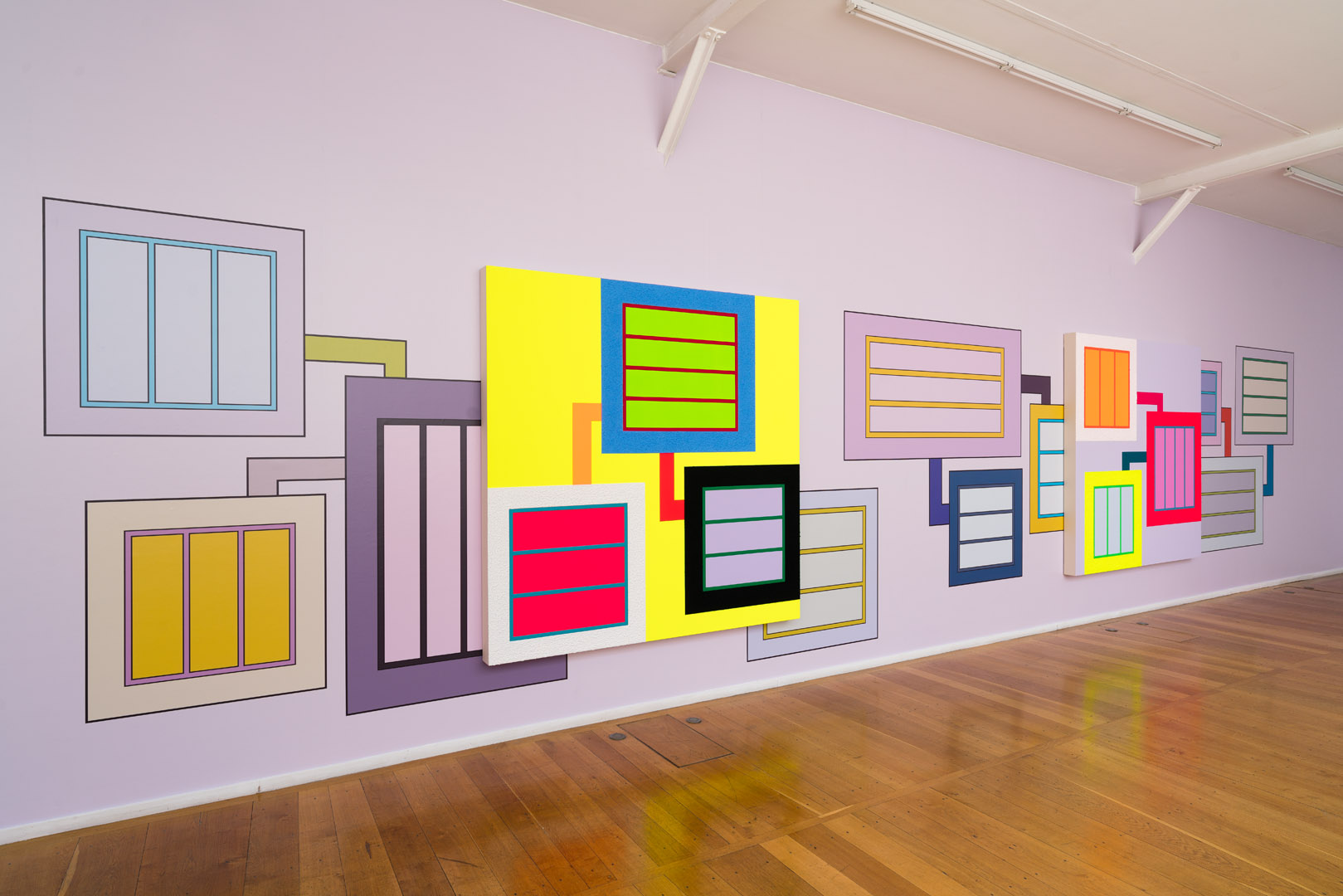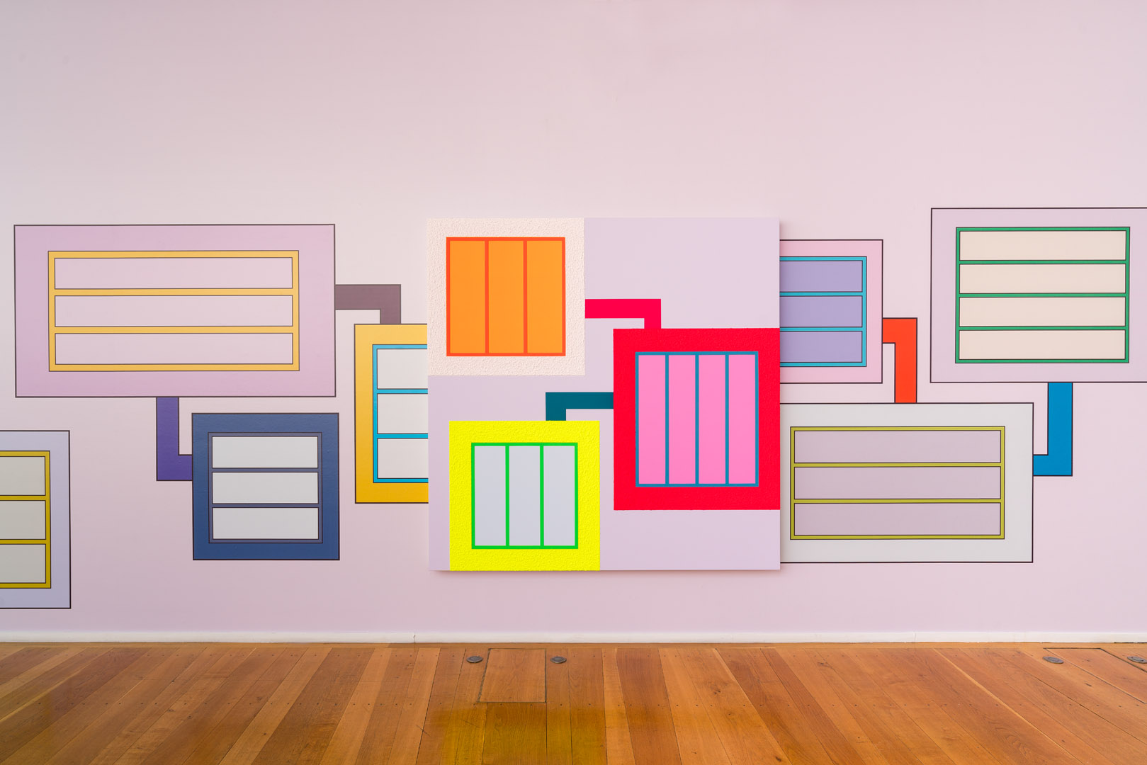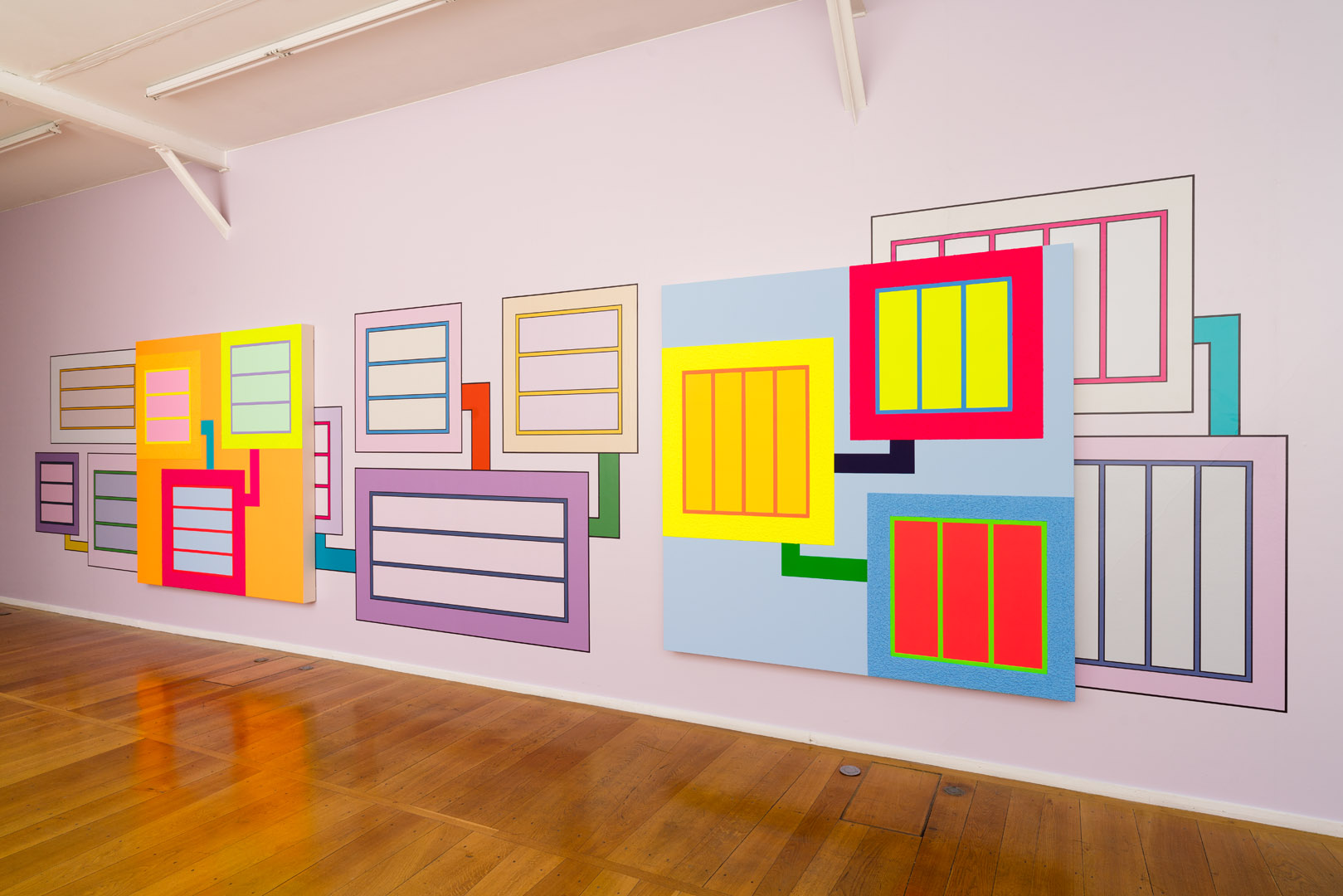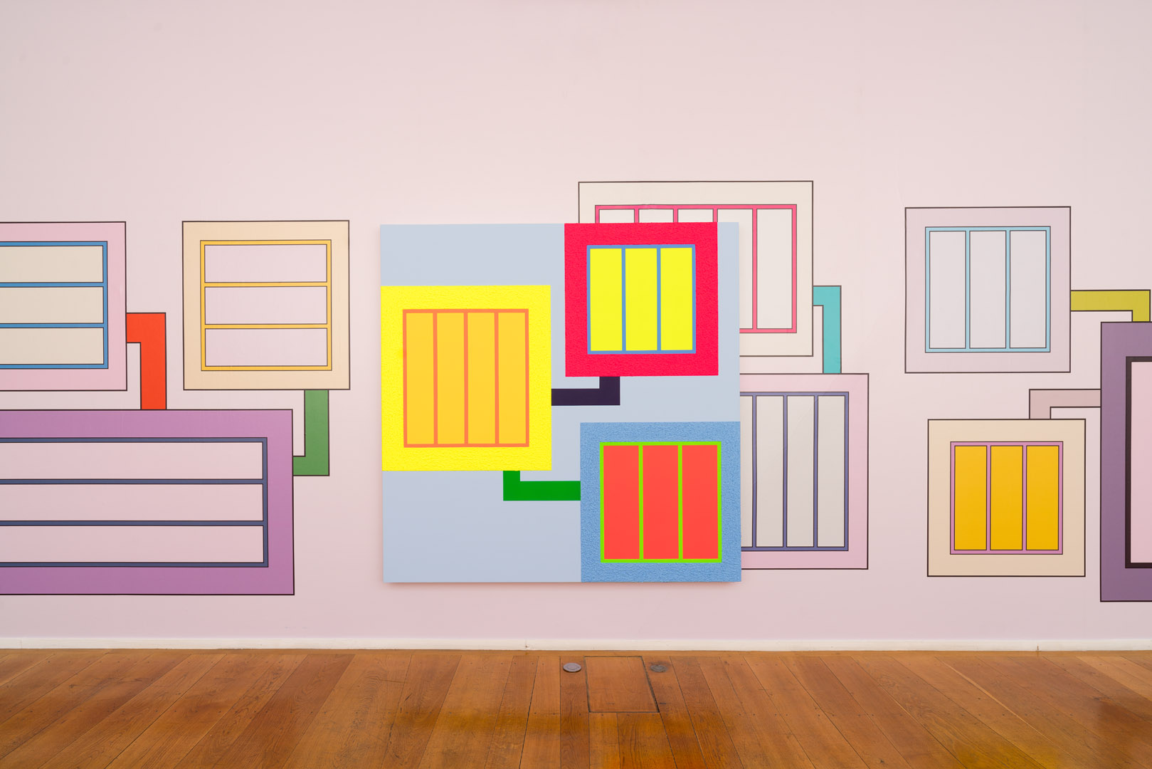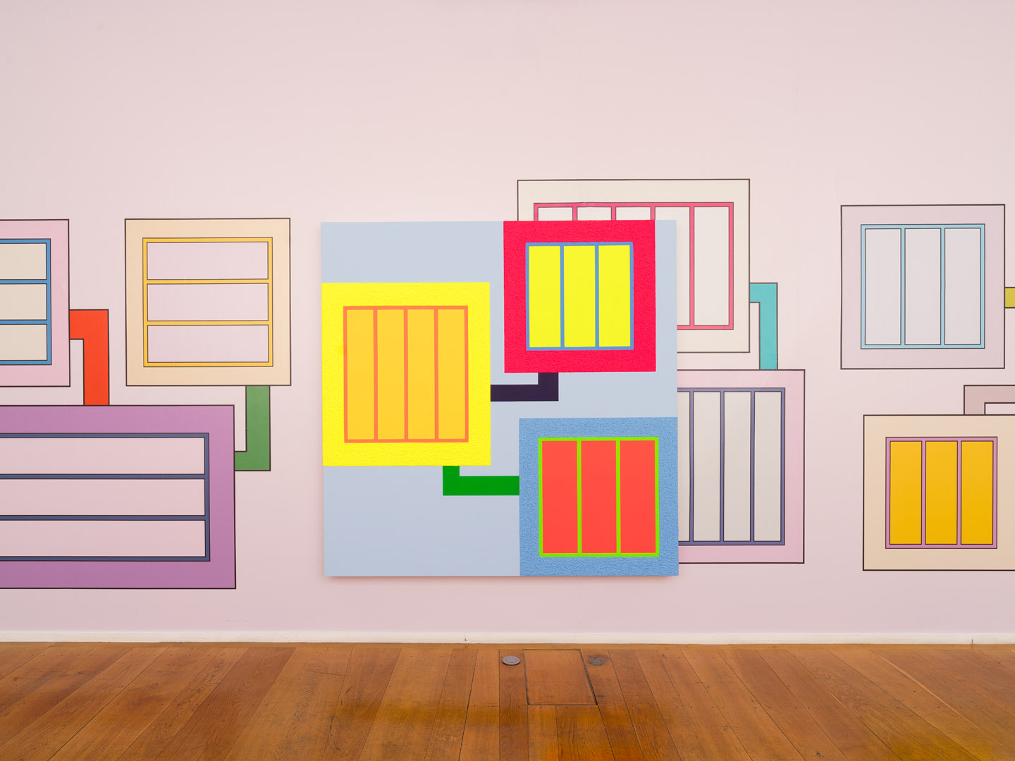 Finally, in the basement, three paintings inspired by neo-plasticism take up compositions already used by the artist, in a version stripped of its usual motifs. The text written by Jill Gasparina, and itself composed of self-contained blocks freely arranged on the wall, goes back over questions which the artist has been developing since the 1980s, in his paintings and his writings: urban planning, the growth of digital technology, the synthetic spaces of video-games and architectural renderings, the links between European and American traditions of abstraction, and between modernism and postmodernism. The space is thereby transformed into an immersive installation.