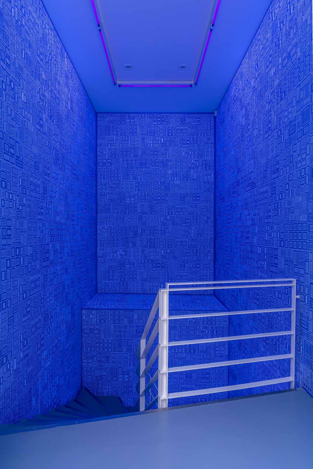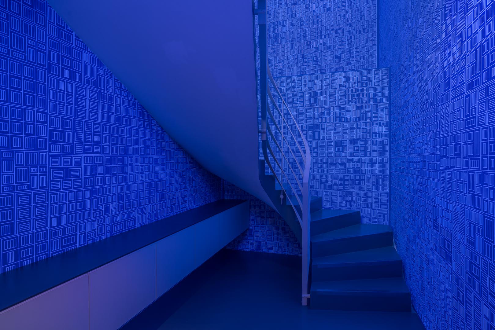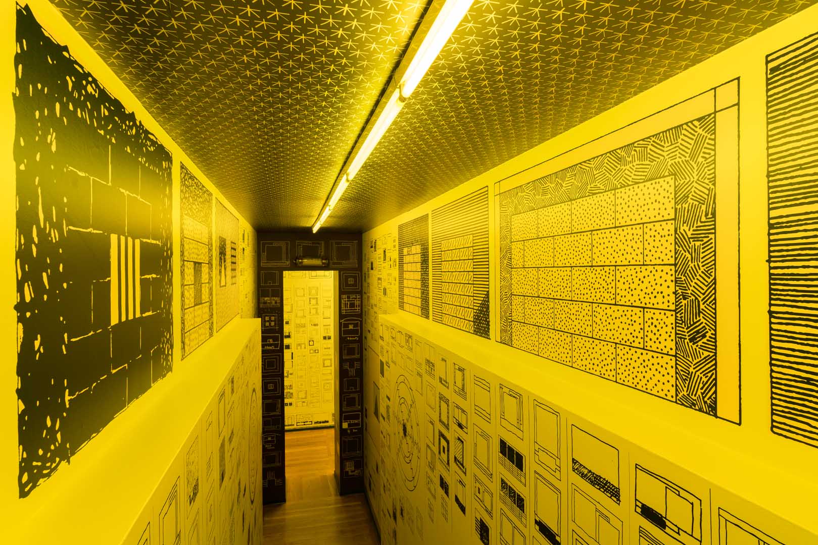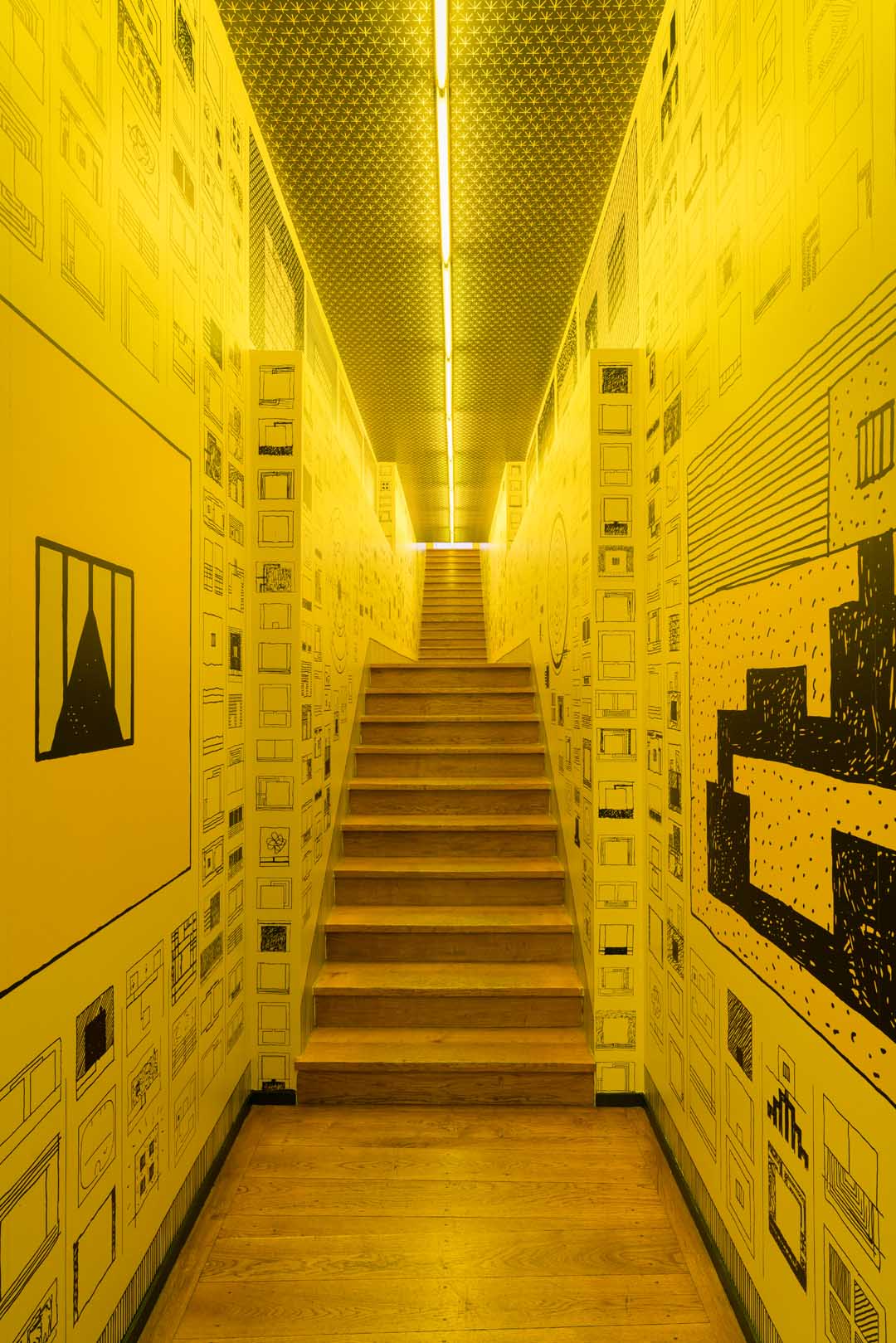 In the stairwell, the entrance, and the corridors, a set of printed drawings highlights the specific architectural features of the gallery, creating effects of thresholds and passages.