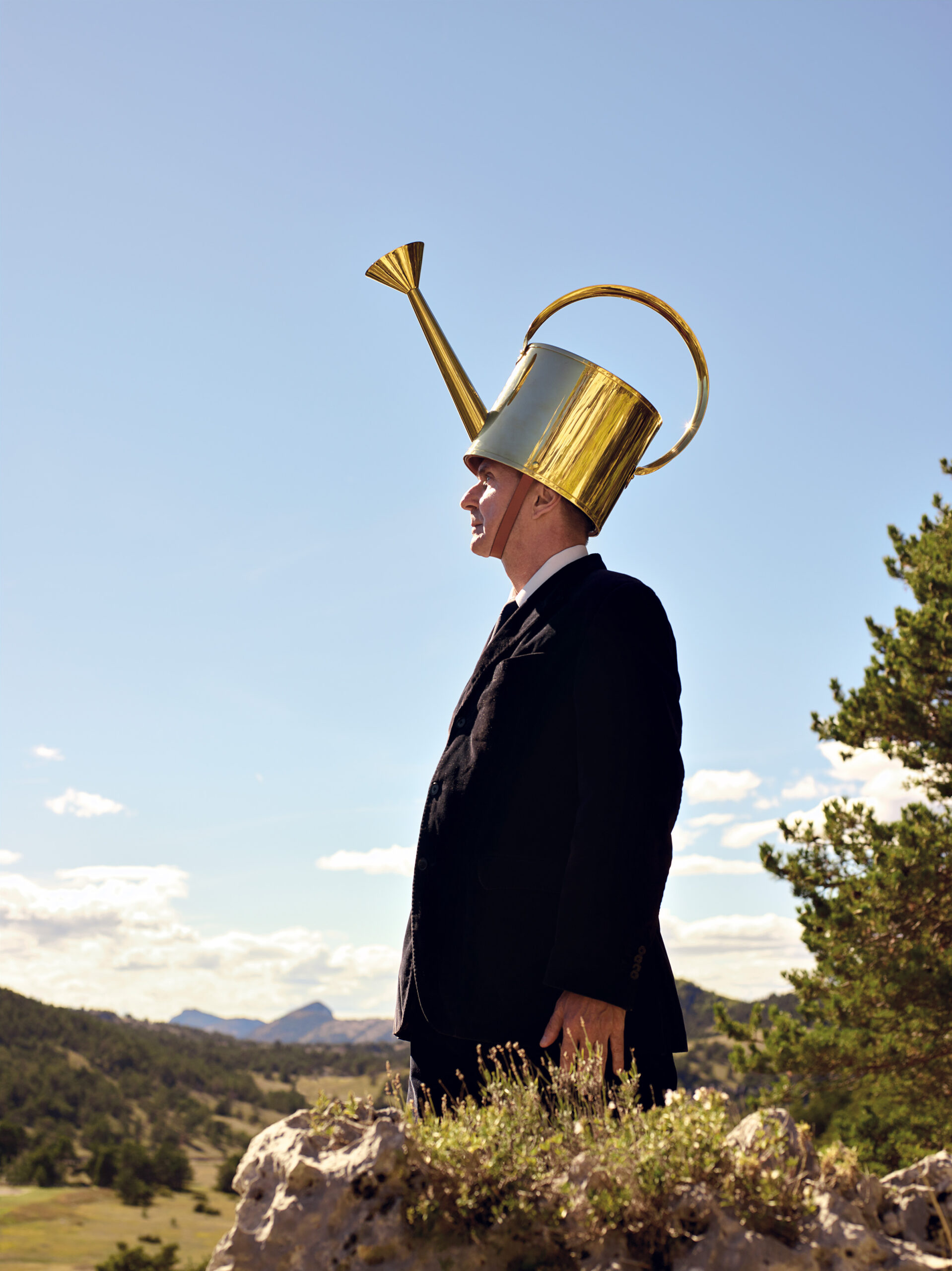 Philippe Ramette poses for the photograph with the watering can perched on his head, and a landscape typical of the south of France in the background. The staging of this photograph, with its protagonist-artist, suggests a possible use for this object-sculpture as a receptacle for ideas, intuitive insights and even divine emanations. The wearing of this object might just permit us to filter the fruit of this gathering, and possibly even come up with an oeuvre ourselves.