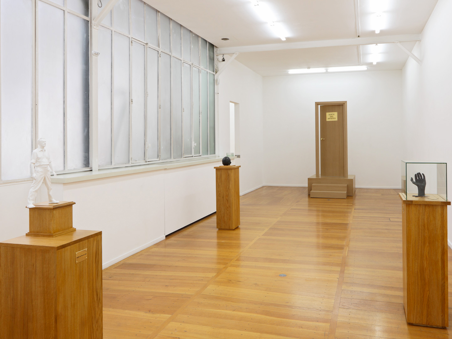 One of the principal pieces, La sortie des artistes (Stage Exit), stimulates a reflection on the artist’s function, the artist as entrepreneur of a service and product. A platform with a door leading nowhere, the work invites the spectator to physically experience an artist’s path, by obliging him/her to double back. As is often the case for Ramette, the word game and the play between the title and artwork allows for a second interpretation or even a third. Thus deception can be transformed into a ray of optimism.