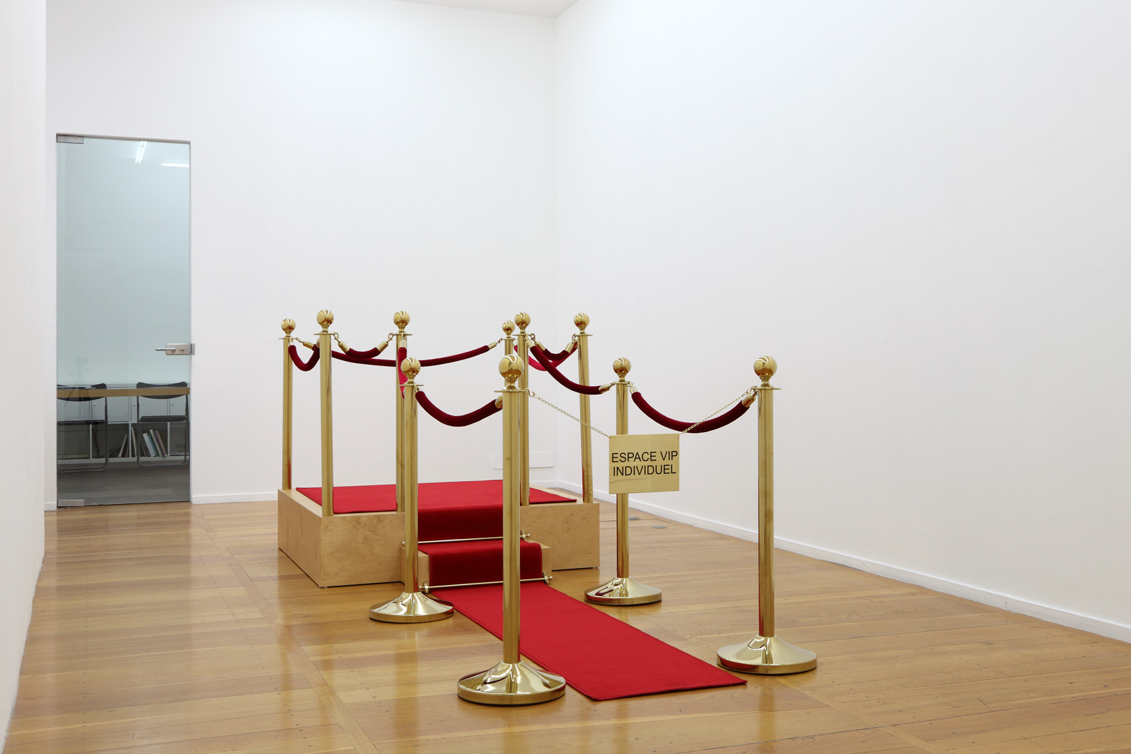 Through the Espace VIP individuel (Personal VIP Space), the artist distorts the elitist mindset and suggests that “potential users” isolate themselves in a fit of self-celebration. These reflections on the current social context, on the “bling-bling” world, is part of his quasi Kafkaian political approach that is always present in his work. In the same Prothèse à geste (la main tendue) (Gestural Prostheses ‘The Outstretched Hand’) makes a reference to Prothèse à dignité (Dignity Prostheses)/ Prothèse à humilité (Humility Prostheses) (1992), a sort of re-educational device that invites the spectator to extend a hand to another person in a gesture of social openness and to counteract the often gritty humor.