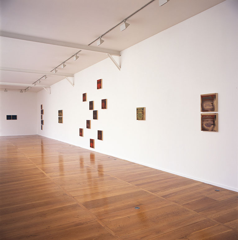 Deux textures de peinture sont utilisées. Une première, issue d’un mélange de pigments et de liants «cuisinés» à la limite de l’incompatibilité chimique, est étalée sur le support à l’aide d’une spatule. Puis une seconde, choisie pour ses qualités de brillance faisant contraste avec la précédente, est vaporisée au moyen d’un pistolet. Chaque panneau sera ainsi travaillé par superposition de couches et soustraction de matières, selon un geste d’effleurement dirigé par une même volonté visant à respecter les spécificités de l’outil que la main de l’artiste manipule.