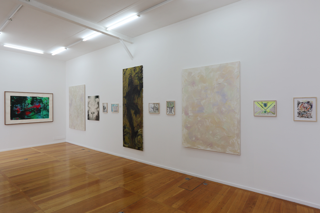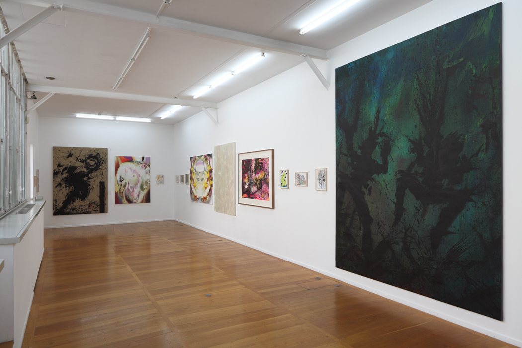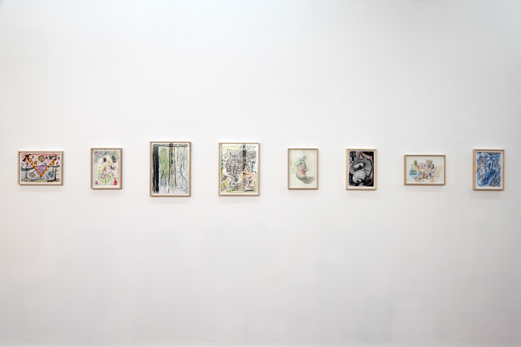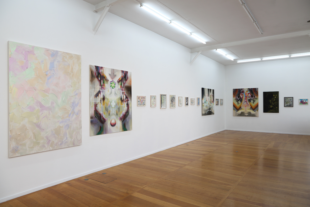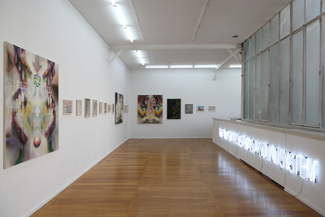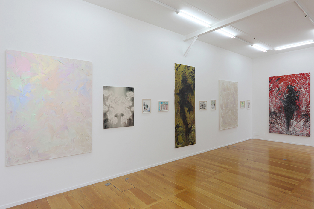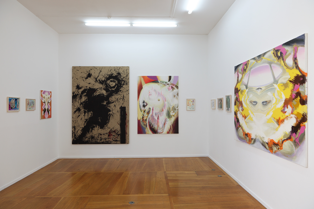 It is the clash and intensity of distortion that seems to unite these works: Hayan Kam Nakache’s drawings amplify the loquacious world of comic books; Sylvie Fleury’s paper artworks shatter chromatic scales in an almost hypnotic manner and are accompanied by the captivating iconography of Andreas Dobler’s paintings; meanwhile the ostensible tranquility of Stéphane Kropf’s monochromes are torn apart by their pigments’ iridescent effects.