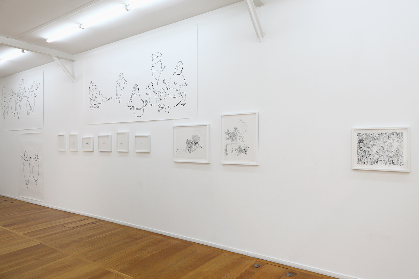 In his drawings, Nietzsche, Kafka, Beckett, Carroll, and Marx, flitter past, as do prisoners, religious leaders, reproductions of artworks, and hospitals. Lanzarini mixes these references and weaves them into an ensemble that reflects the inner workings of mankind’s history and philosophical thought where categories and classifications result only from posteriori reflection. There are no descriptions of time and space: places are unidentifiable and time is anachronistic. With meticulousness and precision, these characters multiply and take their places as they literally invade the walls of the gallery in an exuberant construction.
