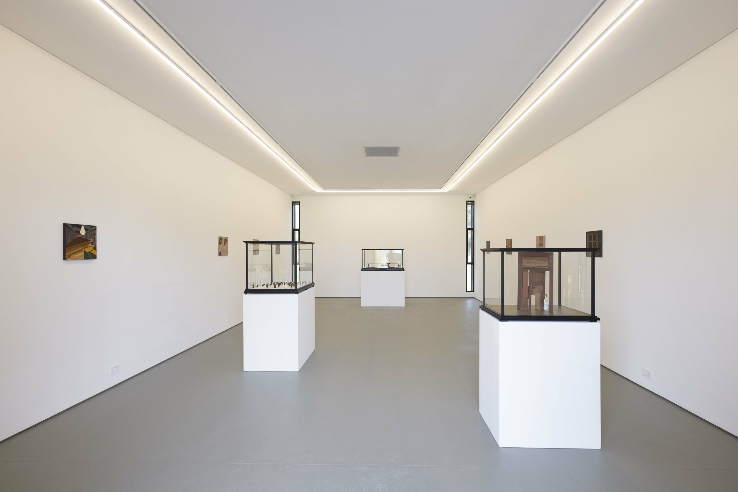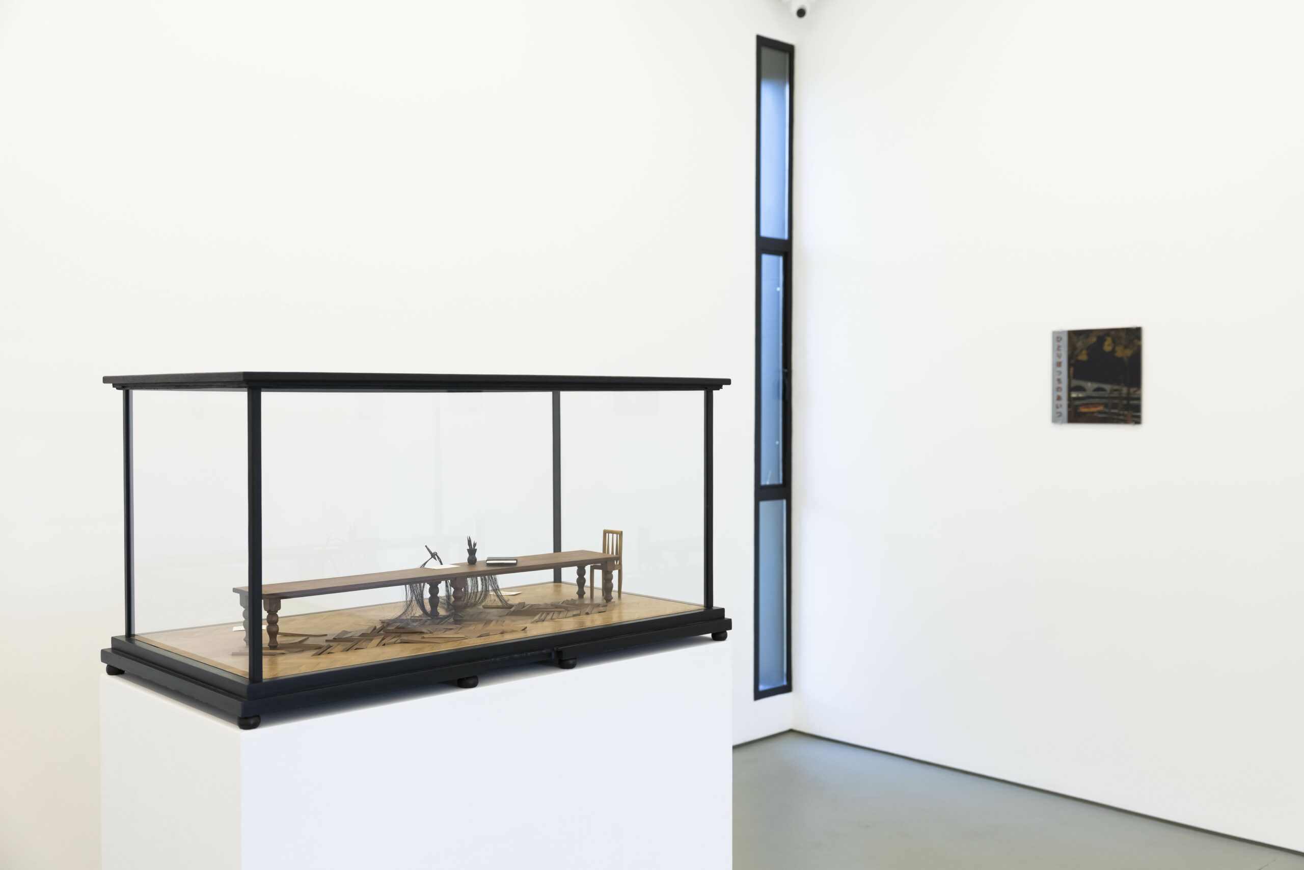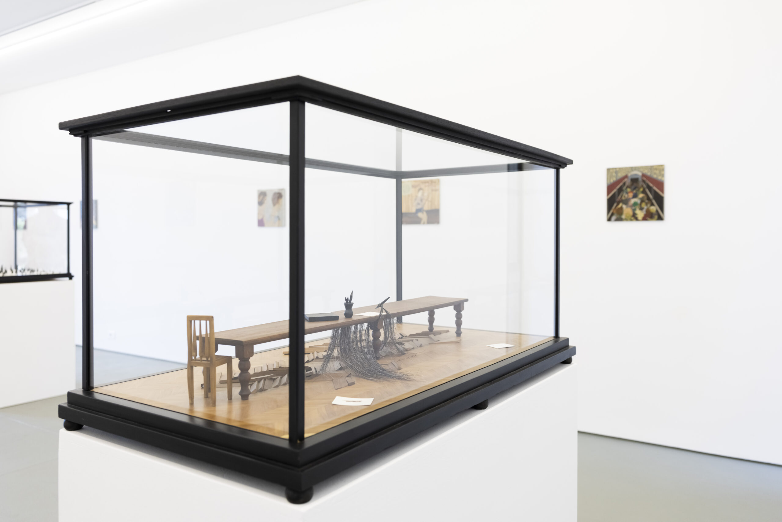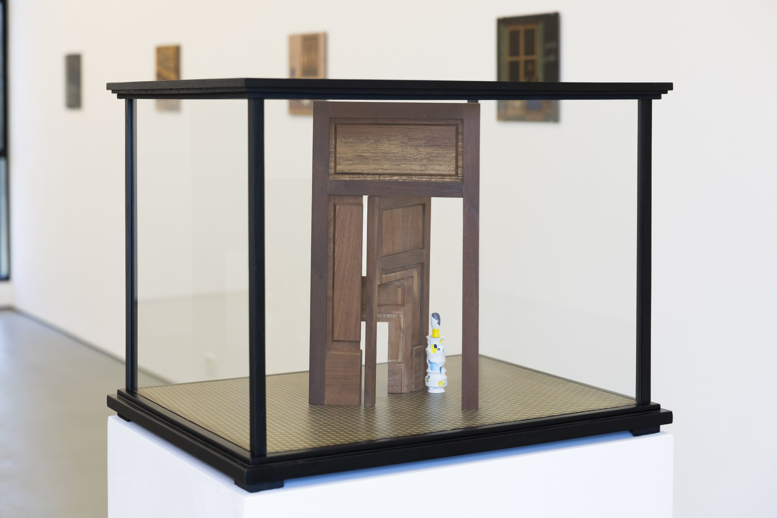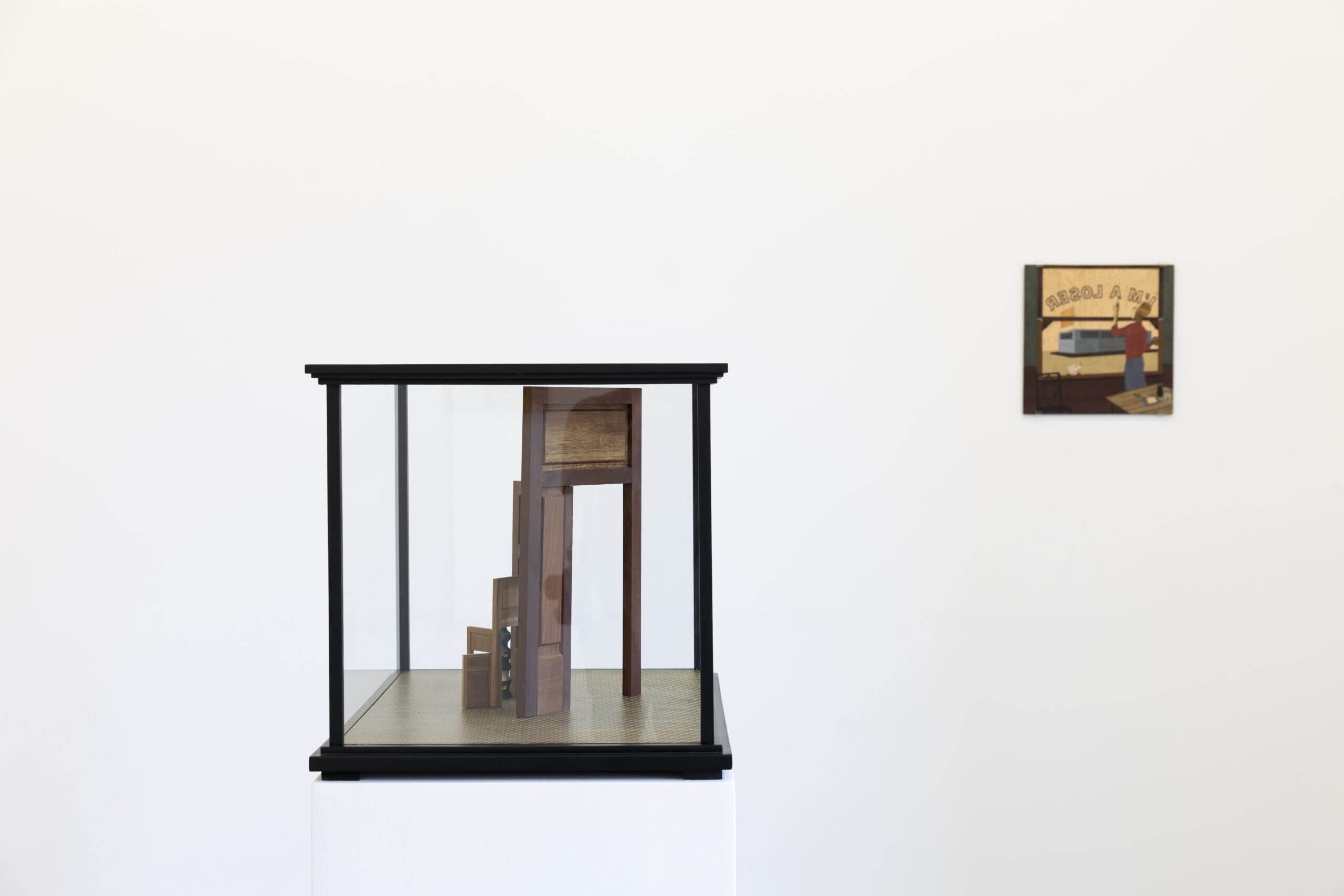 His work over the past decade unfolds across two interrelated media. On the one hand, sculptures that occupy space as hybrid objects, evoking the tradition of dioramas and the plasticity of theatrical models and cabinets of curiosities. On the other, flat works that represent book or magazine covers, in which the artist employs a complex marquetry technique. This technique produces a distinctive aesthetic, defined by a range of colors and textures associated with the world of wood, which in turn, through its warmth, projects an imprecise sense of time.
