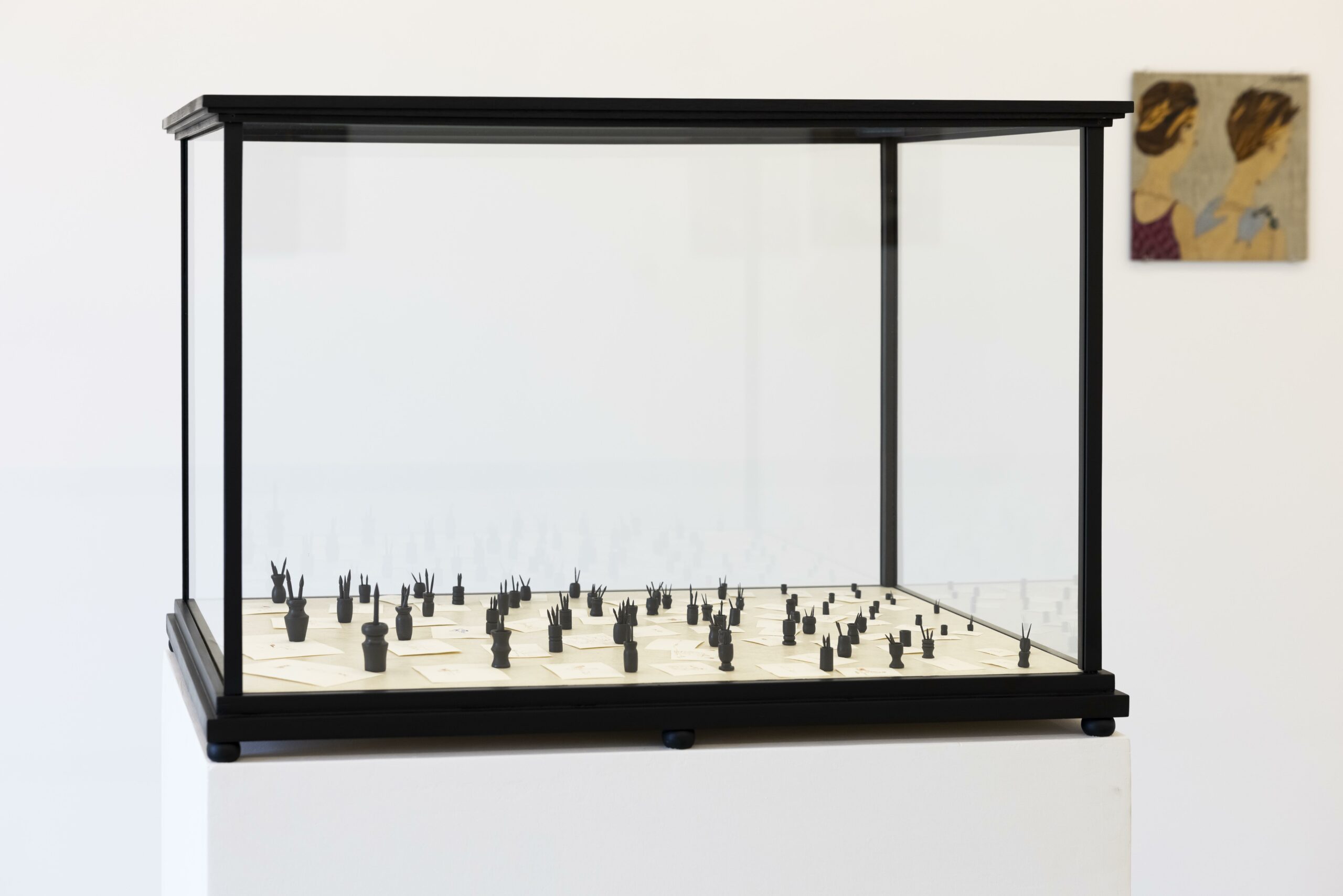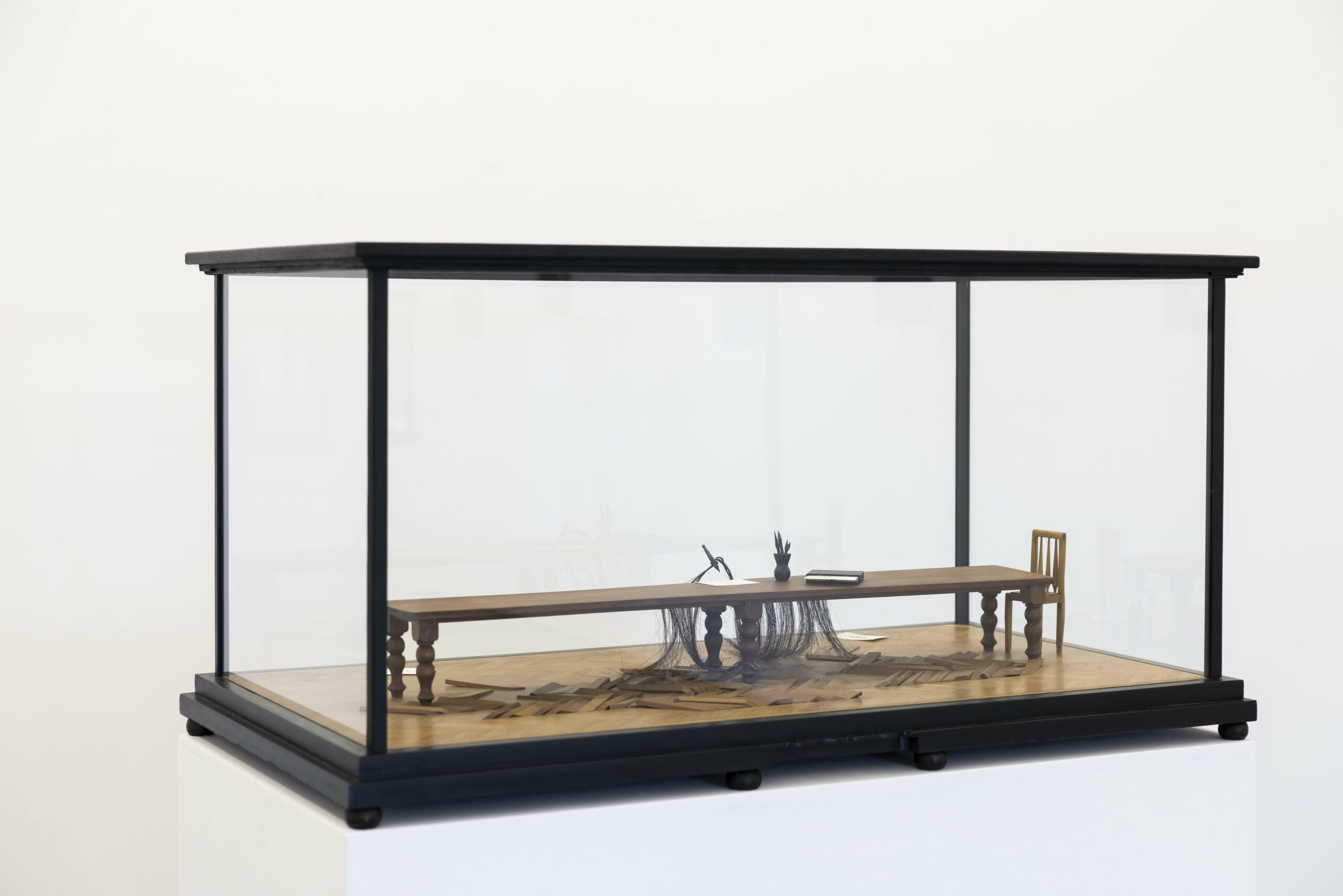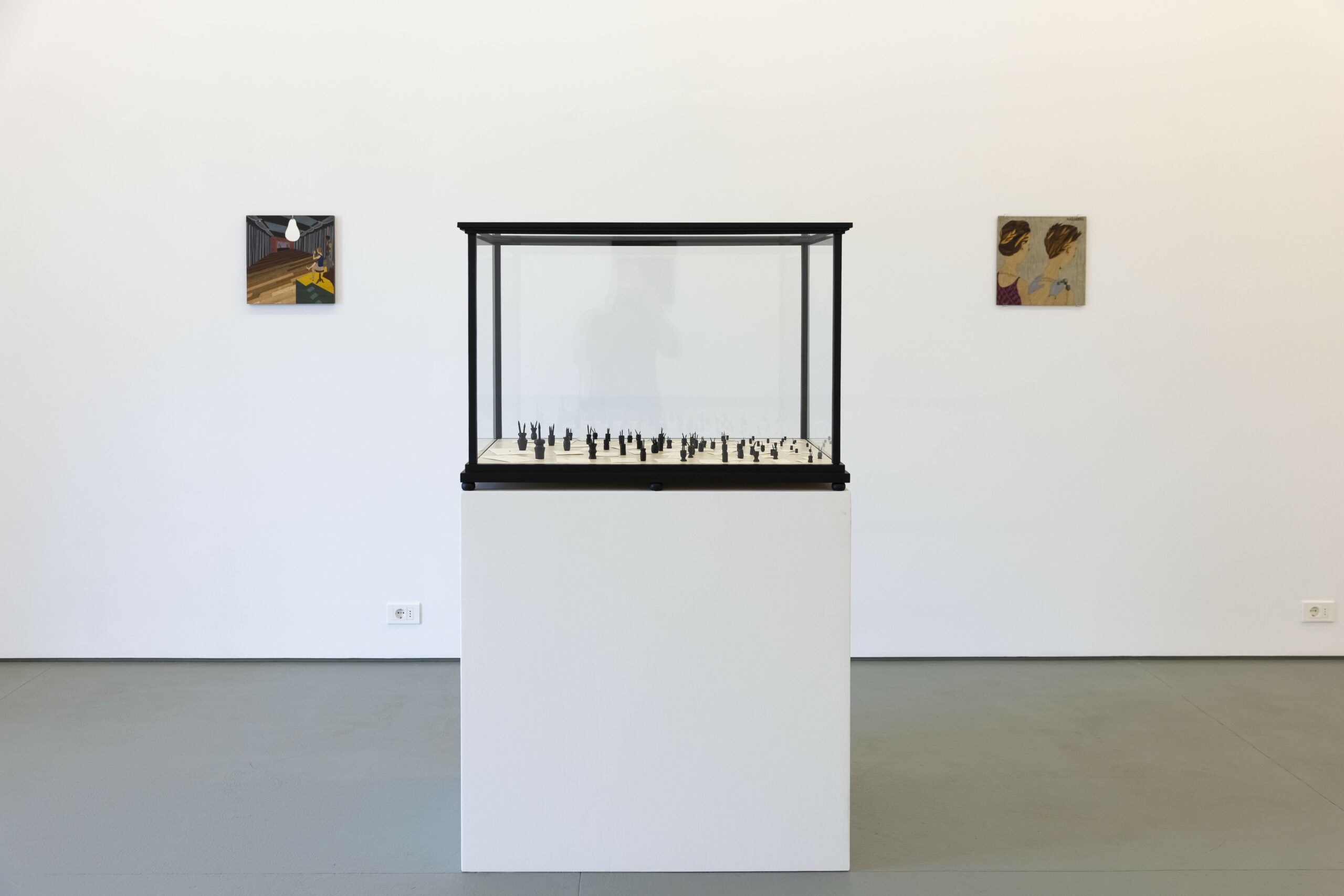 In the sculptures featured in this exhibition, we can observe elements that convey the sensation of a past event, as in Mi eco, mi sombra y yo (My Echo, My Shadow and I), where small drawings evoke summer vacations. Or, alternatively, an action frozen in time, as in a kind of three-dimensional photograph, in El porfolio (The Portfolio). Both sculptures are connected through the staging of the act of drawing, a fundamental practice in Gordín’s work.
