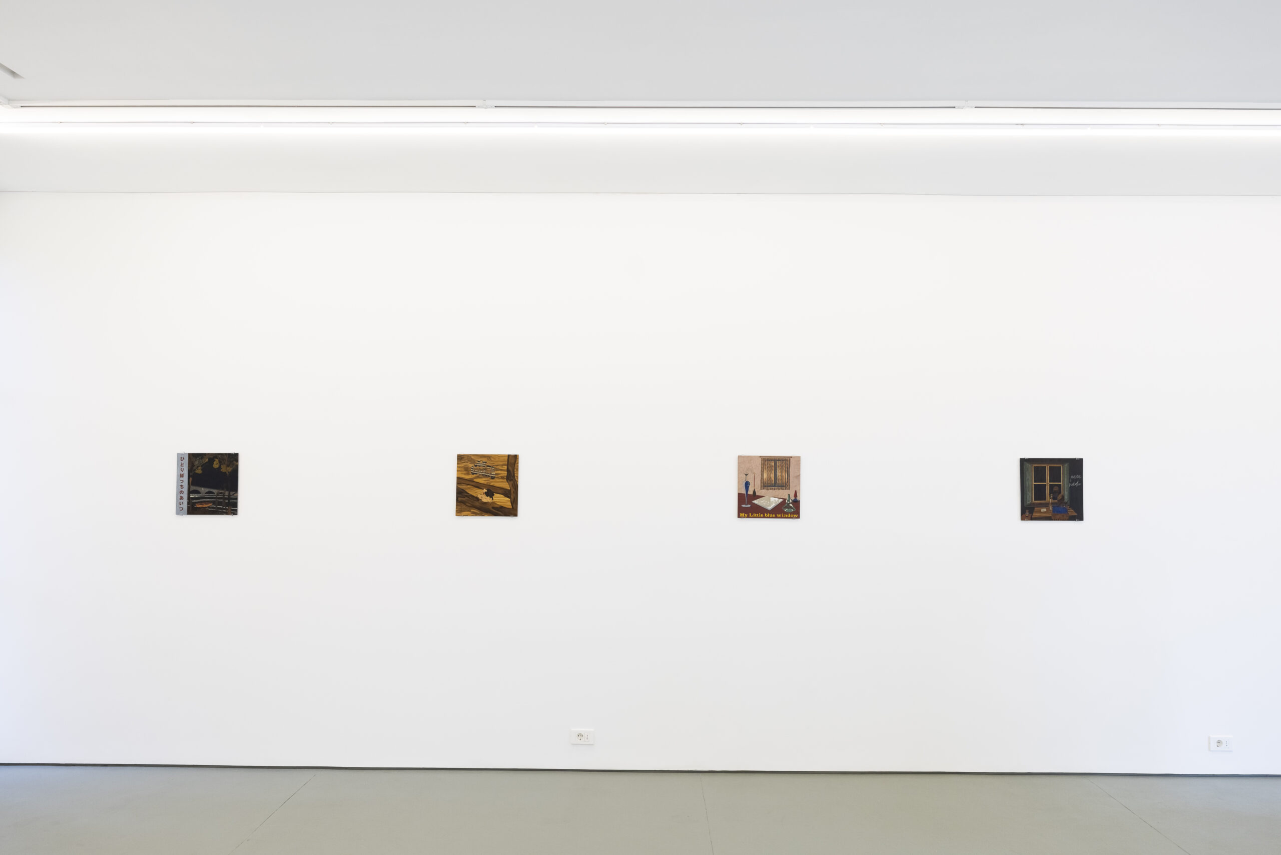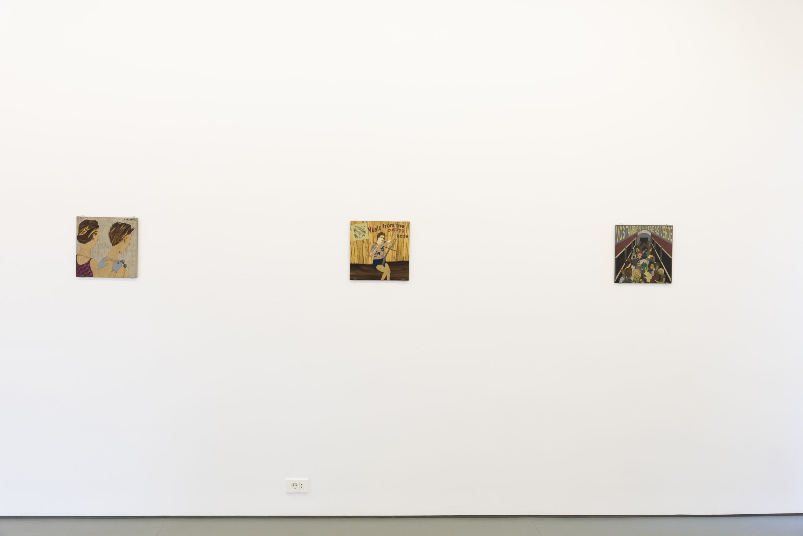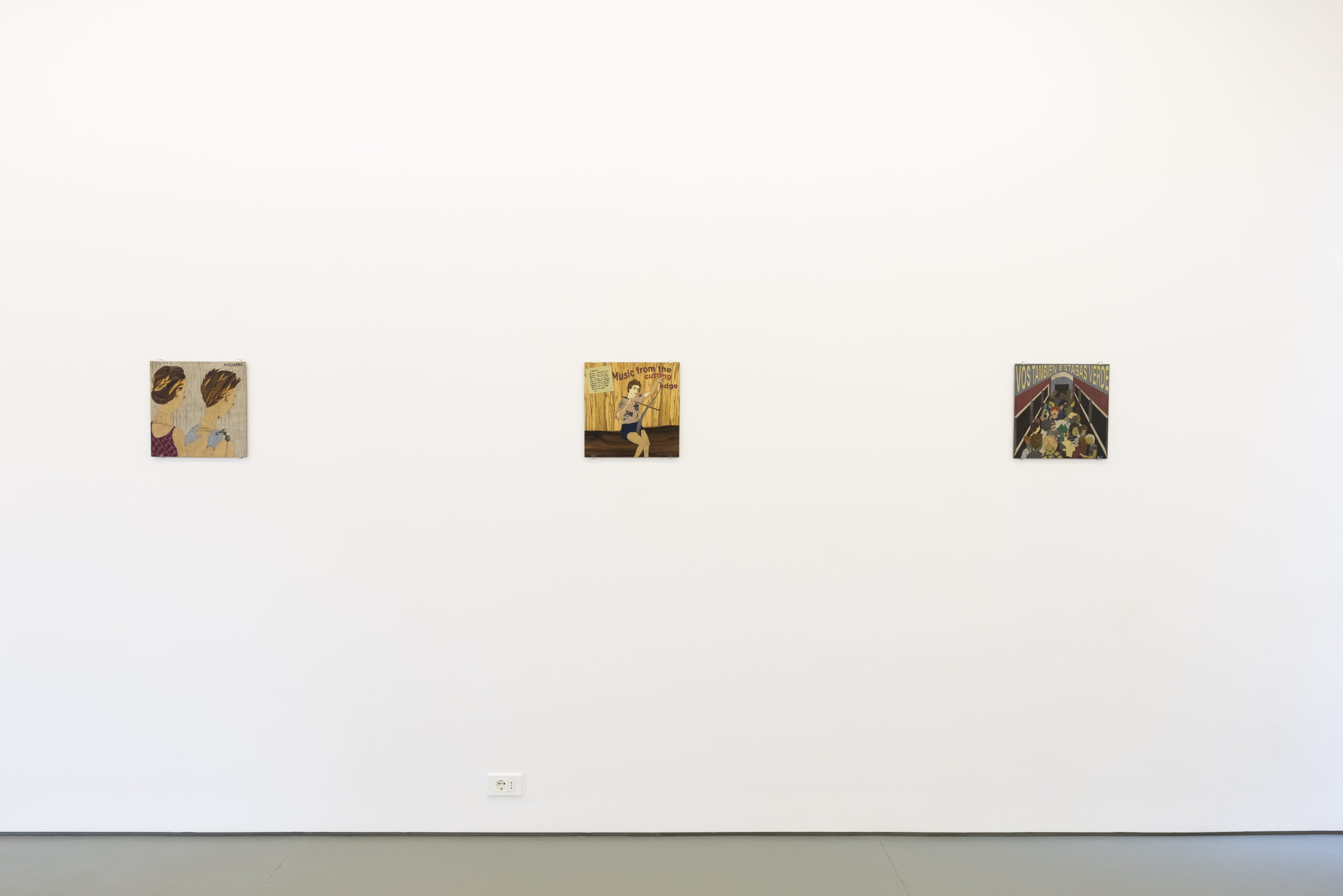 The artist presents a small anthology of works created between 2023 and 2025, consisting of three sculptures and a series of flat marquetry pieces that subtly evoke vinyl record covers.