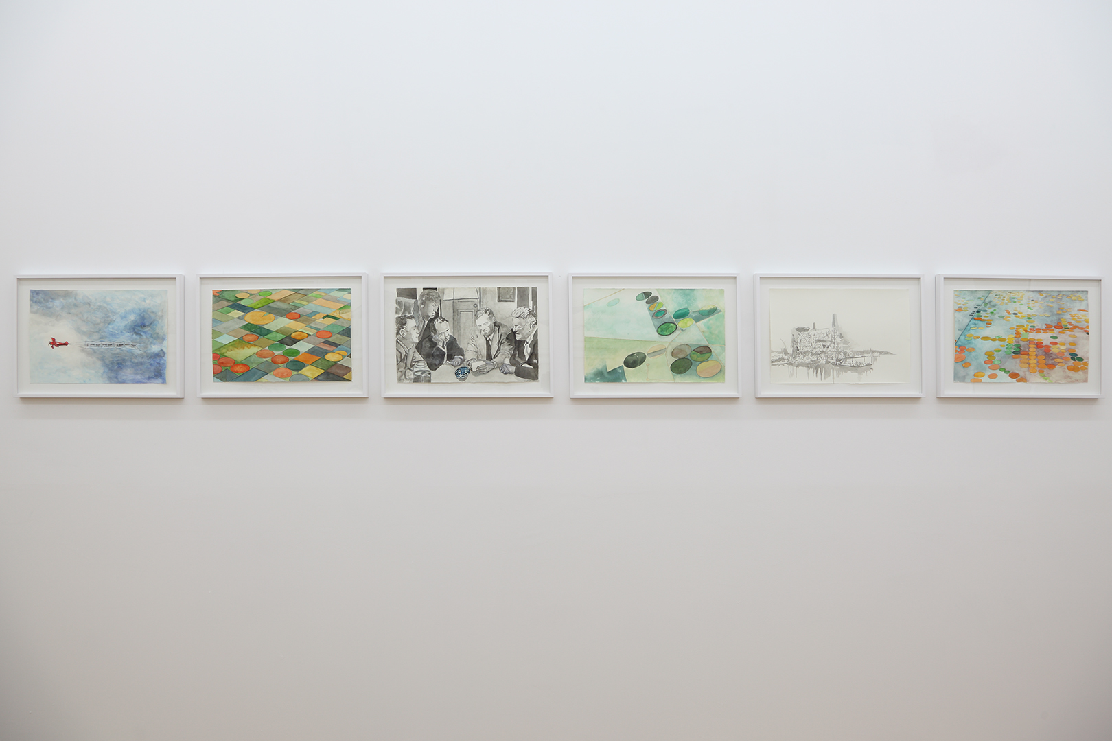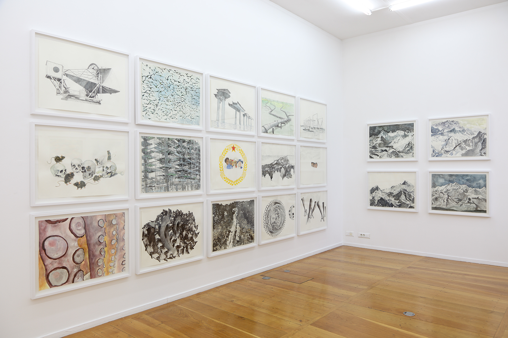 This recipiant object evades complete comprehension and interacts with the drawings as if they were close-ups or entry points. The majority of these watercolors were inspired from photographs taken by the artist or images selected from the media. They consist of arial views of rural landscapes, close-ups of beehives, images of contemporary buildings, pipelines, and even structures archiving technological evolutions. They function as figures and grids of mankind’s communicational and organizational systems of all the people and things that form our planet. A sort of impossible inventory that questions each individual position in the vast intangible group. The project proves to be poignantly pertinent in today’s globalized world where the economy, like information, is govern on a global level. This contempoary world depersonalizes the system, portraying it as a fictional entity, completely uncontrolable and unattainable. Sigismond de Vajay’s work treats the byproduct of this abstract and monsterous machine: numbers. They appear in the quanity of figures that make up a certain drawing or his serial approach to production.