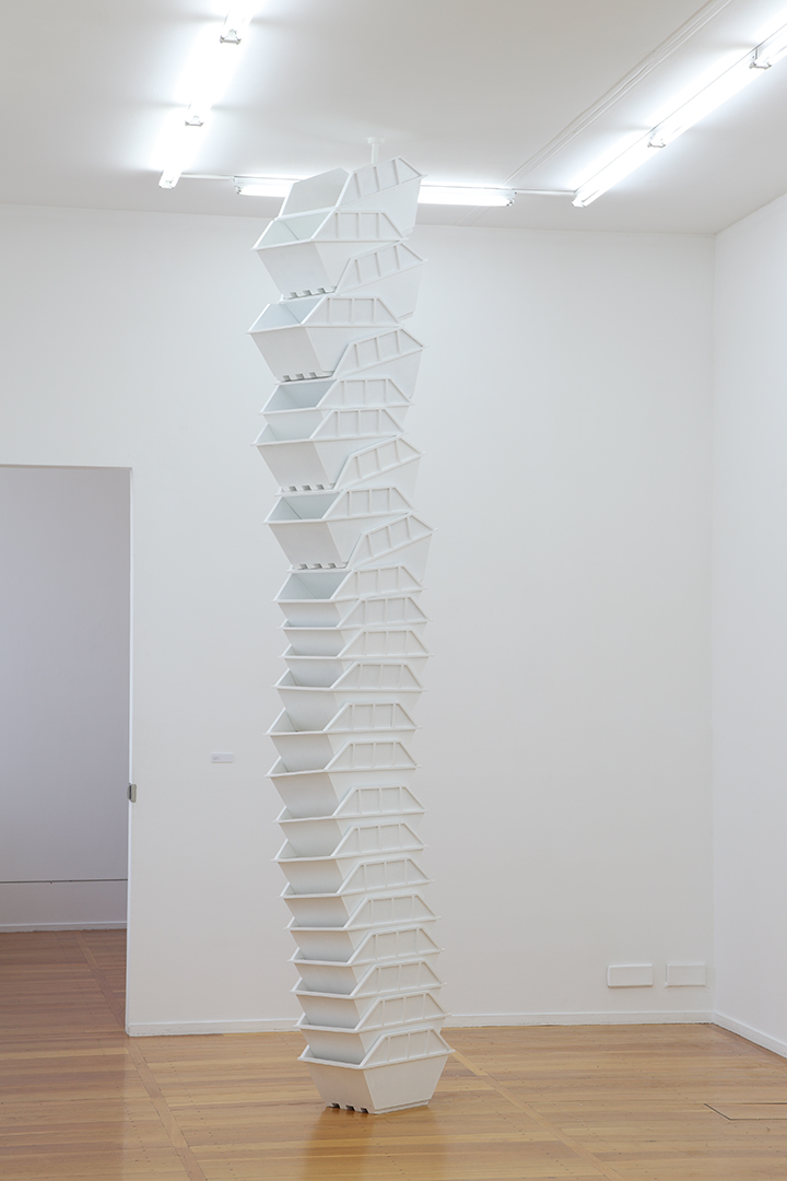 Creating a disenchanted gaze, the artworks’ subjects endlessly vasillate between the human form and machine, between the individual and the mass, in an uncertain and destablalizing movement. All the productions of this protean artist, curator, and editor, have a distopian aestetic in common. In Sigismond de Vajay’s artworks, beauty stems from our decadence and allows us to question the very notion of modernist progress. “Axis Mundi” is a sculpture fromed from rubbish bins which interlock in order to vertically unfold in the space like a fragile guardian precariously balancing on his feet. Through humor and mockery and the most efficent use of symbolism, the artist employs one of the pricipal tools of modernist invention that deligates our contemporary society to a state of ruin.