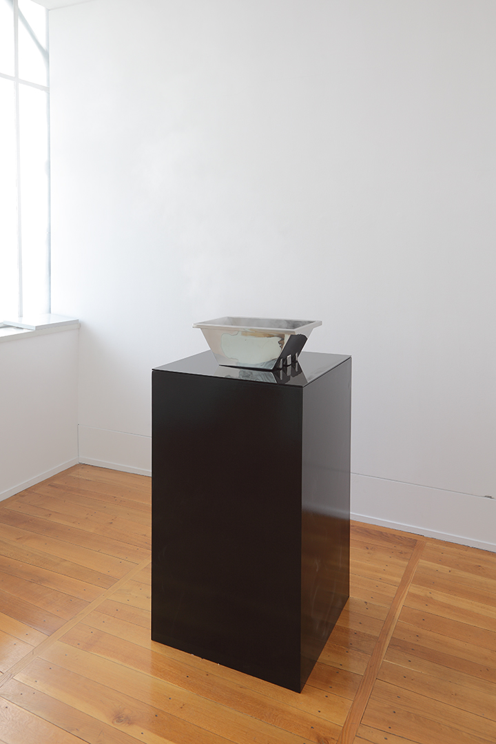 Opaque, somber, and intriging, “La légerté de la matière” acts as a central piece: we see a black, shiny rectangle as tall as a man with smoke enclosed inside it. It functions as a a mirror, a metaphor for our world, and a contemporary allegory of the platonic cave. The carefully crafted object’s glimmering image gently confronts the dissolution of the intangible contents, creating a game of contradictions. On its pedestal, we see a bin of rubble – a universal element that evokes.